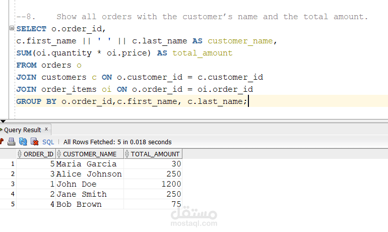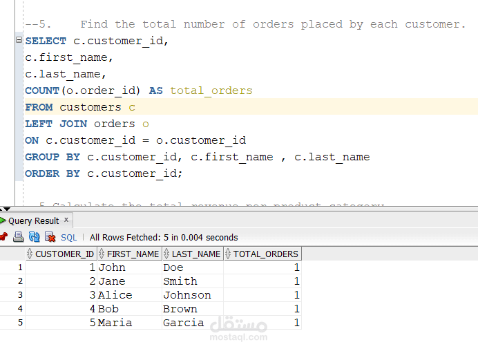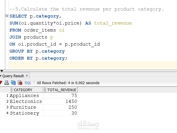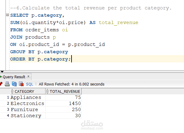 Advanced Analytics: Authored complex queries utilizing multi-table Joins and Aggregation to calculate total revenue per category and average order amounts.