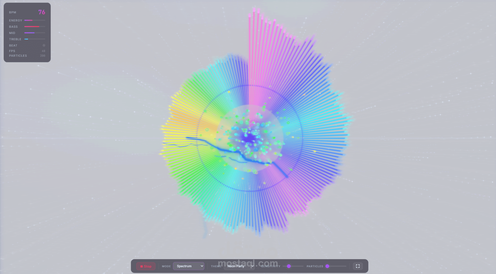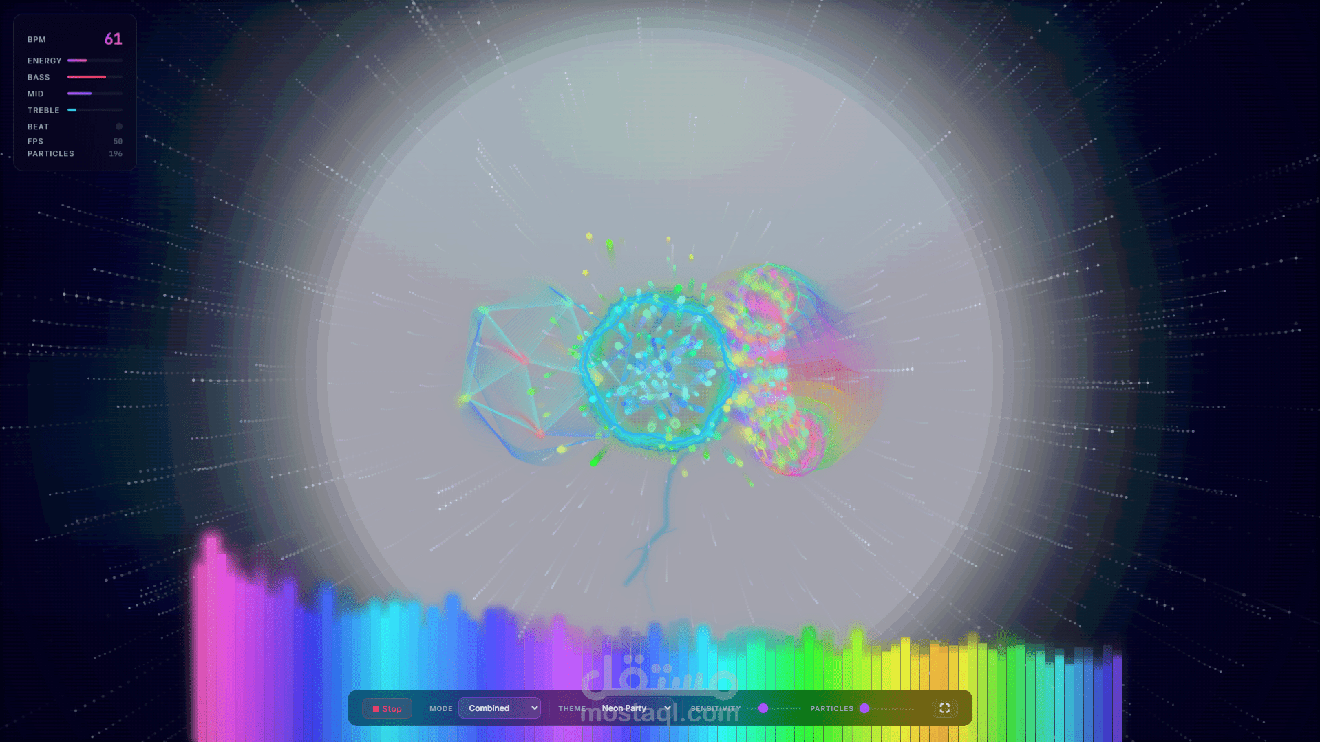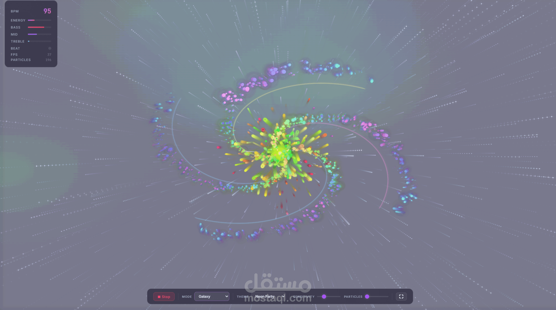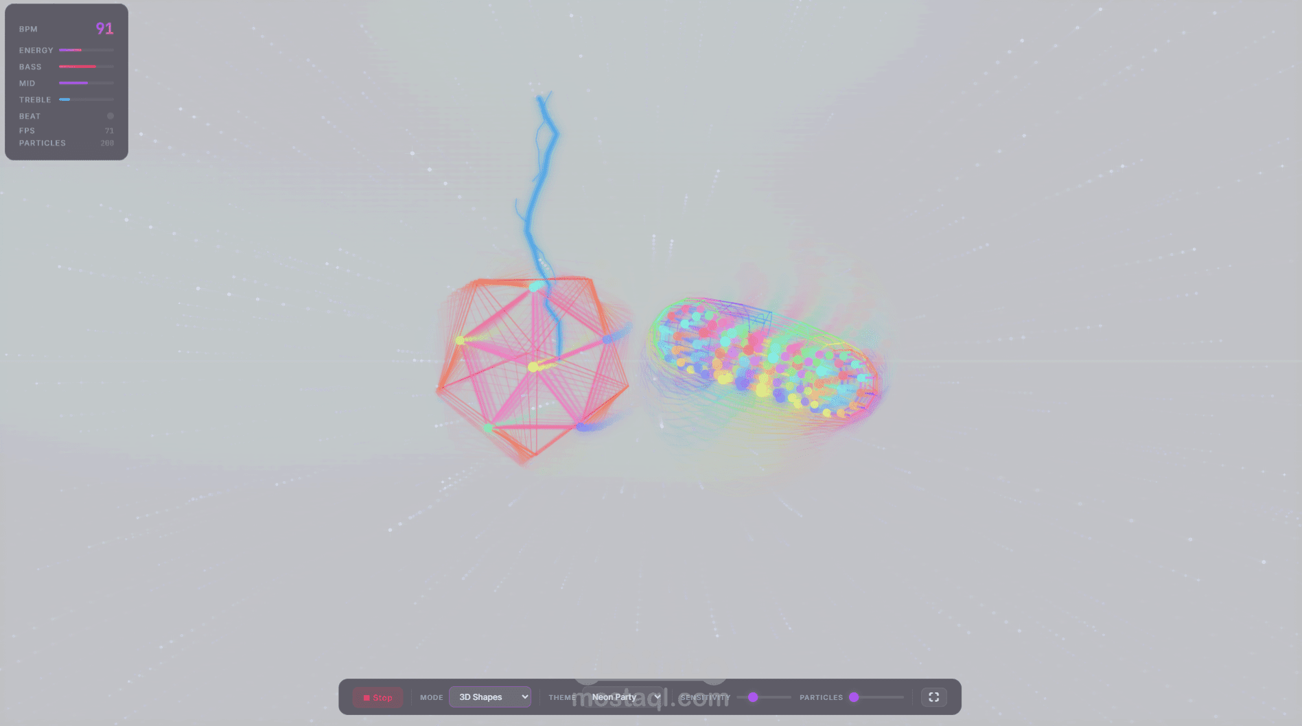 مشروع عرض مرئي للصوت في الزمن الحقيقي — تطبيق ويب يقوم بتحليل مصدر صوتي وإنتاج مؤثرات بصرية ديناميكية تتفاعل مع الموسيقى والنبضات. الميزات الأساسية تشمل مؤثرات جزيئية تتفجر مع الإيقاع، عرض الموجة الصوتية في الزمن الحقيقي، تدرجات لونية تعتمد على بيانات التردد، وأشكال هندسية ثلاثية الأبعاد تتلاشى وتتشكل مع ذروات الطاقة. يدعم اكتشاف الإيقاع وتتبع الباس/الكيك، ويمكنه تصور أي صوت نظامي أو ملف صوتي مُحمّل.