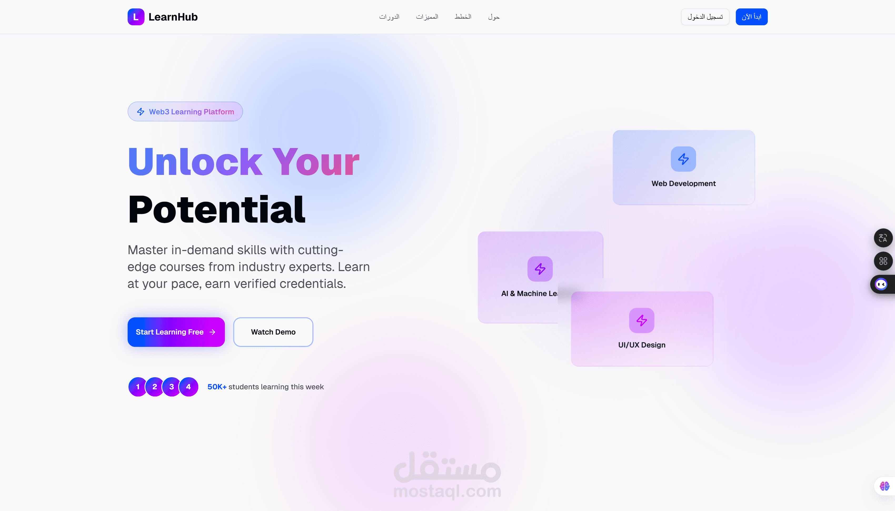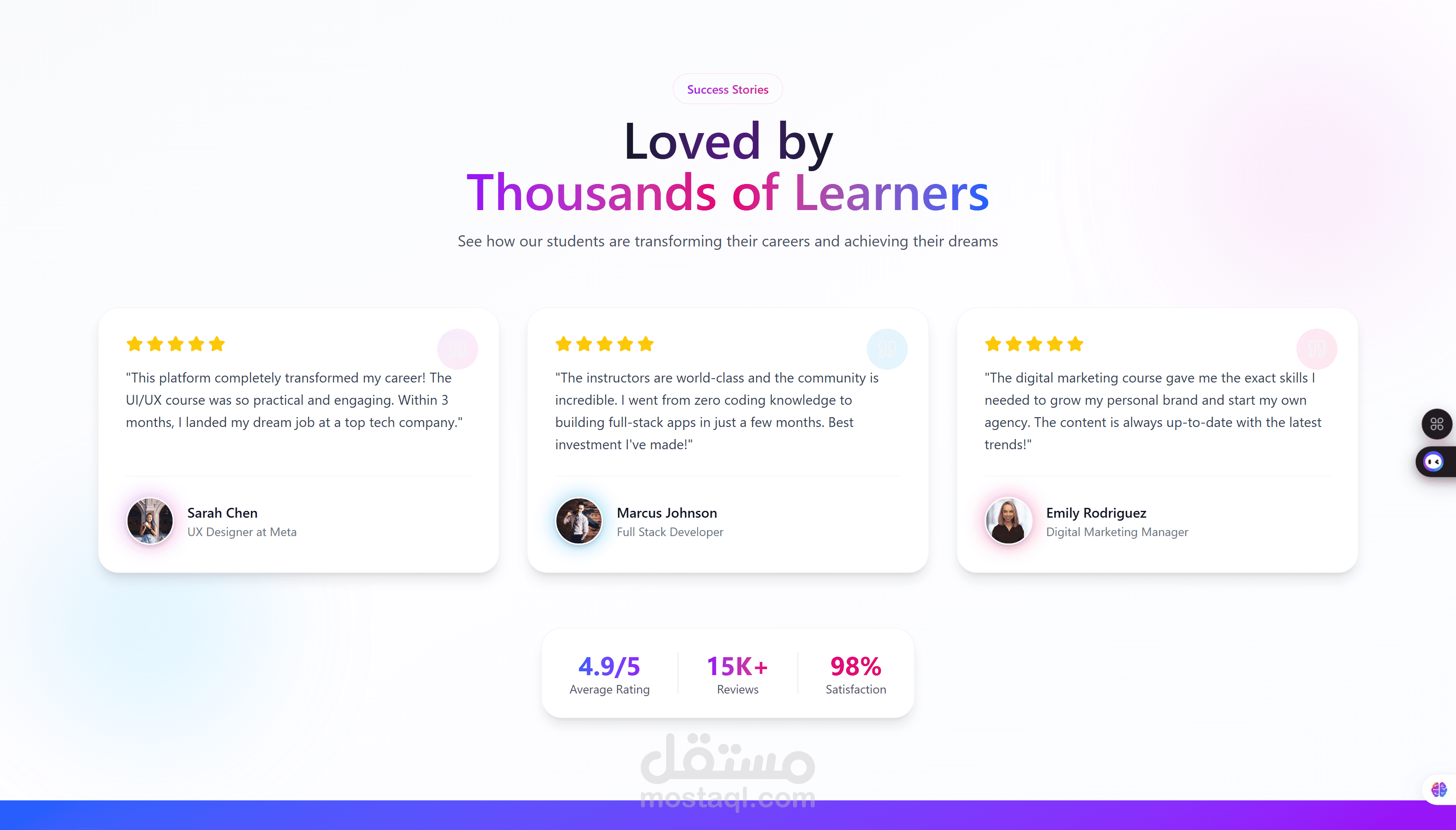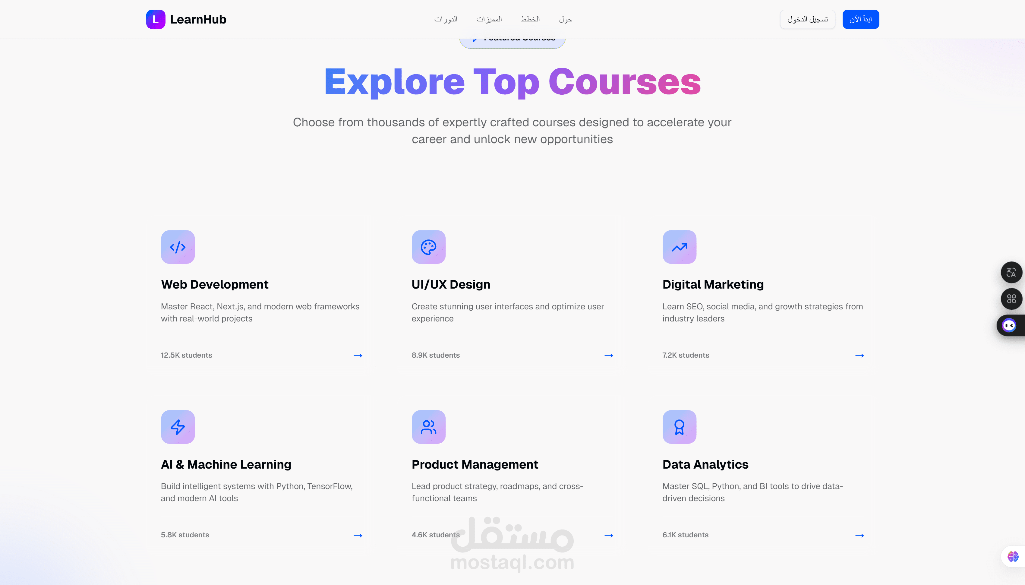 تصميم وتنفيذ منصة كورسات أونلاين بواجهة حديثة وتجربة مستخدم احترافية، مع عرض ديناميكي للكورسات ونظام تقييم وتصنيفات، وتصميم متجاوب بالكامل لزيادة معدل التحويل وتحسين تجربة المتعلم.