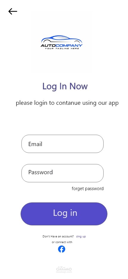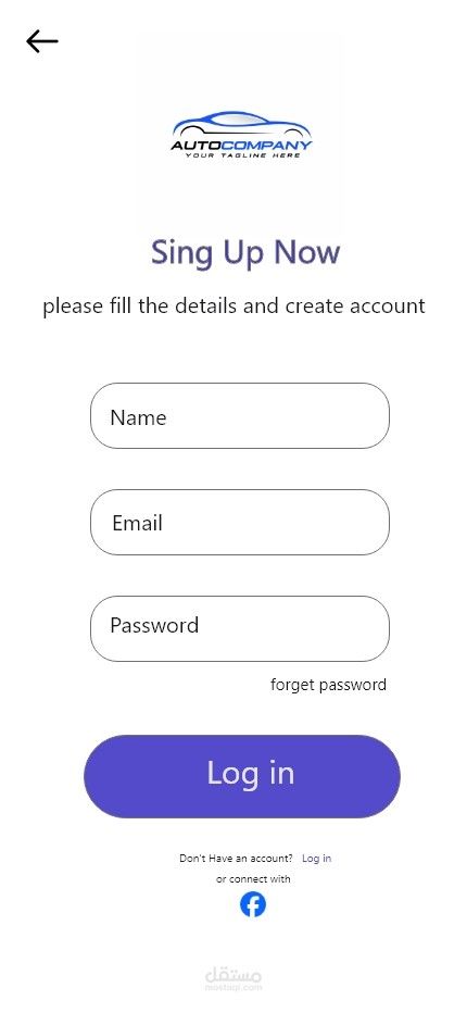 تصميم شاشة Sign Up لتطبيق سيارات، يركز على البساطة وسهولة الاستخدام.