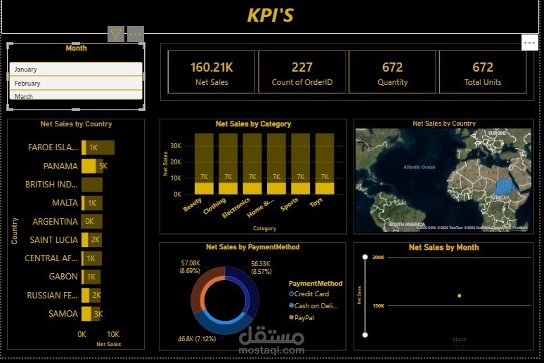 لوحة مؤشرات تفاعلية لمتابعة أداء المبيعات، تعرض أهم مؤشرات الأداء (KPI’s) مثل صافي المبيعات، عدد الطلبات، الكميات، وتحليل حسب الدولة، الفئة، وطريقة الدفع. تصميم مبسط يساعد على اتخاذ قرارات أسرع وأكثر دقة."