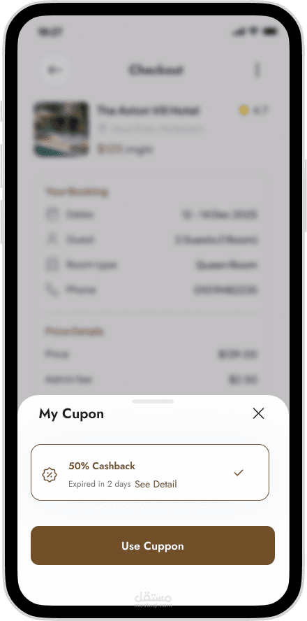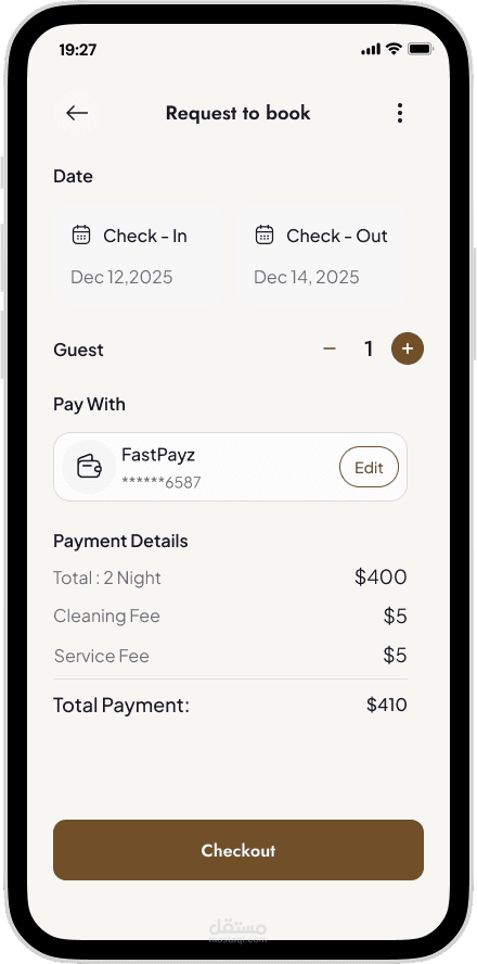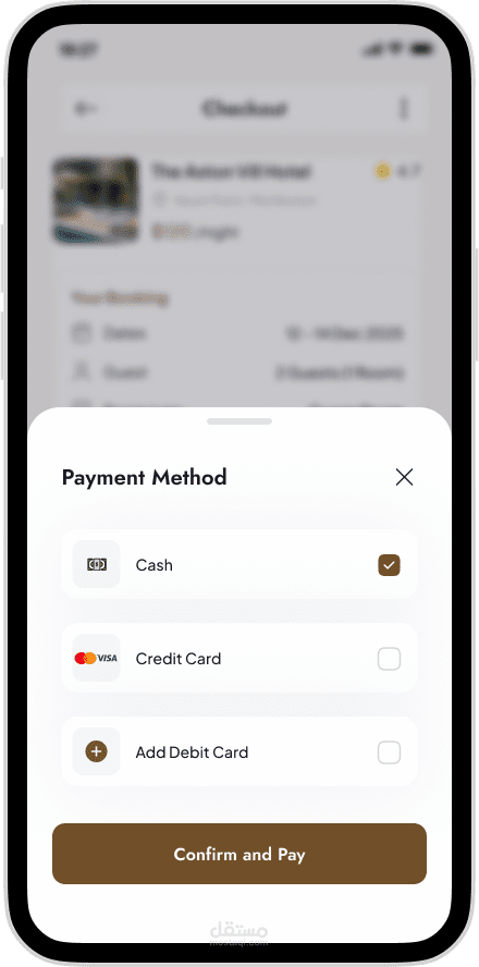 طريقة الدفع (Payment Method): واجهة دفع مرتبة وآمنة مع عرض ملخص الحجز قبل التأكيد.