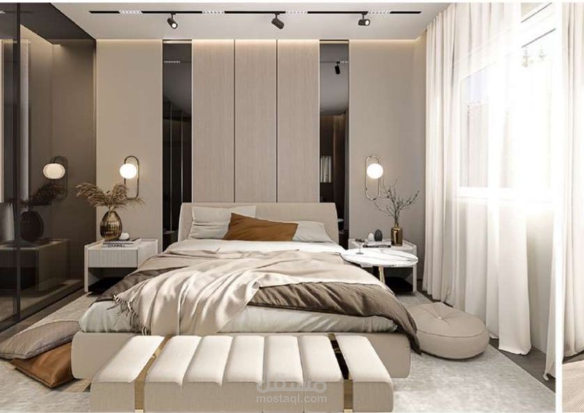 يشمل التصميم عدة فراغات رئيسية داخل الفيلا مثل غرفة المعيشة، غرفة النوم الرئيسية، والحمامات، مع الاهتمام بالتفاصيل الدقيقة مثل الإضاءة المخفية، الخامات الفاخرة، وتناسق الأثاث مع الهوية العامة للتصميم.