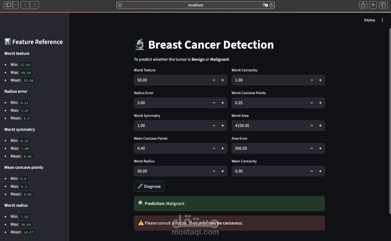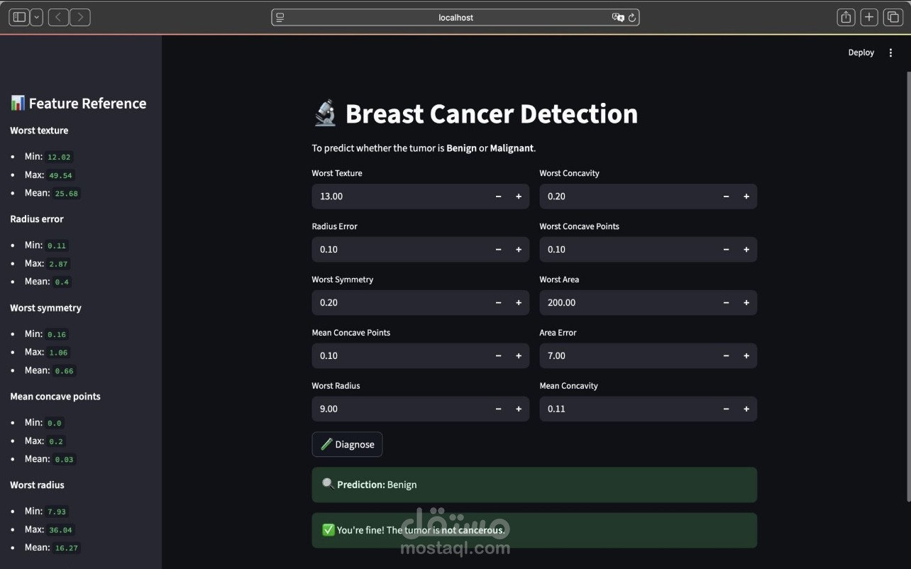 قمت بتطوير تطبيق ويب تفاعلي للتنبؤ بما إذا كان الورم حميدًا أو خبيثًا اعتمادًا على بيانات طبية حقيقية. يعتمد التطبيق على نموذج Logistic Regression ويستخدم أهم الخصائص المؤثرة لضمان دقة التنبؤ.