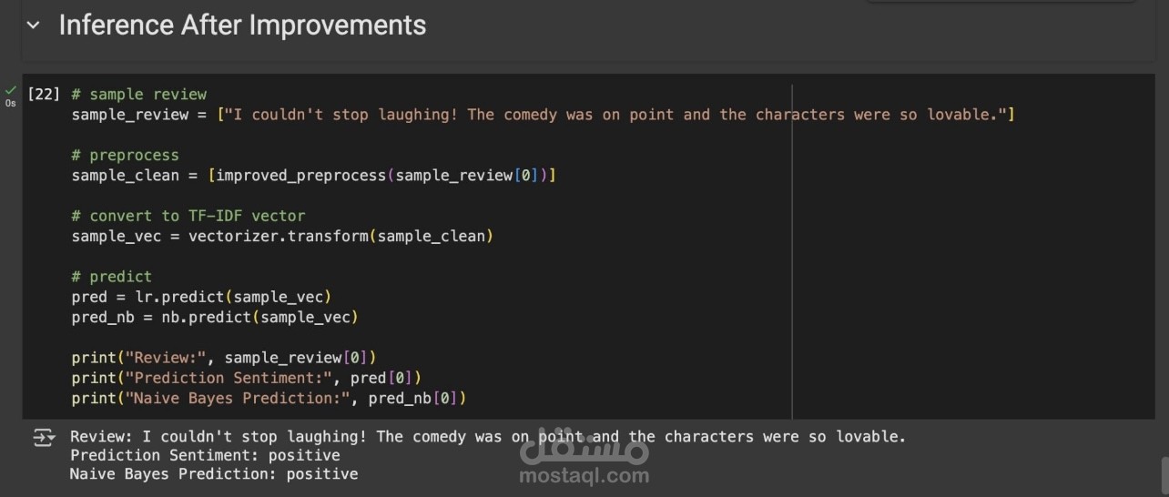 قمت بتطوير مشروع لتحليل نصوص وتصنيفها إلى إيجابي أو سلبي باستخدام نموذجين: Logistic Regression وNaive Bayes. المشروع يشمل معالجة النصوص مسبقًا (إزالة كلمات غير مهمة، التوحيد اللغوي، وتحويل النص إلى خصائص رقمية باستخدام TF-IDF).