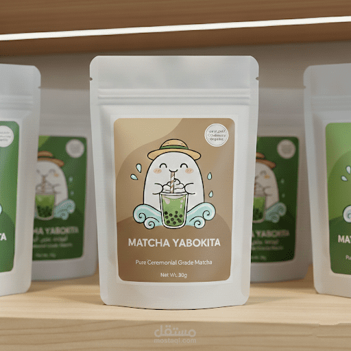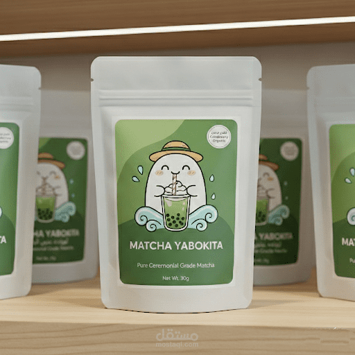 تصميم غلاف لمنتج ماتشا بشكل احترافي وبسيط يدل على الهدوء الانتعاش وذلك باستخدام ألوان جذابة وأنيقة