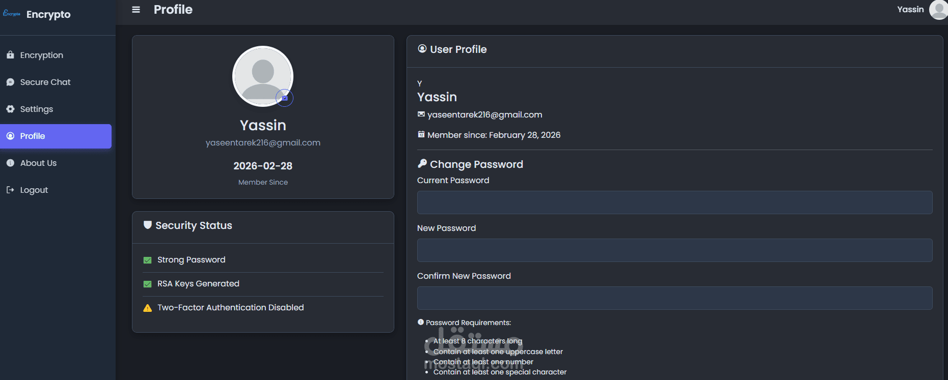 Encrypto is a web application designed to provide users with an interactive platform to explore cryptographic algorithms, experiment with encryption and decryption, and communicate securely through a built-in chat feature. The app is built with modern web technologies and offers a user-friendly interface for both beginners and advanced users interested in cryptography.