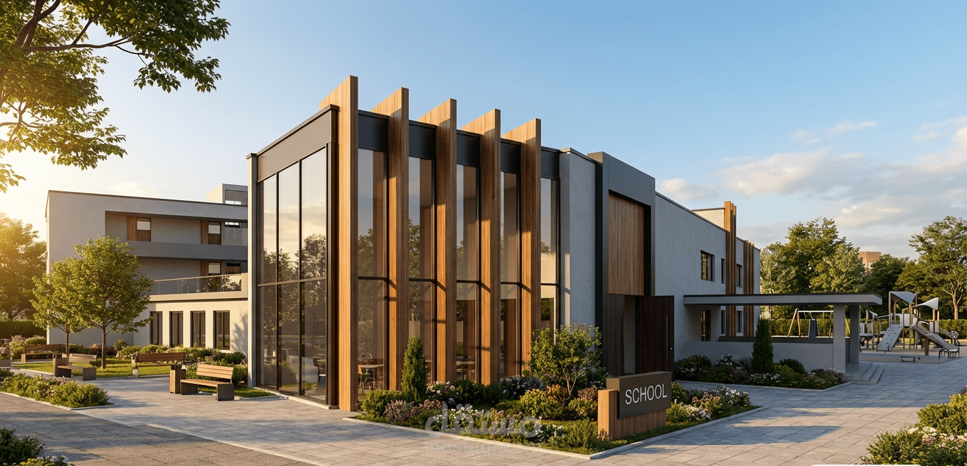 المدرسة الثانوية الحديثة هي "مركز مجتمعي تعليمي" يتجاوز مفهوم الفصول التقليدية؛ فهي تعتمد على الفراغات المرنة والشفافية البصرية لتعزيز التعلم التفاعلي. يتميز تصميمها بوجود "قلب اجتماعي" (Atrium) يربط الكتل الأكاديمية بالساحات الخارجية والحدائق التعليمية، مع التركيز على الاستدامة والوصول الشامل. كما تعمل المدرسة كعنصر حضري نشط يندمج مع الشارع من خلال ساحات دخول آمنة ومرافق مشتركة تخدم الحي، مما يحولها من مبنى مغلق إلى بيئة تعلم مفتوحة وملهمة.