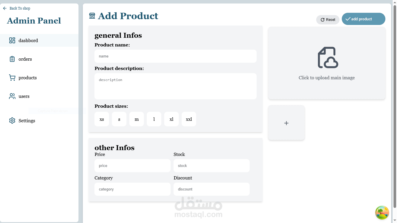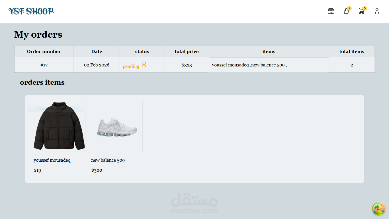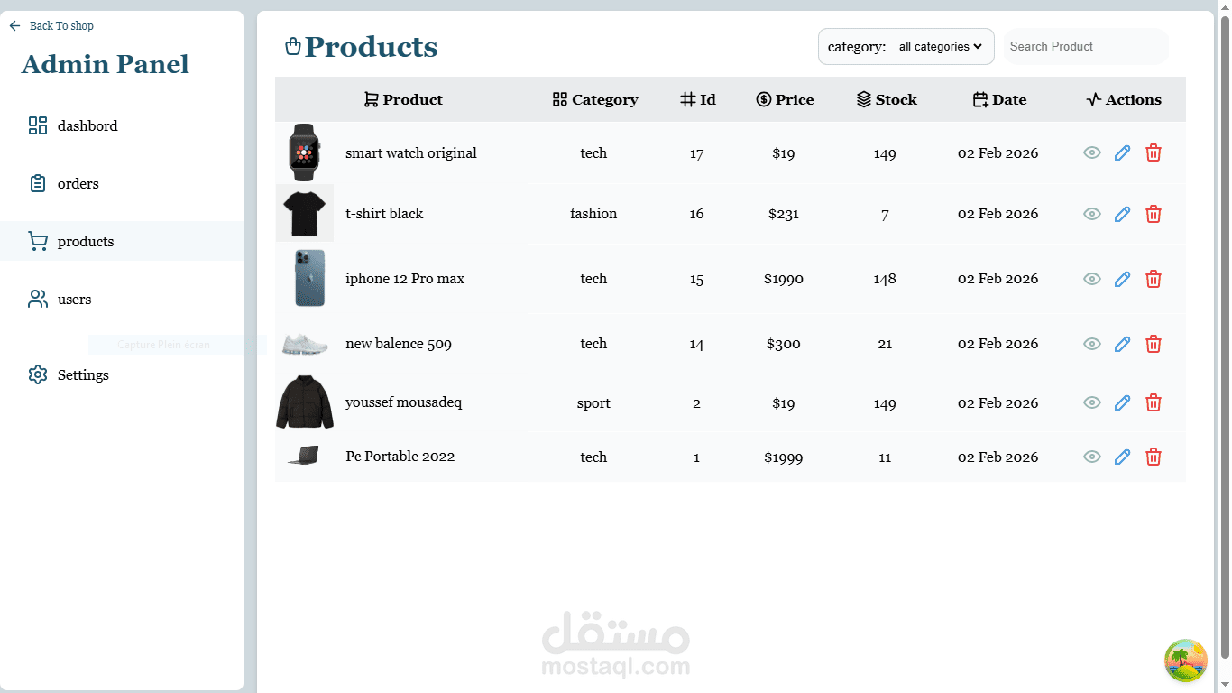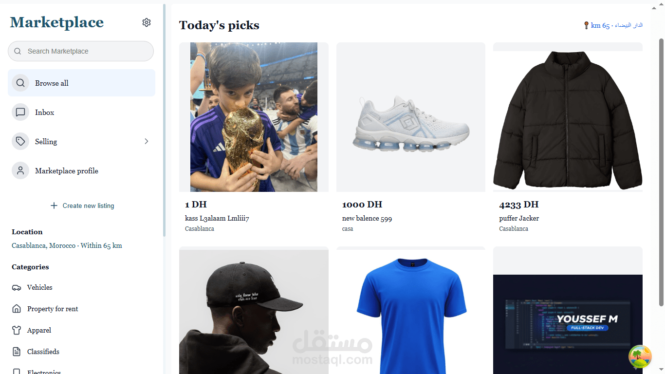 تم بناء تطبيق التجارة الإلكترونية هذا كنظام متكامل (Full-Stack) بواجهة أمامية باستخدام React وباك إند باستخدام Laravel. بالإضافة إلى إدارة المنتجات، سلة المشتريات، والطلبات عبر RESTful APIs، تتضمن المنصة ميزة Marketplace تتيح للمستخدمين بيع وشراء منتجاتهم الخاصة.