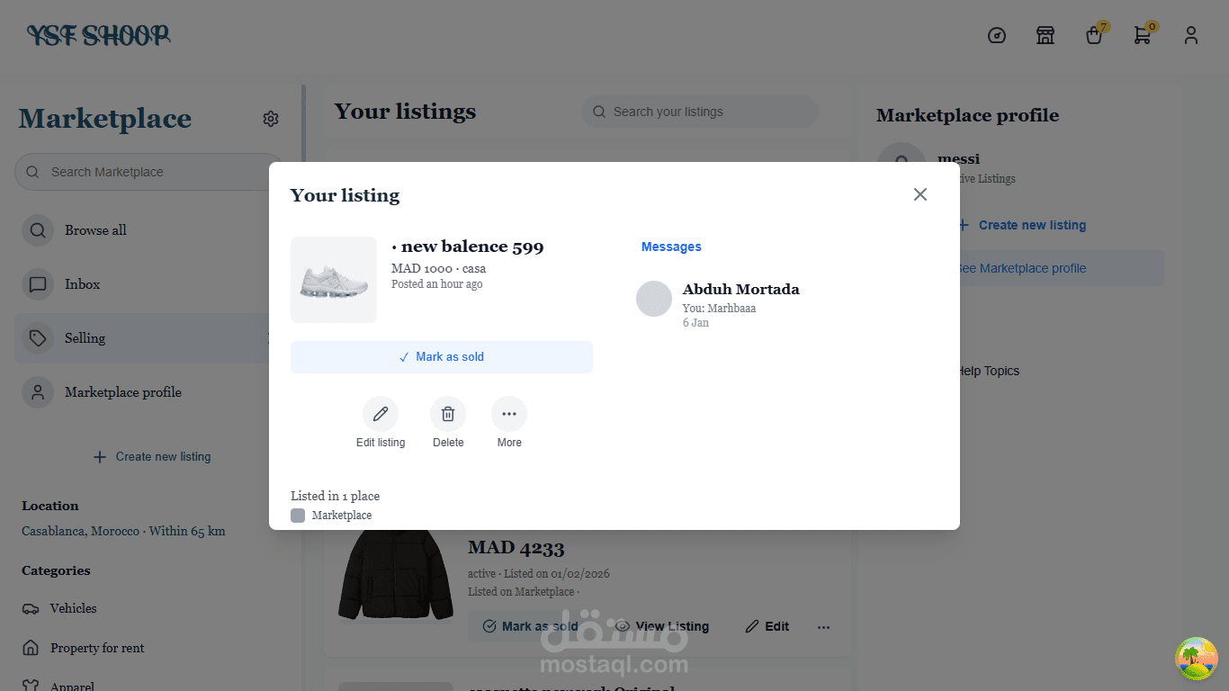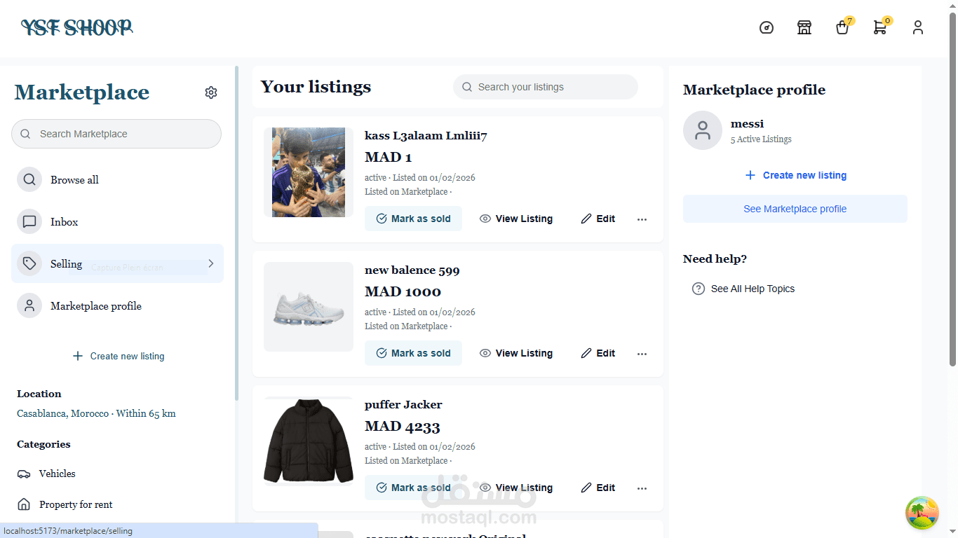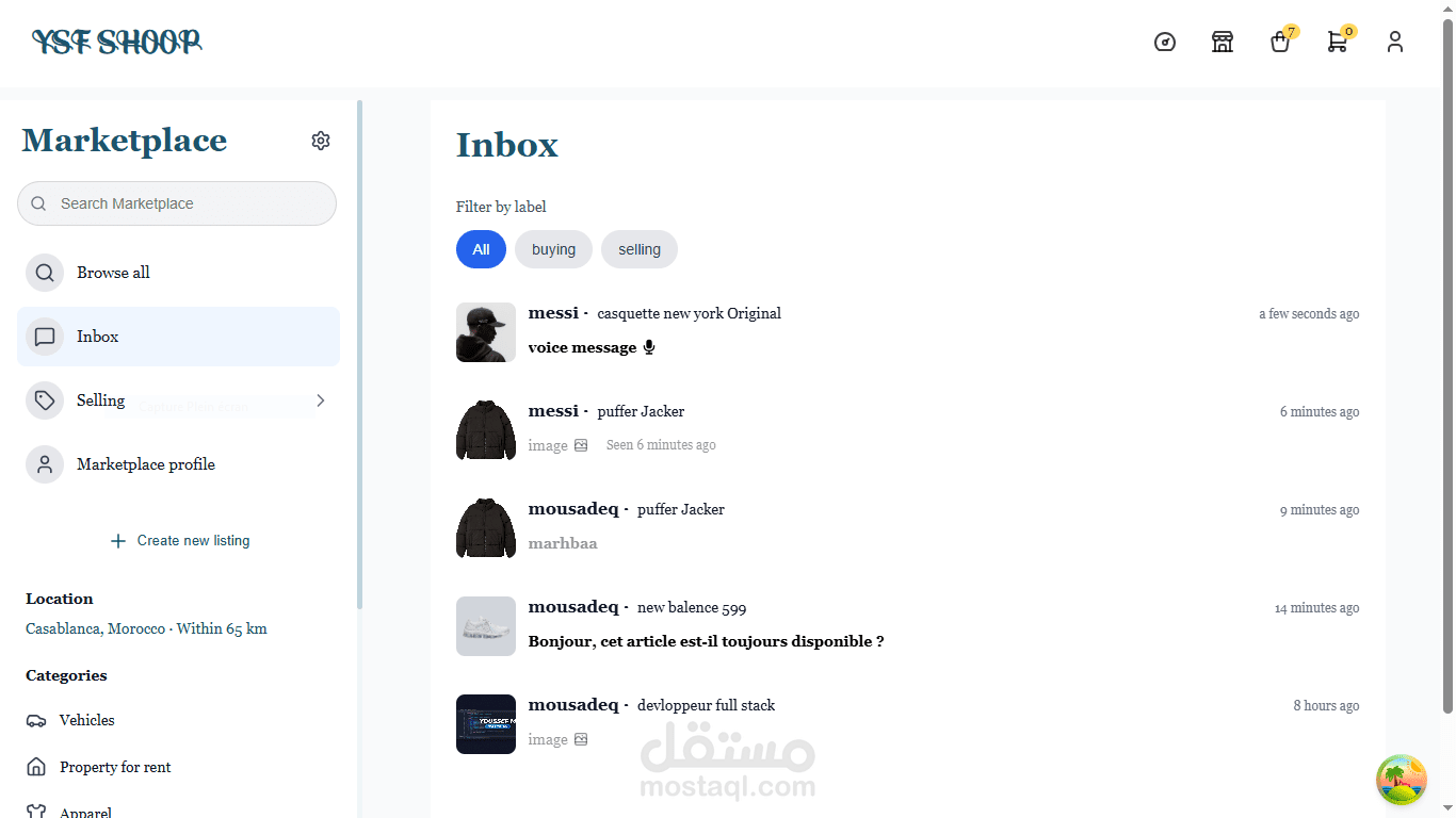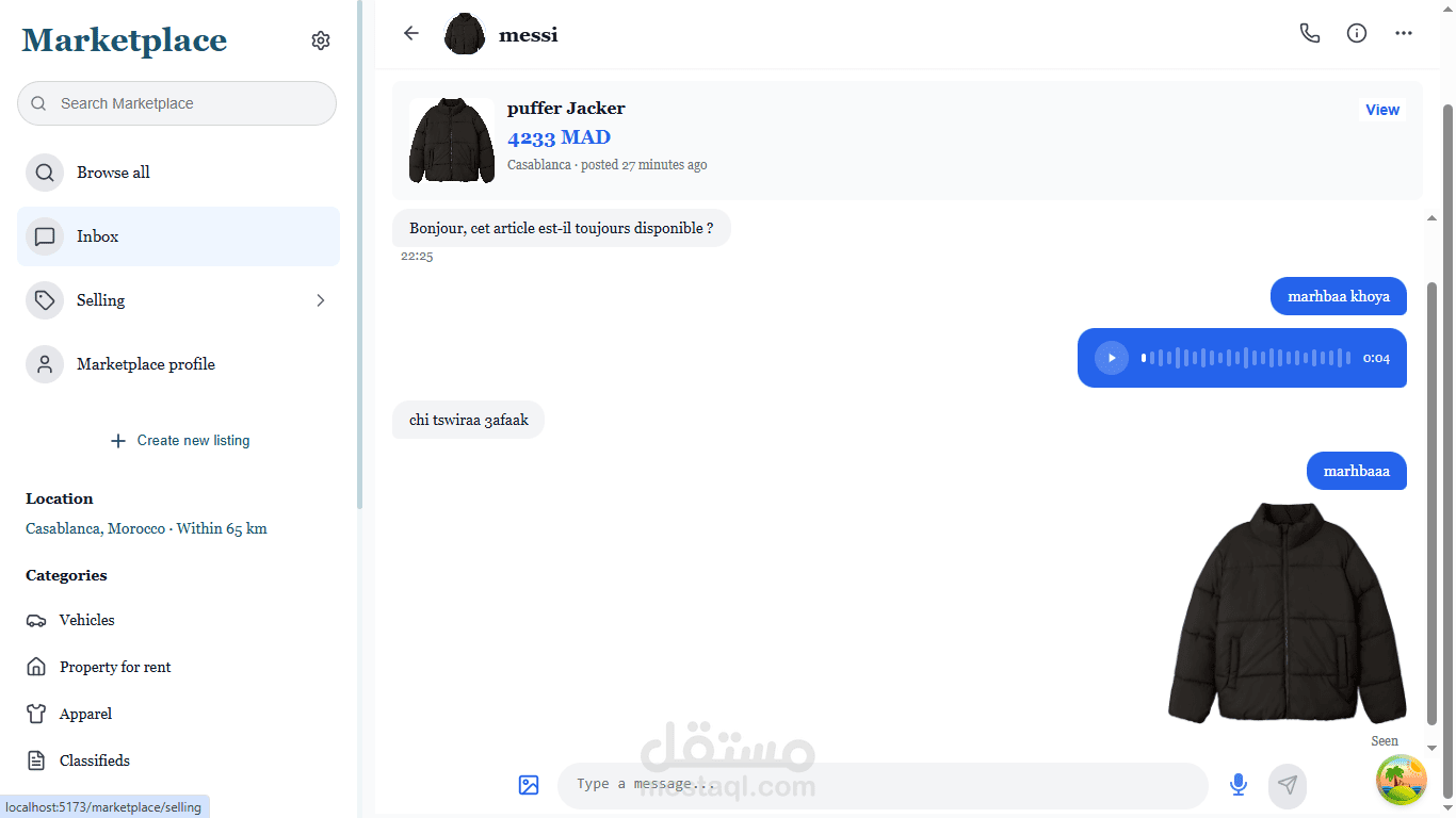 تم تنفيذ نظام دردشة فورية باستخدام WebSockets، مما يتيح المراسلة اللحظية بين البائعين والمشترين داخل كل إعلان. يدعم نظام الدردشة حالة الرسائل (تم الإرسال، تمت المشاهدة)، ومشاركة الوسائط (الصور والمقاطع الصوتية)، بالإضافة إلى تحديثات واجهة فورية (Optimistic UI) لضمان تجربة مستخدم سلسة وسريعة.