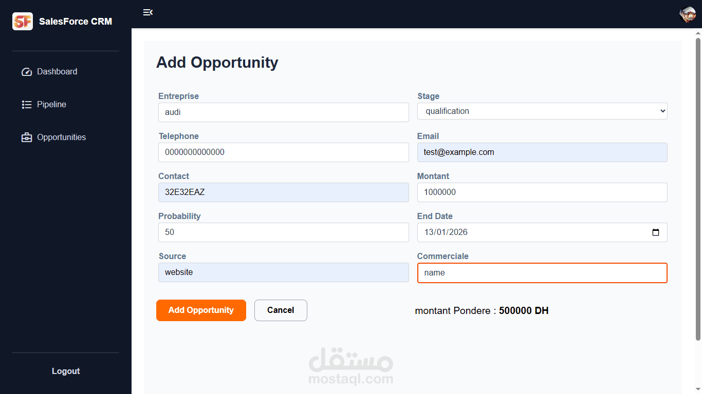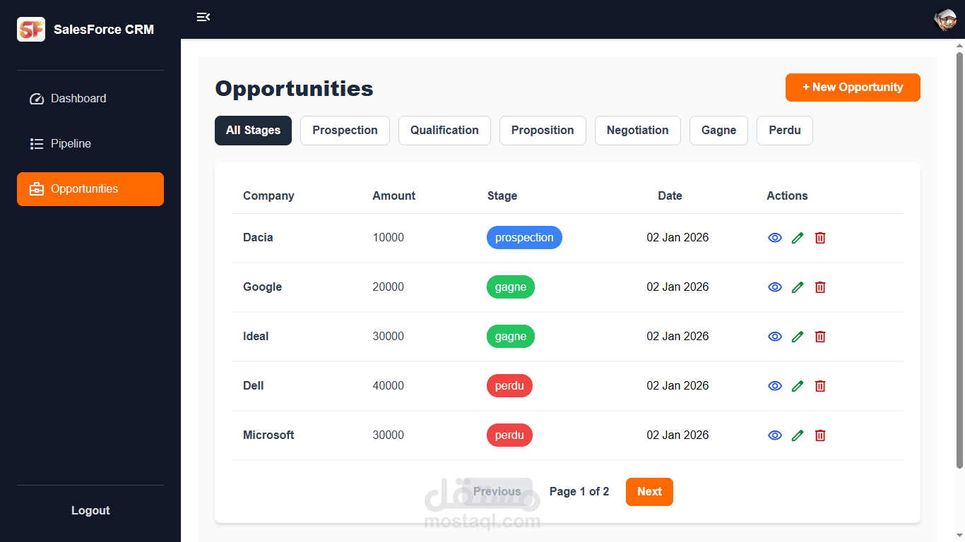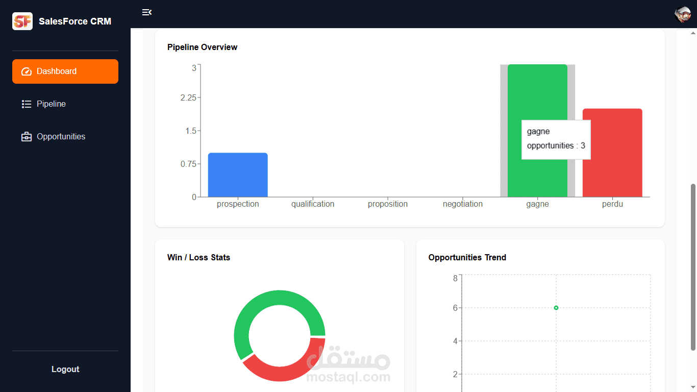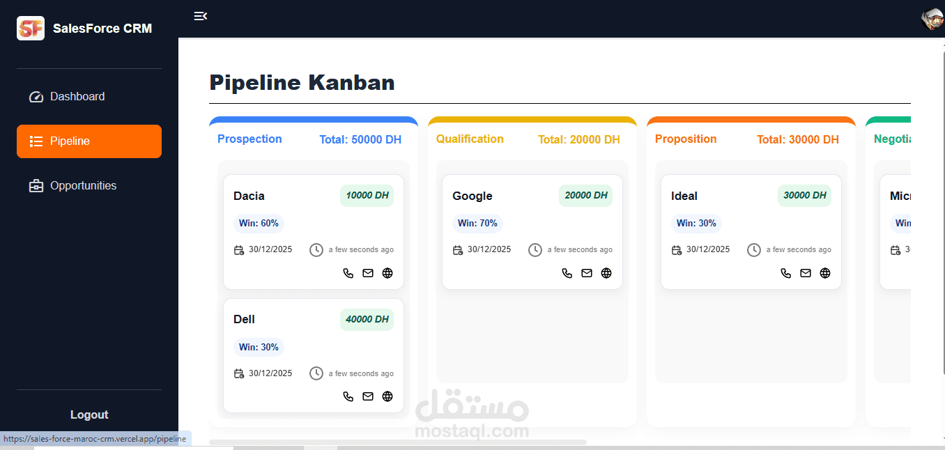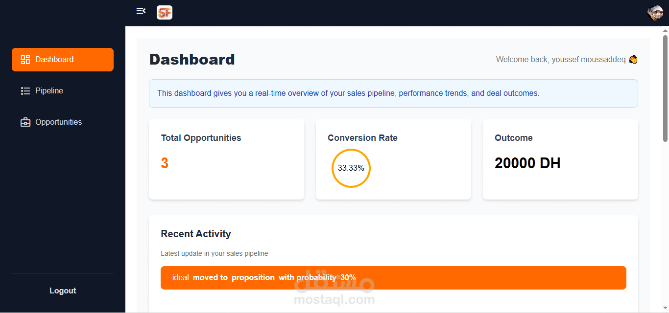نظام CRM تم تطويره باستخدام React وRedux Toolkit لإدارة الحالة بكفاءة عالية. يوفّر إدارة كاملة للفرص البيعية (CRUD)، مع خط أنابيب مبيعات (Sales Pipeline) يدعم السحب والإفلات، وواجهة متجاوبة مبنية باستخدام Tailwind CSS.