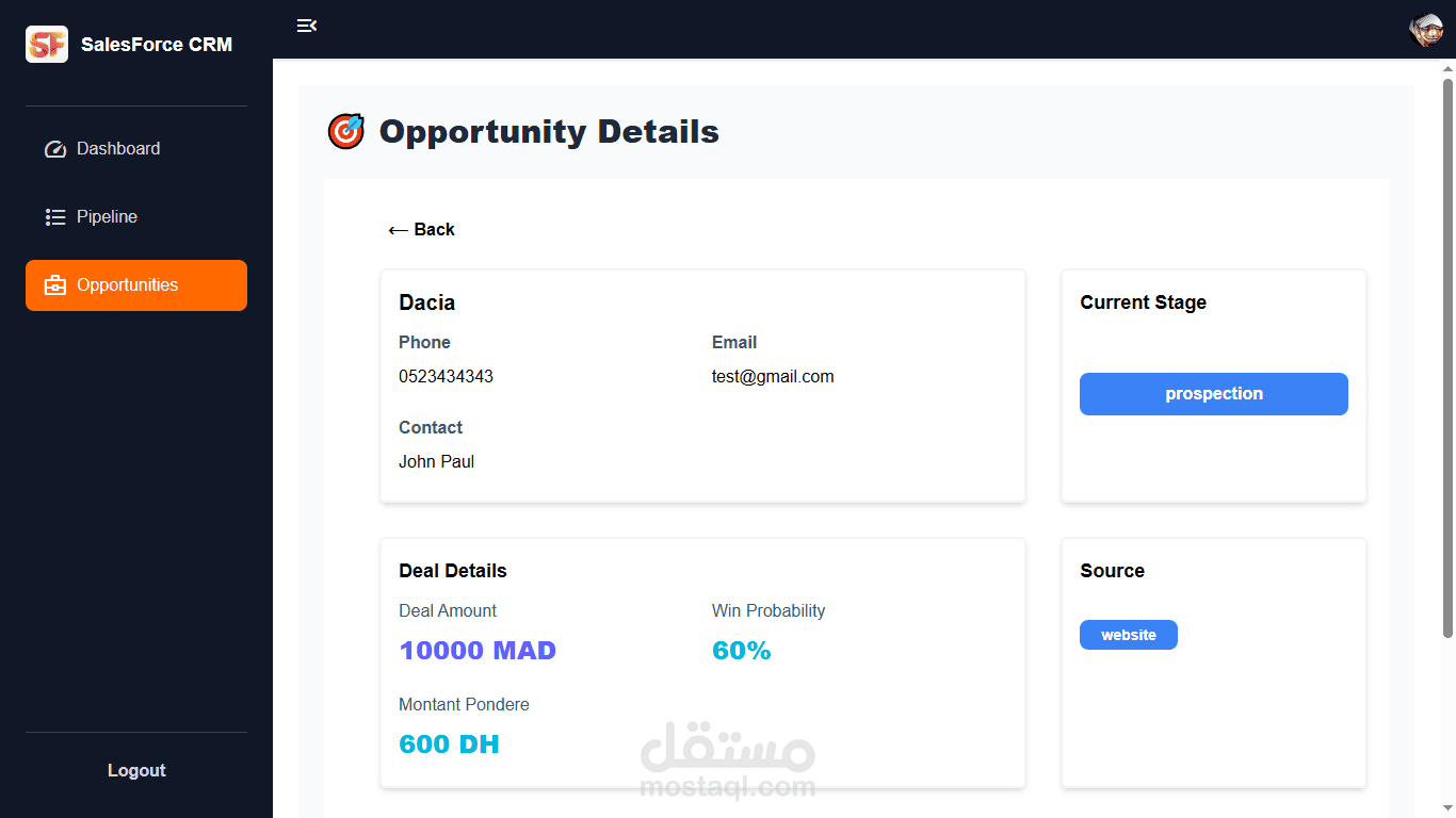 يمكّن النظام من تتبع العملاء المحتملين، إدارة سير عملية البيع، وعرض تقدم الصفقات بشكل بصري وسهل الفهم. يتضمن المشروع نظام مصادقة آمن مع أدوار مختلفة (مدير ومندوب مبيعات)، بالإضافة إلى لوحة تحكم تحليلية لمتابعة الأداء.