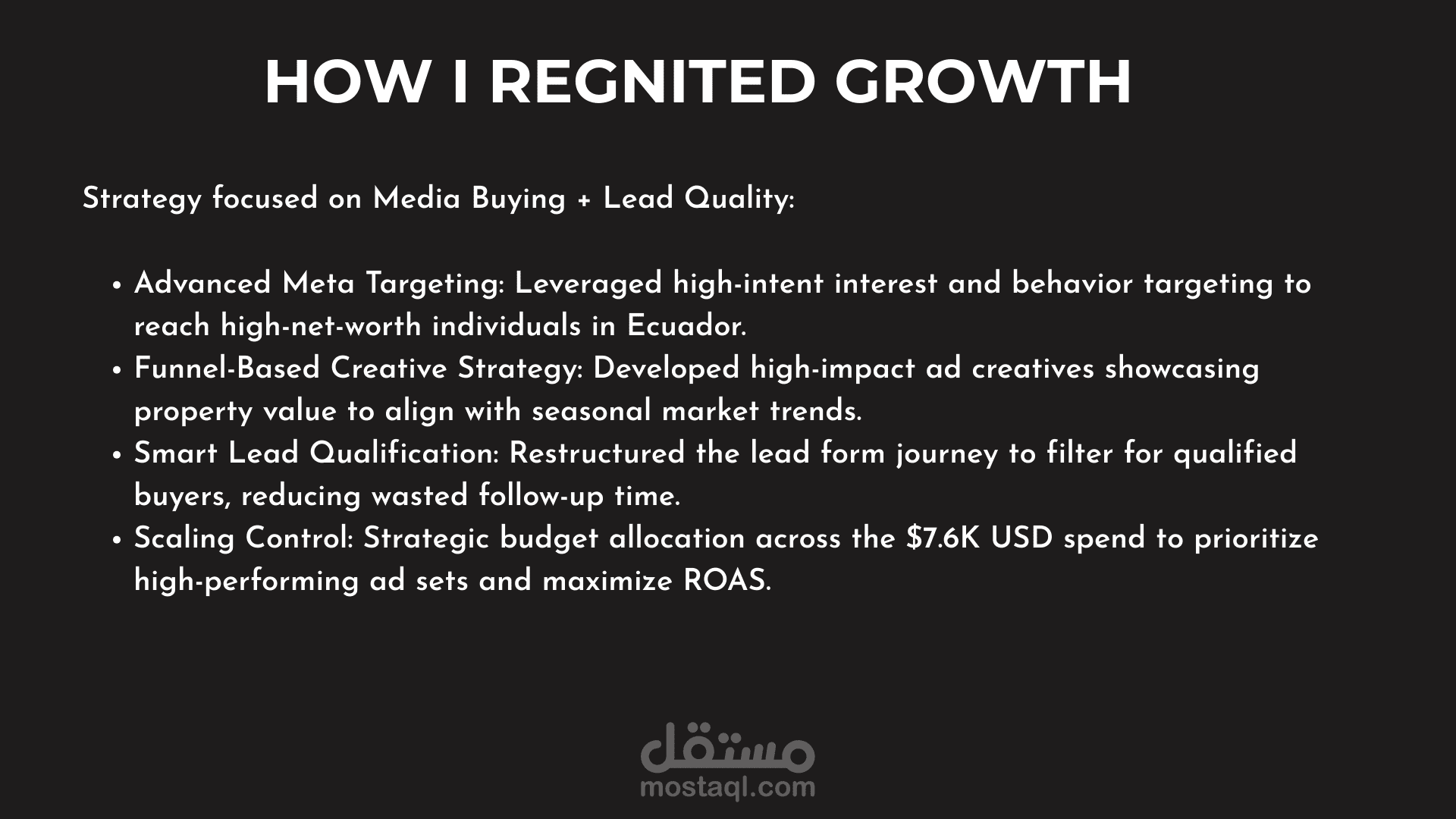 Generated $1.6M in revenue and 2,500+ qualified leads for high-ticket Ecuadorian real estate by optimizing Meta targeting and implementing a lead-qualification funnel that reduced CPL to $2.04.