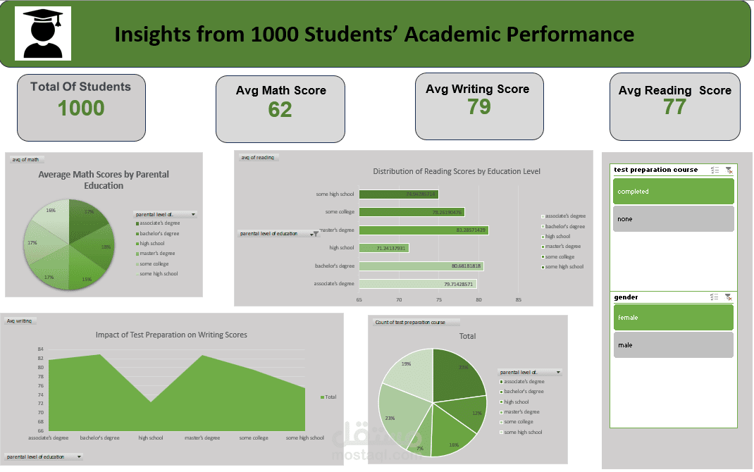 Interactive Dashboard: بناء لوحة تحكم تفاعلية تسمح للمستخدم بتصفية النتائج (Slicers) حسب الجنس أو التحضير للاختبار لمشاهدة التغيرات اللحظية.