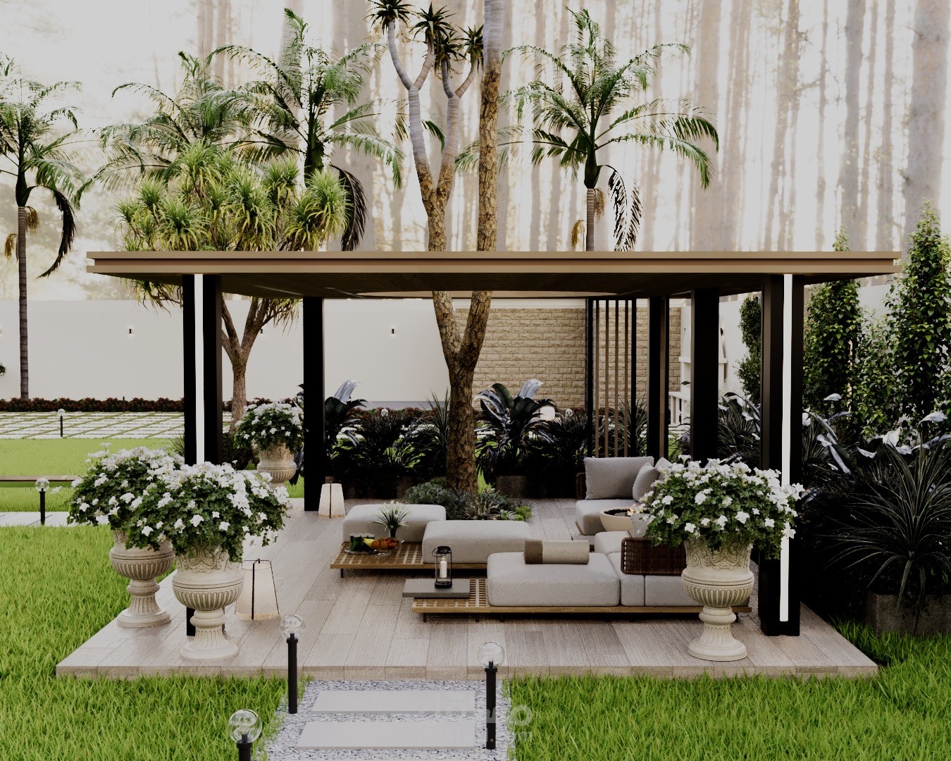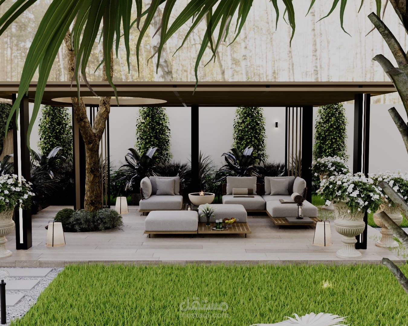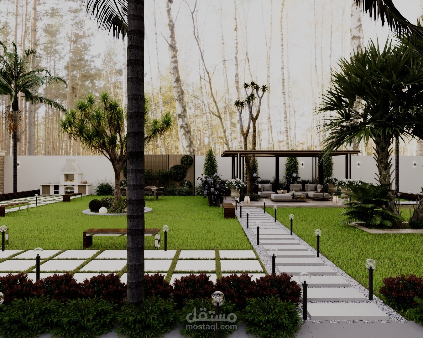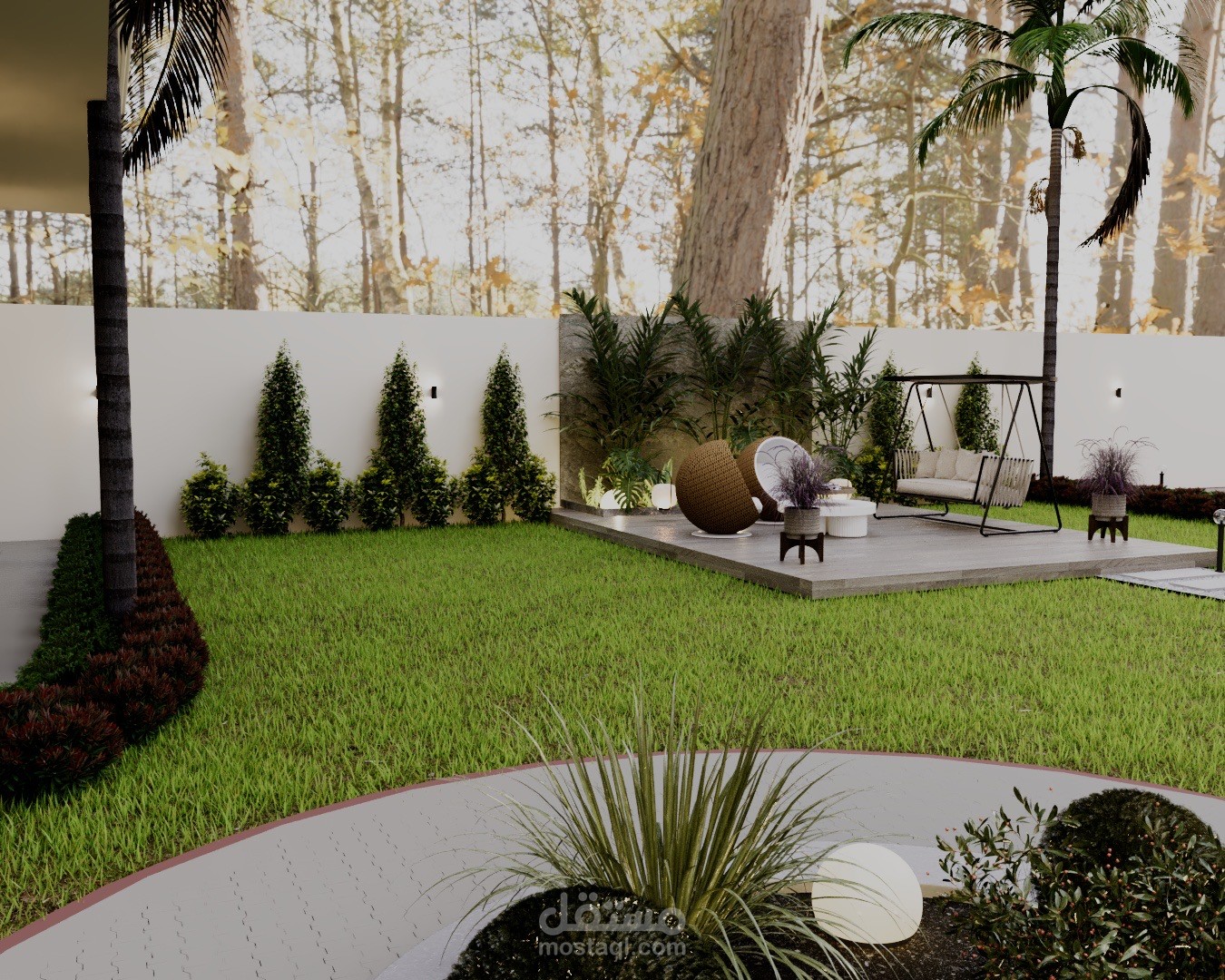 A modern landscape design created for a private rest house in Riyadh, blending comfort, privacy, and natural elements. The concept focuses on creating a relaxing outdoor retreat suited to the local climate, with shaded seating areas, soft lighting, and carefully selected greenery.