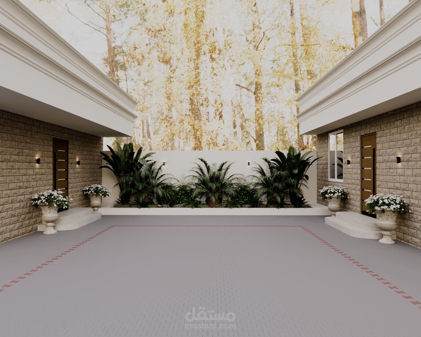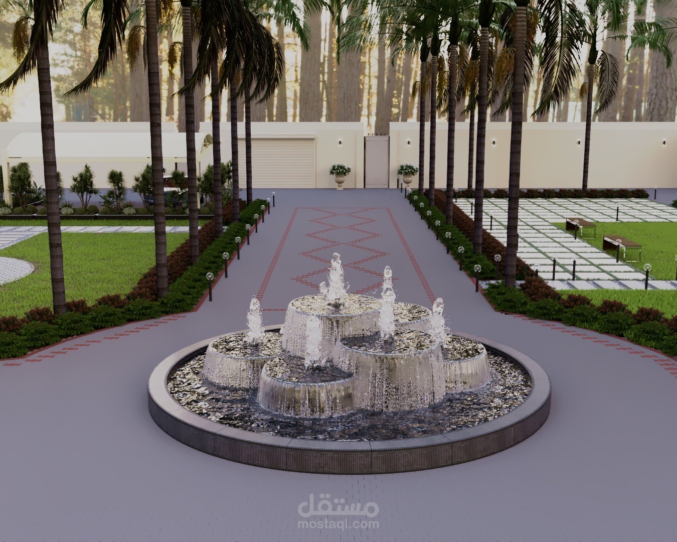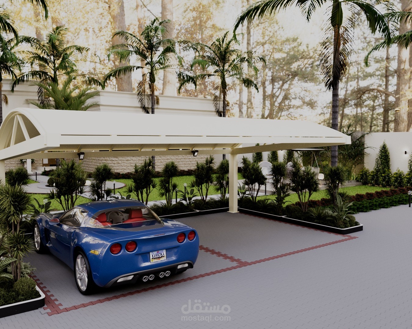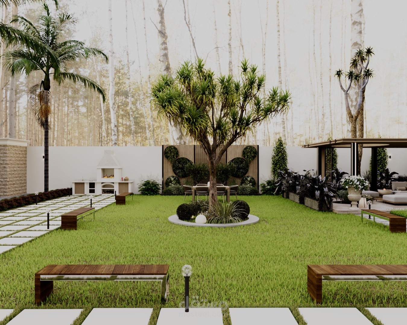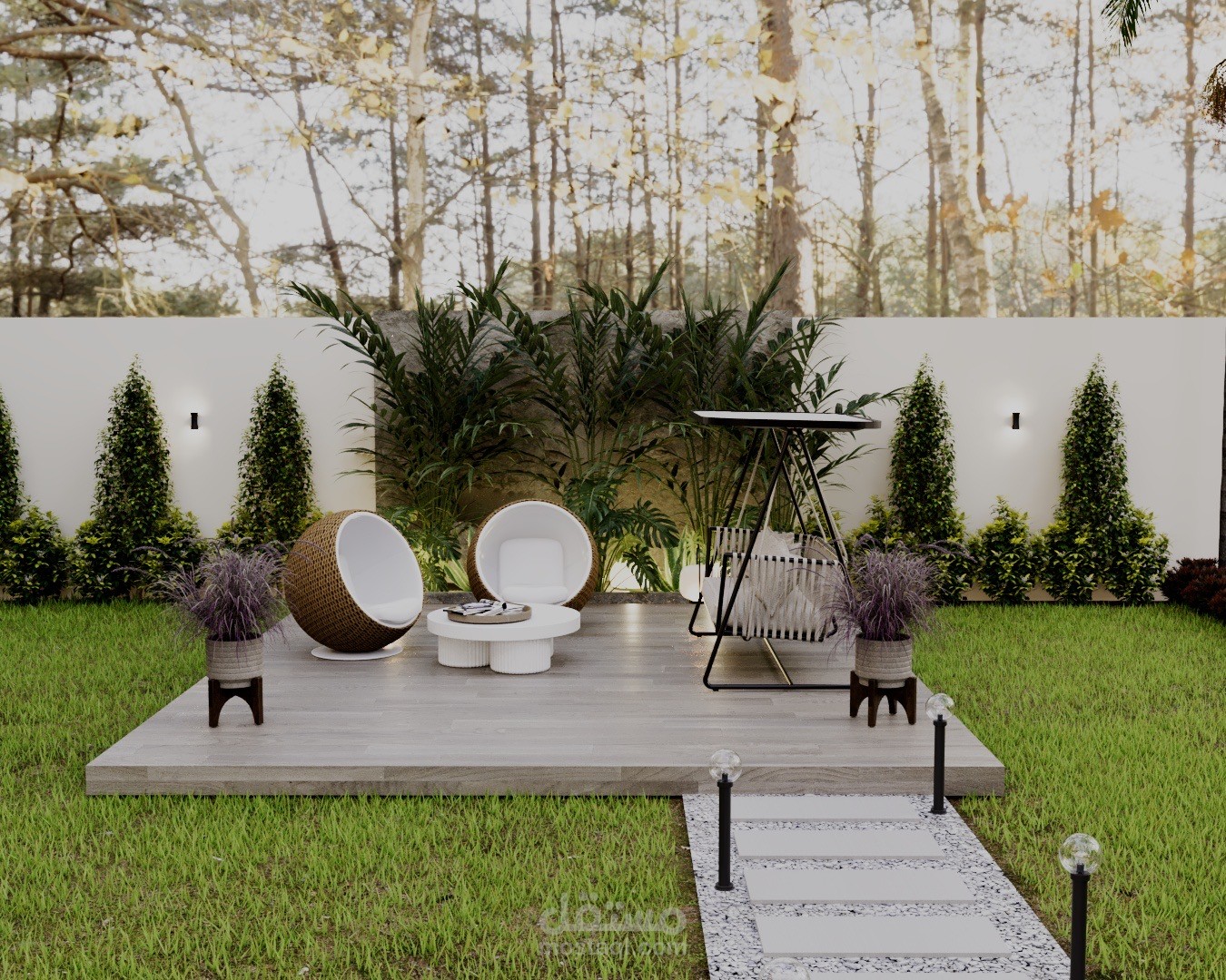 A modern landscape design created for a private rest house in Riyadh, blending comfort, privacy, and natural elements. The concept focuses on creating a relaxing outdoor retreat suited to the local climate, with shaded seating areas, soft lighting, and carefully selected greenery.