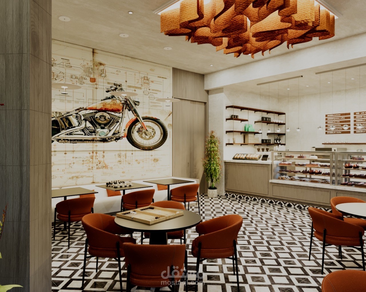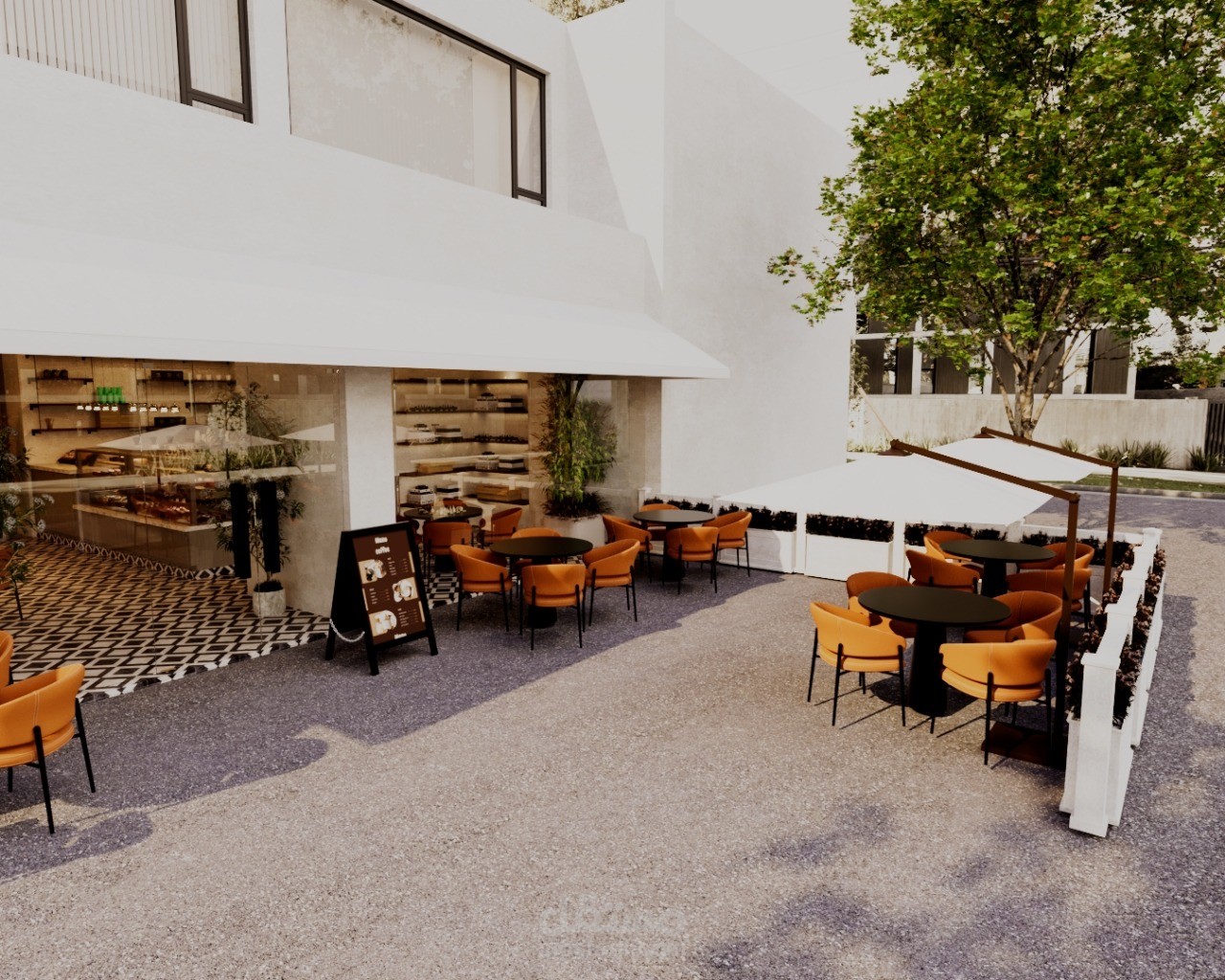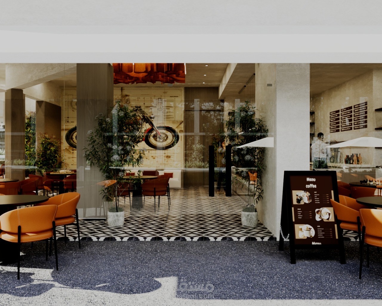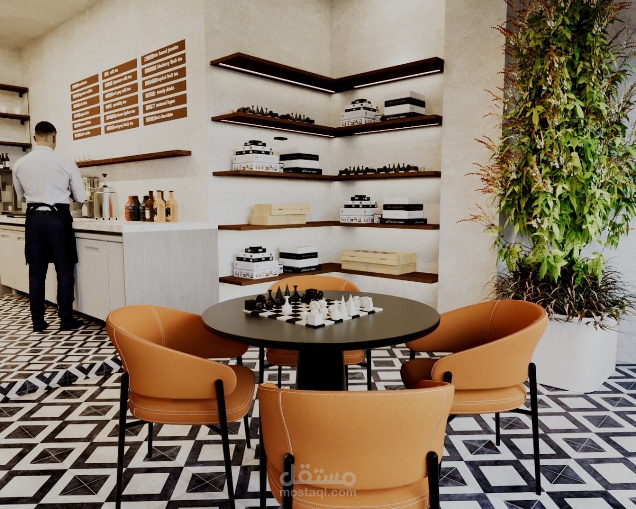 A contemporary café designed to create a warm and inviting social atmosphere in the heart of Riyadh. The concept blends modern aesthetics with natural textures, featuring clean lines, ambient lighting, and a carefully curated material palette.