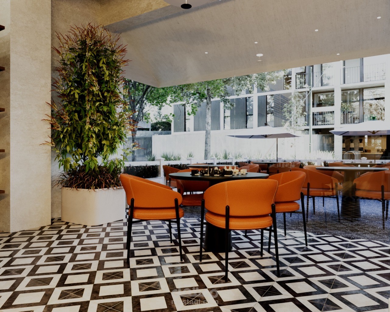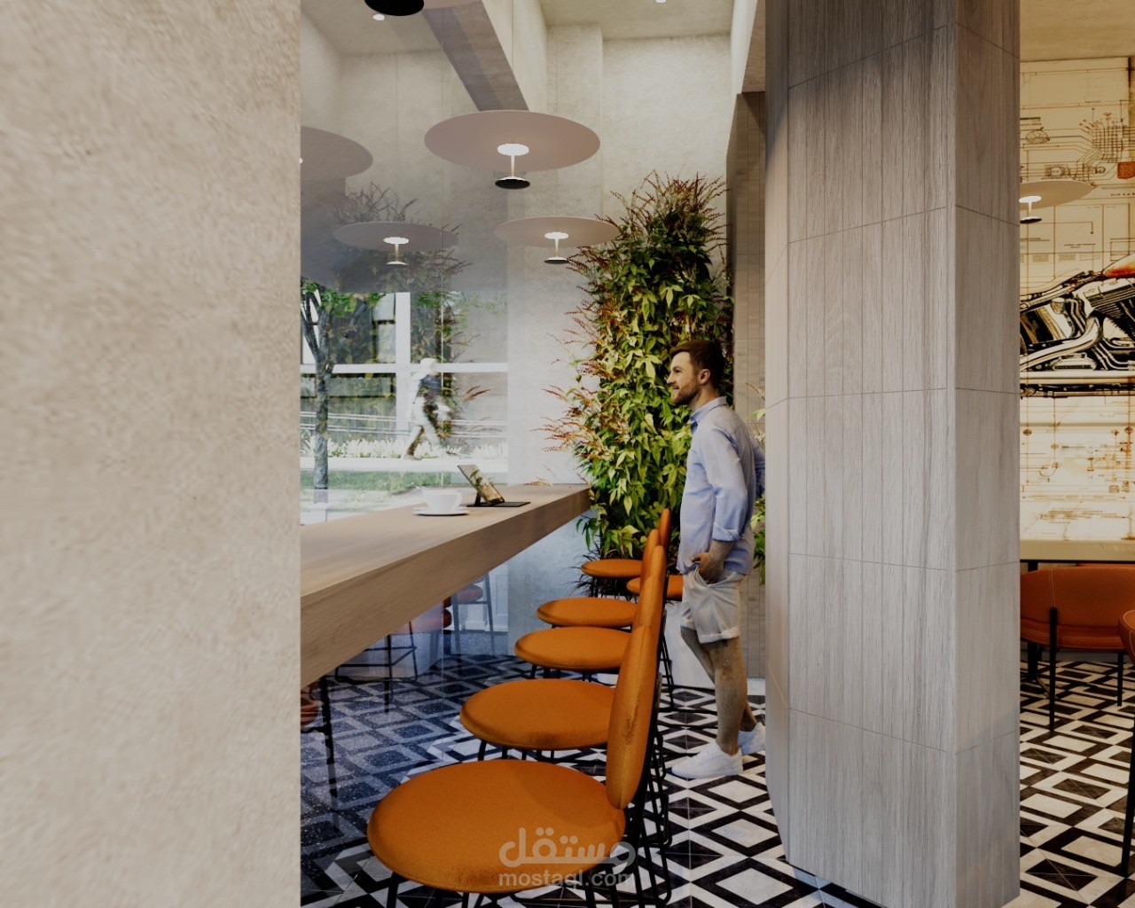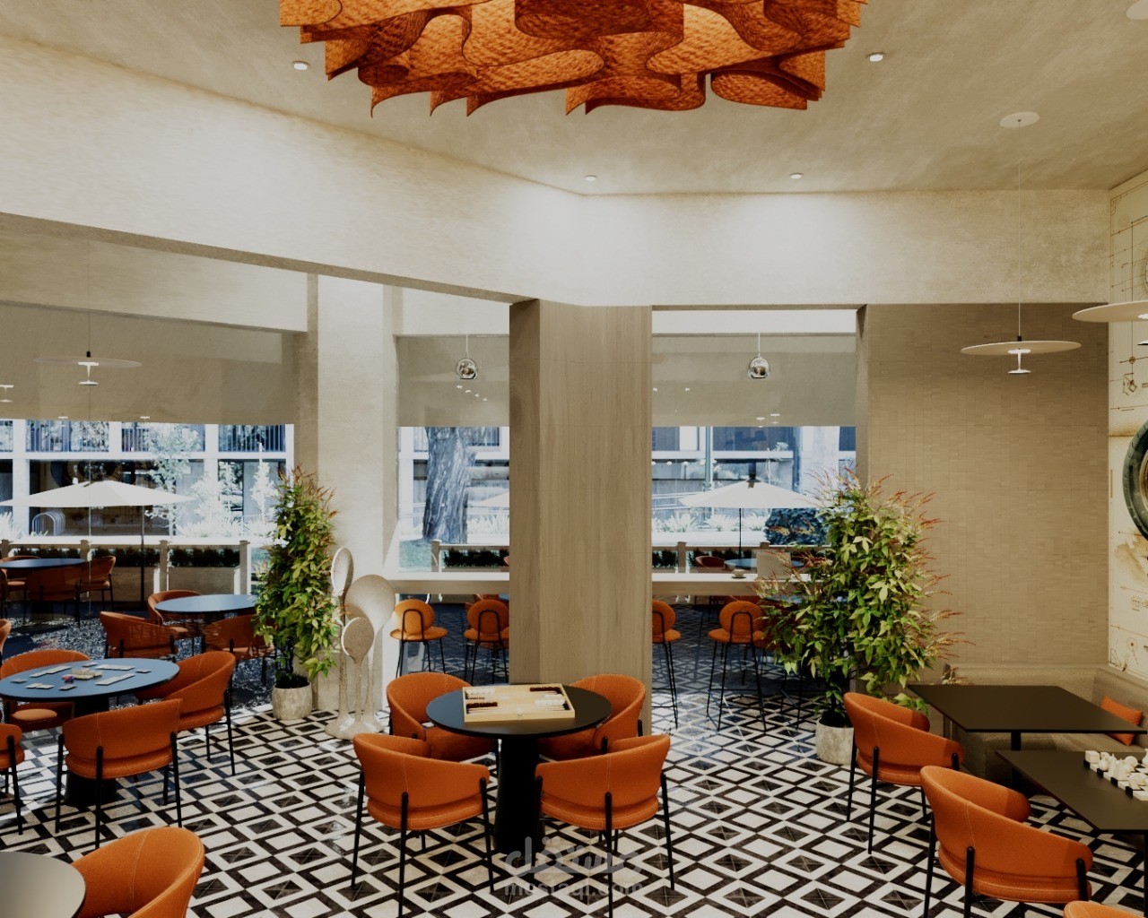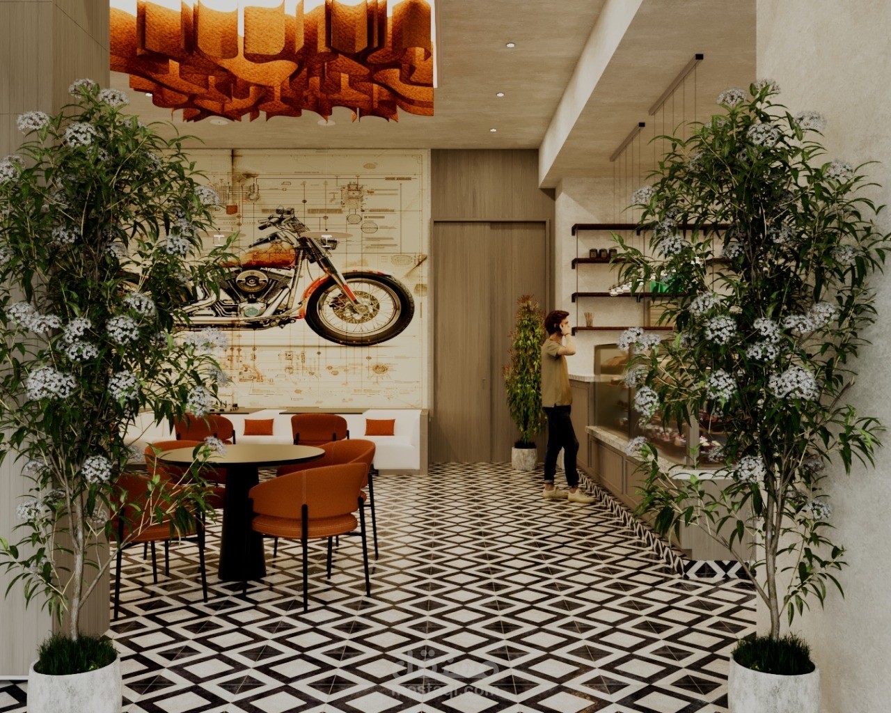 A contemporary café designed to create a warm and inviting social atmosphere in the heart of Riyadh. The concept blends modern aesthetics with natural textures, featuring clean lines, ambient lighting, and a carefully curated material palette.