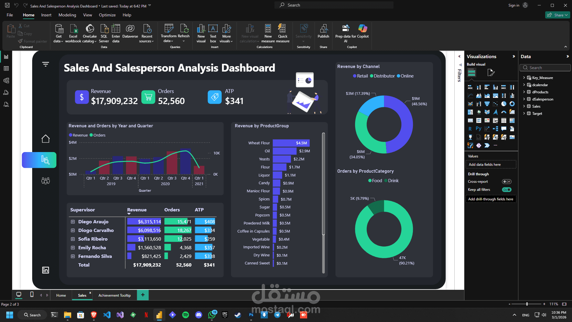 تتضمن لوحة التحكم أيضًا عناصر تفاعلية تسهّل استكشاف البيانات مثل Slicers وDrill-through وDynamic Tooltips، مما يسمح للمستخدم بالتنقل بين التفاصيل ومقارنة الأداء بين القنوات المختلفة، المنتجات، والمندوبين بشكل مرن وواضح.