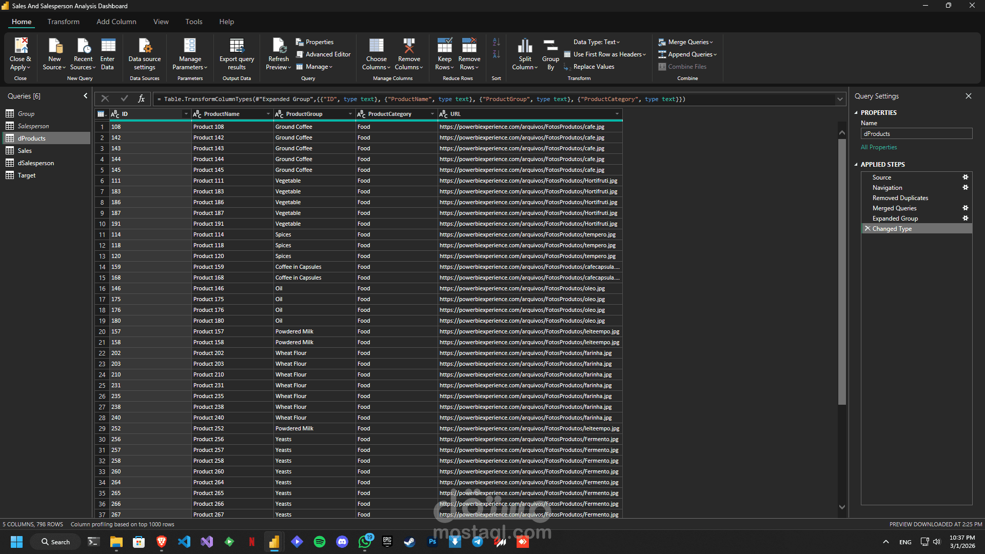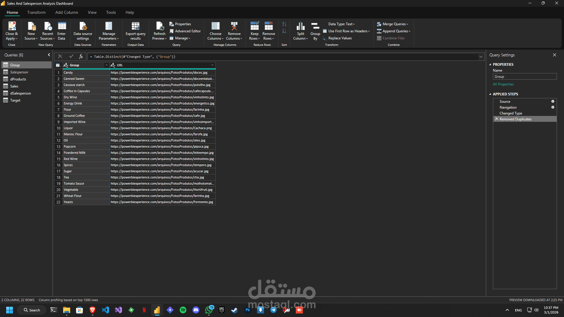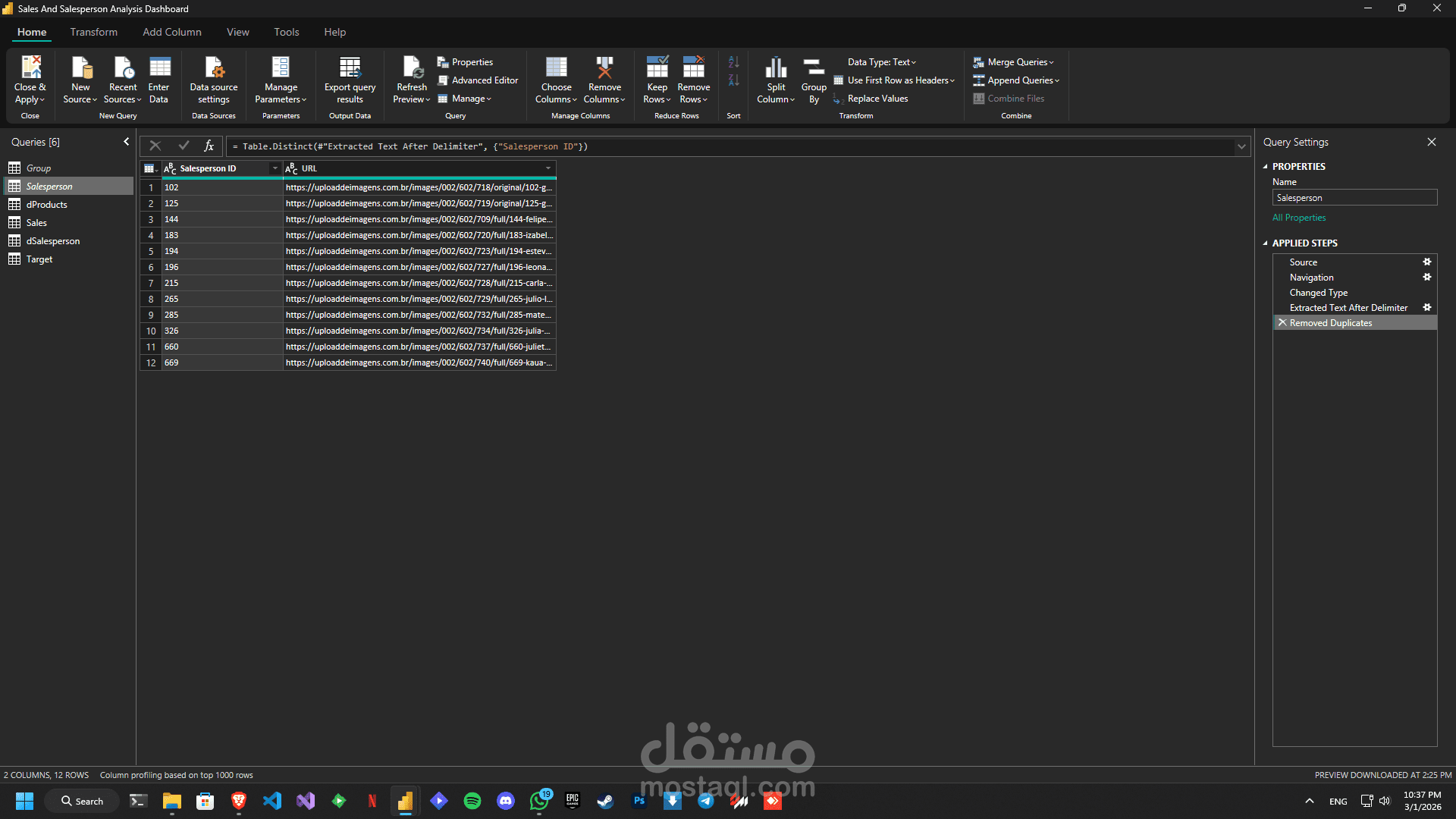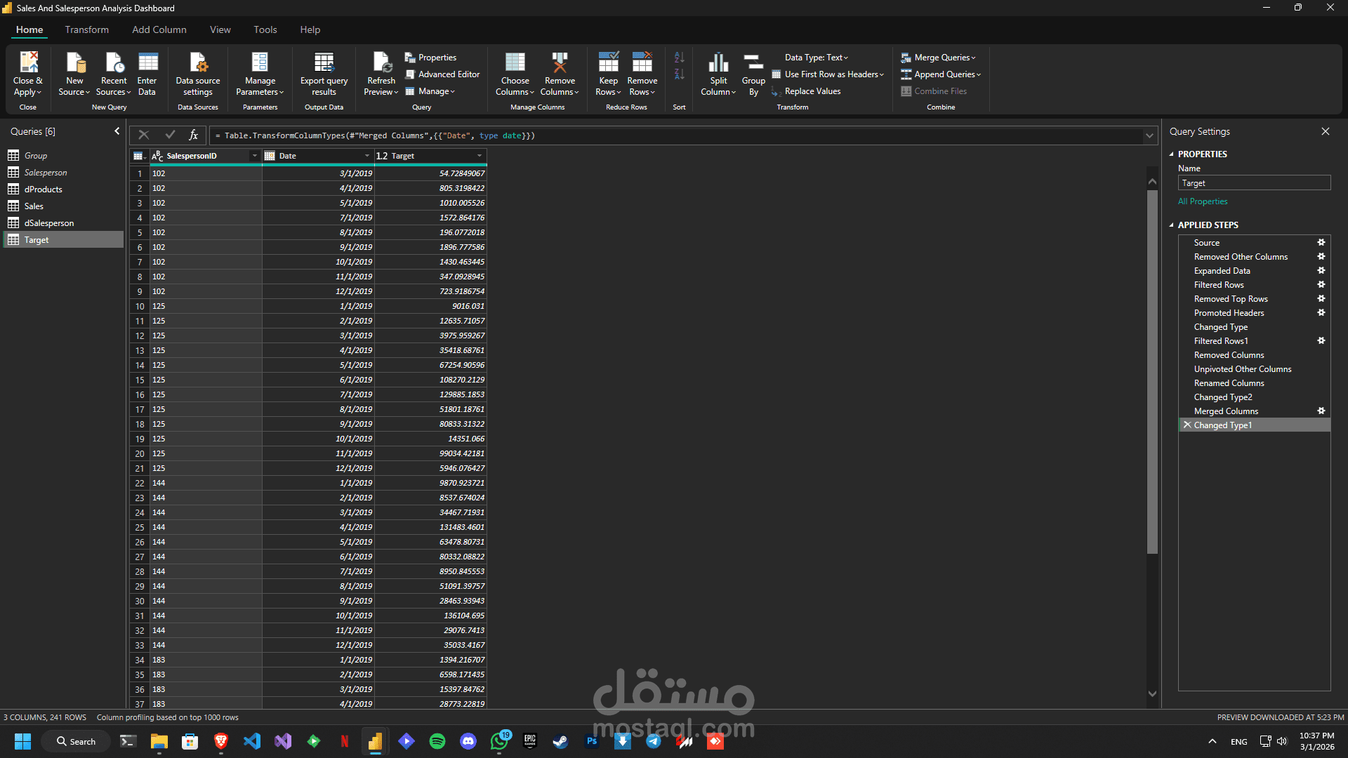في مرحلة تنظيف ومعالجة البيانات باستخدام Power Query تم العمل على تنظيم البيانات وتحسين جودتها قبل البدء في التحليل، حيث تم تصحيح أنواع البيانات، وإزالة السجلات غير الضرورية، ومعالجة القيم المفقودة، وإزالة التكرارات، بالإضافة إلى استخدام بعض التحويلات مثل Merge Queries لربط الجداول، وعمليات Pivot / Unpivot عند الحاجة لإعادة تنظيم البيانات بشكل مناسب للتحليل، مما ساعد على تجهيز البيانات في صورة نظيفة وواضحة.