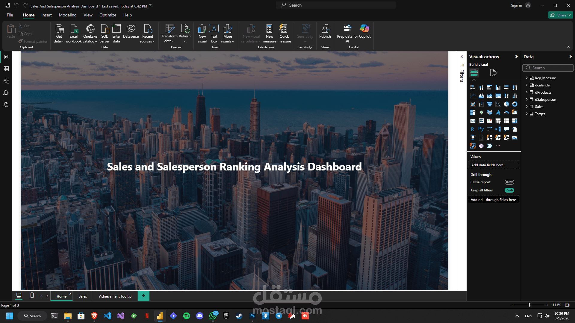 تم إنشاء مجموعة من المقاييس باستخدام DAX لتحليل الأداء بشكل دقيق، حيث تم حساب إجمالي الإيرادات (Revenue)، وعدد الطلبات (Orders)، ومتوسط قيمة العملية (ATP)، بالإضافة إلى مقاييس خاصة بترتيب مندوبي البيع Ranking، وكذلك مقاييس لمقارنة الأداء الفعلي مقابل الأهداف الشهرية Targets، وتحليل الأداء عبر الفترات الزمنية المختلفة مثل الربع السنوي والسنة.