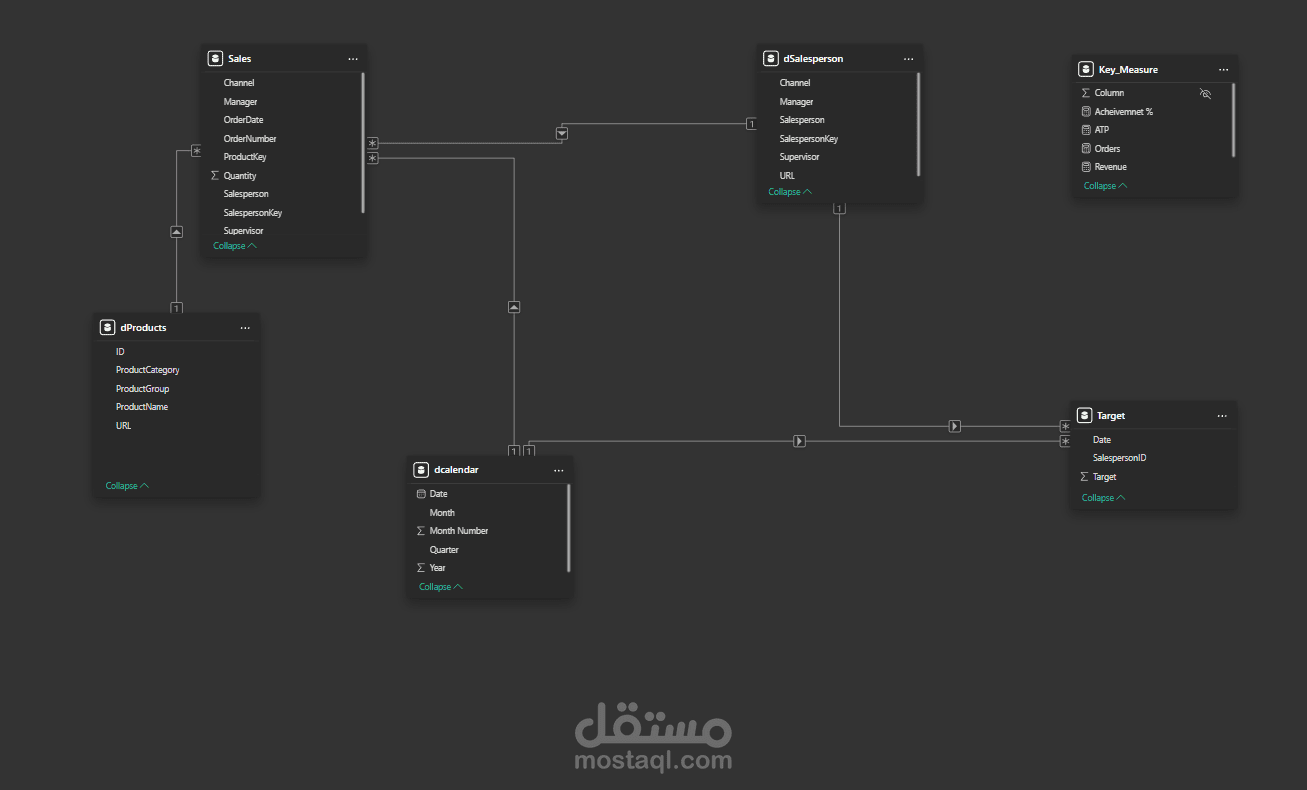 بعد ذلك تم بناء نموذج البيانات باستخدام أسلوب Star Schema، حيث تم استخدام جدول Sales كجدول Fact يحتوي على بيانات المعاملات الأساسية مثل تاريخ الطلب، رقم الطلب، المنتج، الكمية، ومندوب البيع، مع إنشاء جداول Dimension مثل جدول المنتجات dProducts، وجدول مندوبي البيع dSalesperson، وجدول التاريخ dCalendar، بالإضافة إلى جدول Target الخاص بالأهداف الشهرية لمندوبي البيع. وتم ربط الجداول باستخدام علاقات One-to-Many بشكل صحيح لضمان دقة الفلاتر أثناء التحليل.