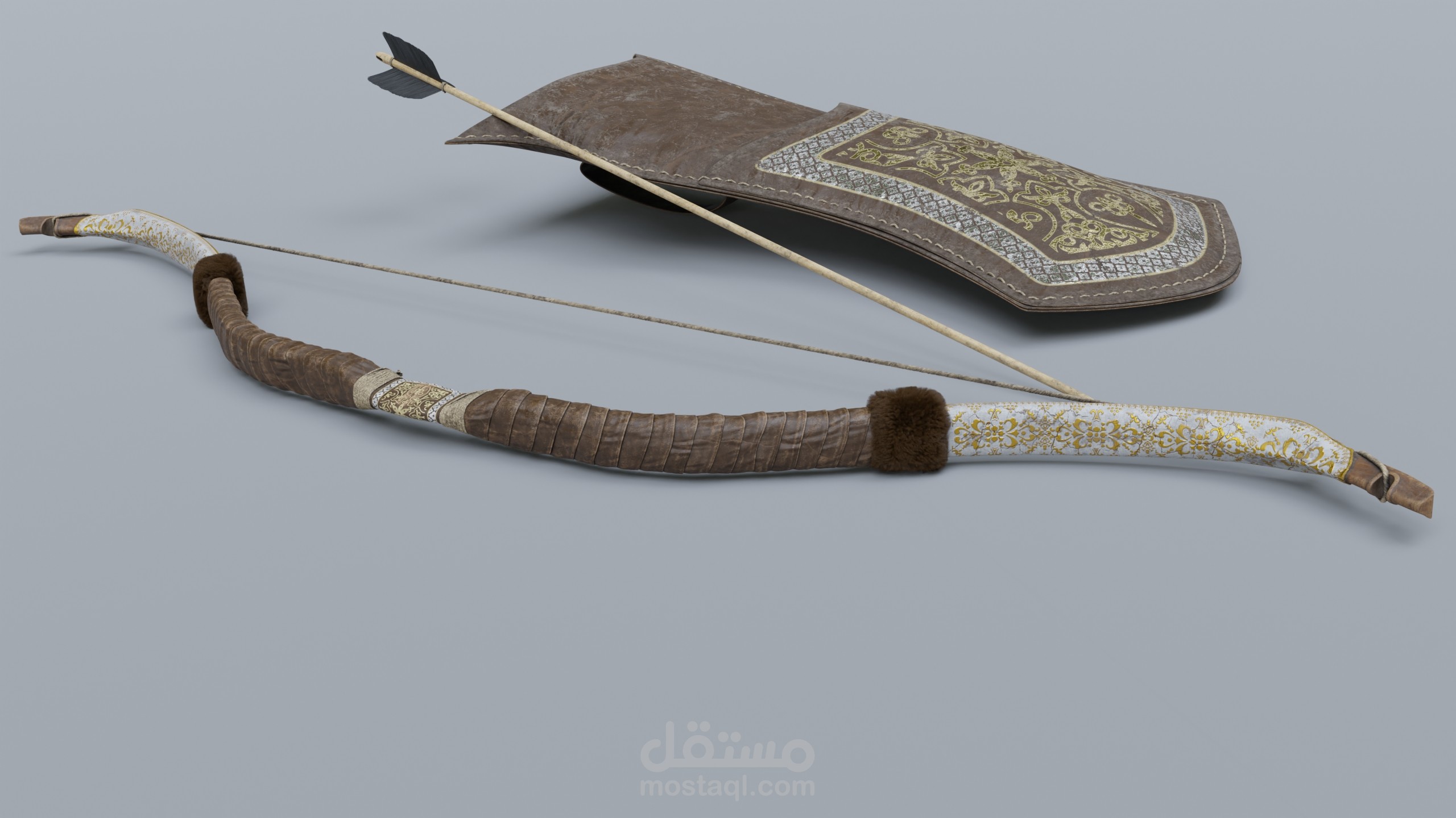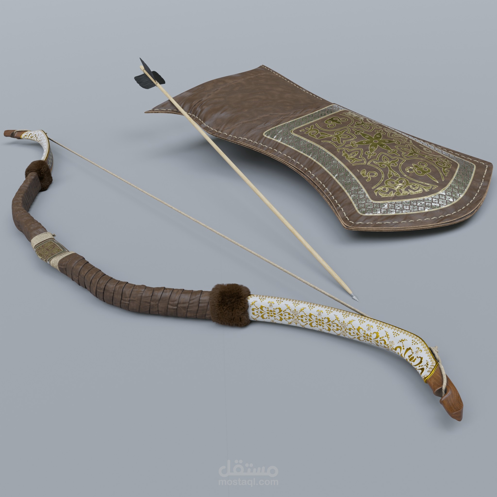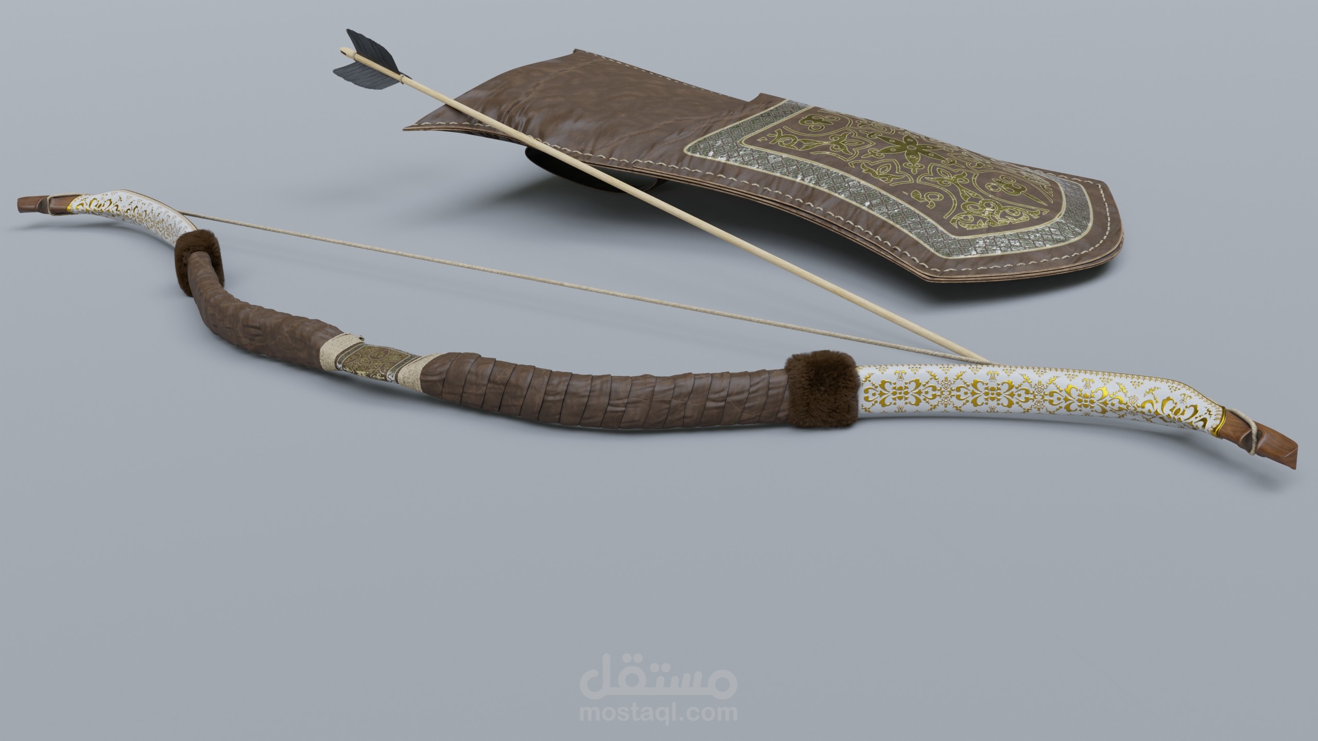 أمامك نموذج مجموعة قوس وسهم شرقية ثلاثي الأبعاد بتفاصيل واقعية عالية الجودة، يعكس براعة التصميم والحرفية الدقيقة في تمثيل أحد أهم أدوات الصيد والحرب في التاريخ الإسلامي والعربي القديم.