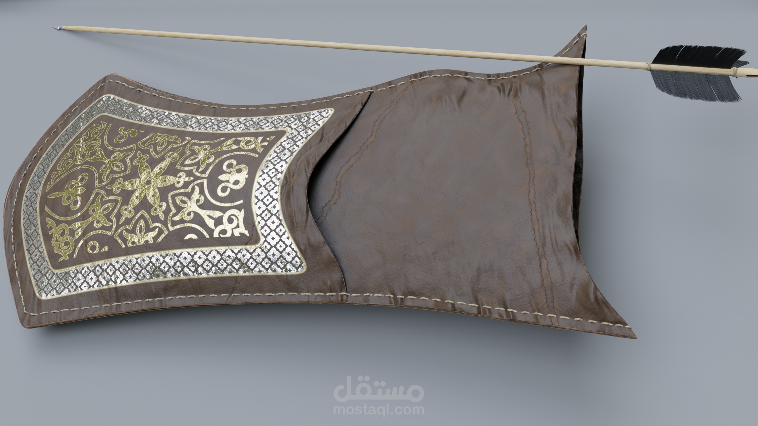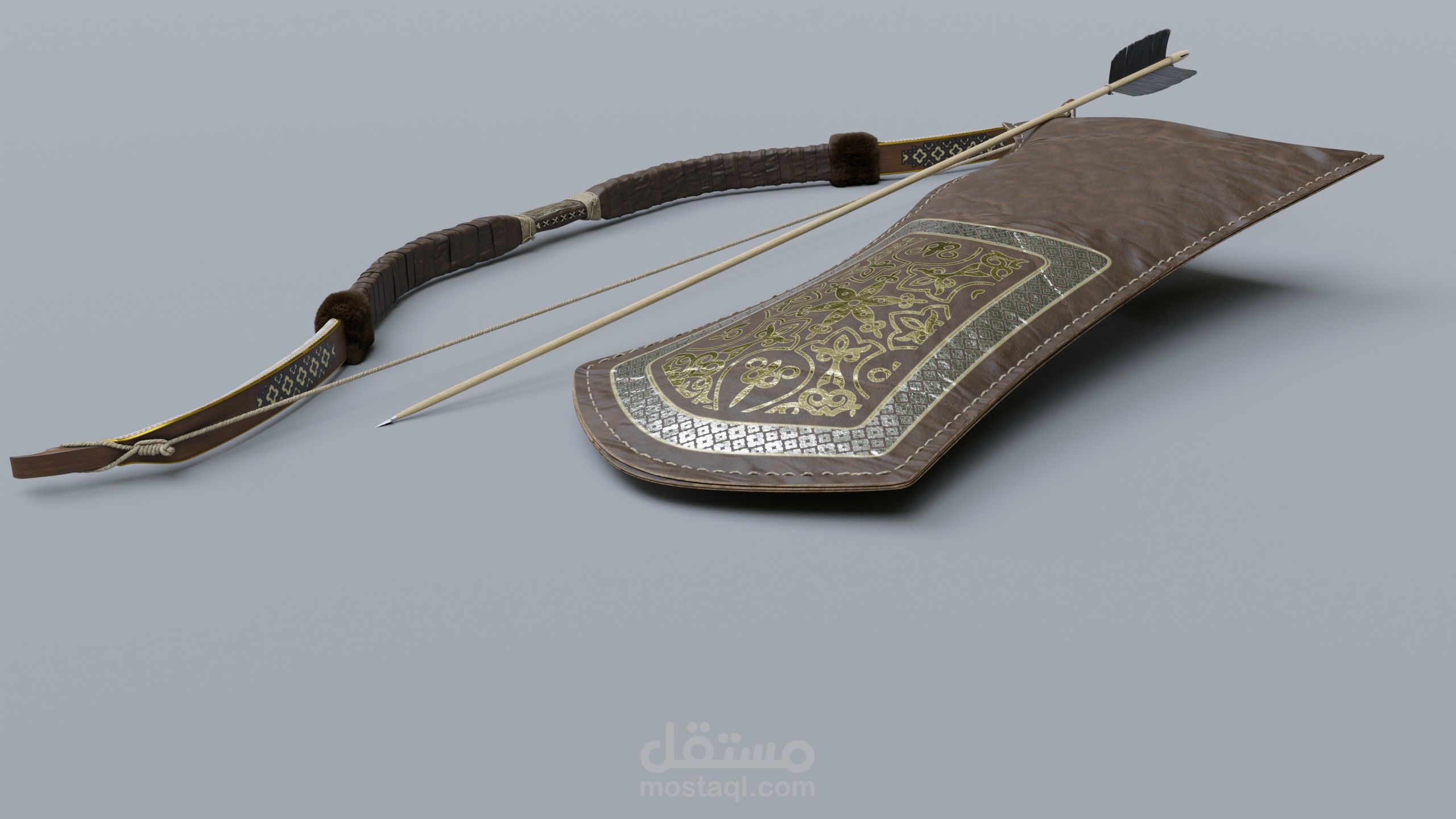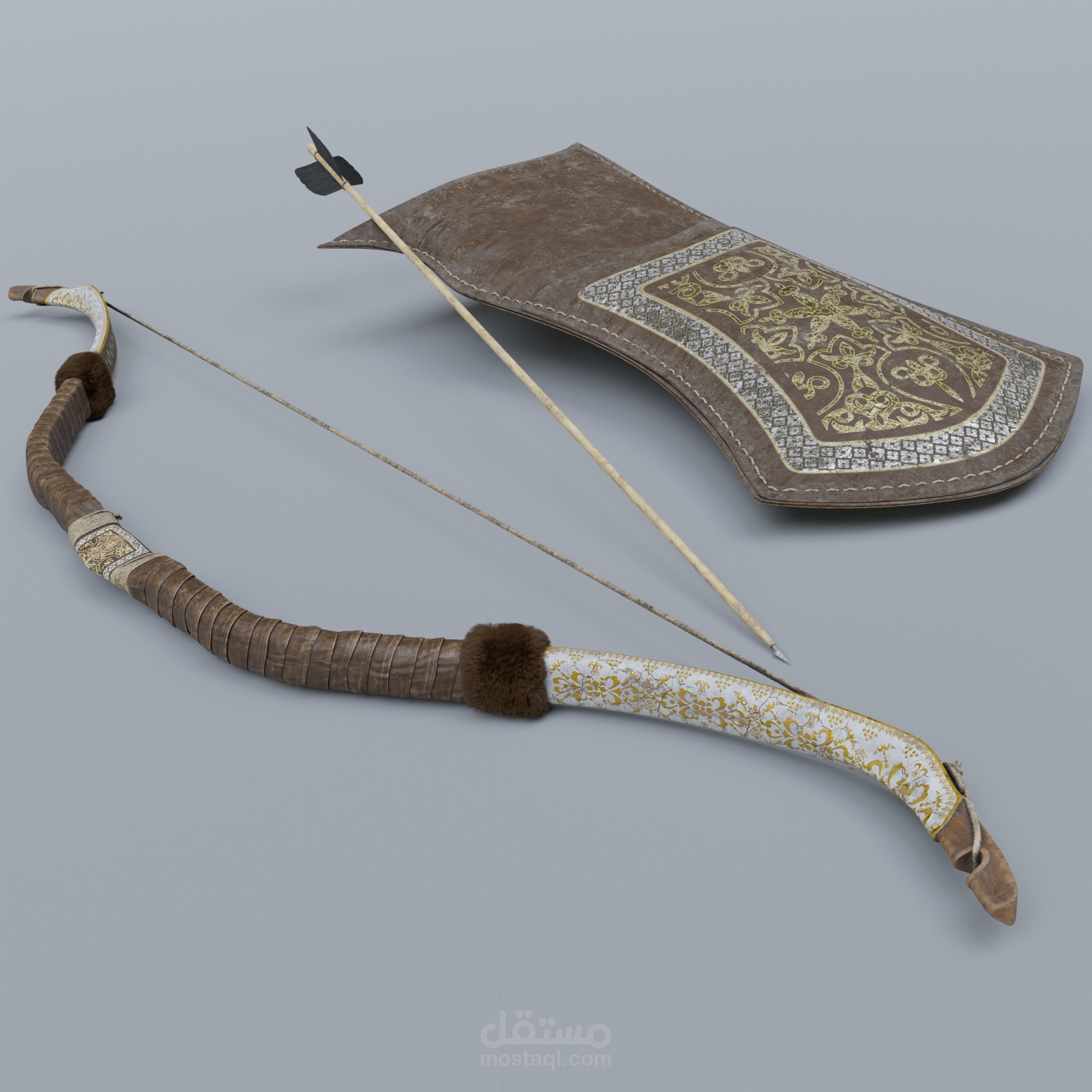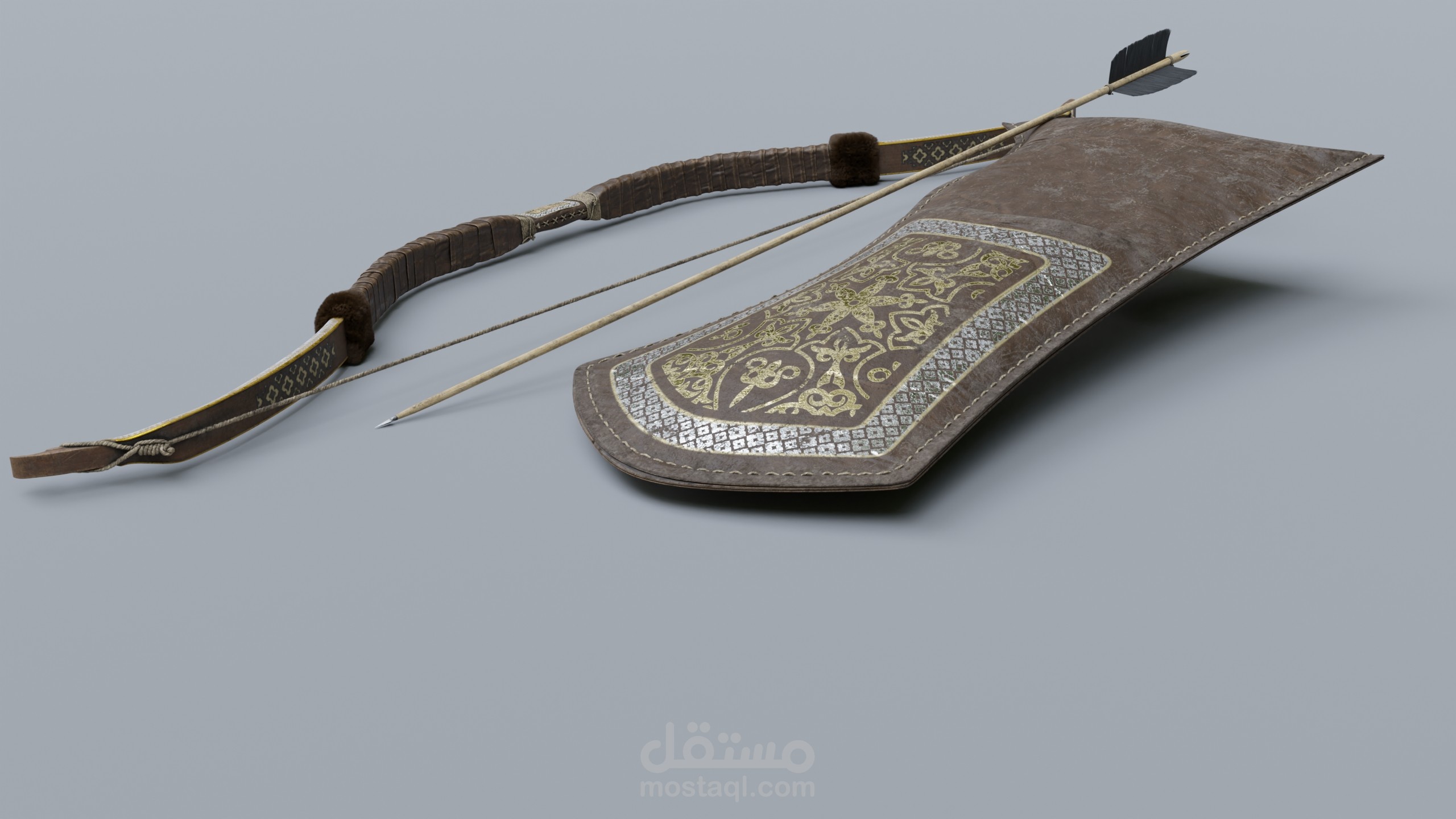 أمامك نموذج مجموعة قوس وسهم شرقية ثلاثي الأبعاد بتفاصيل واقعية عالية الجودة، يعكس براعة التصميم والحرفية الدقيقة في تمثيل أحد أهم أدوات الصيد والحرب في التاريخ الإسلامي والعربي القديم.