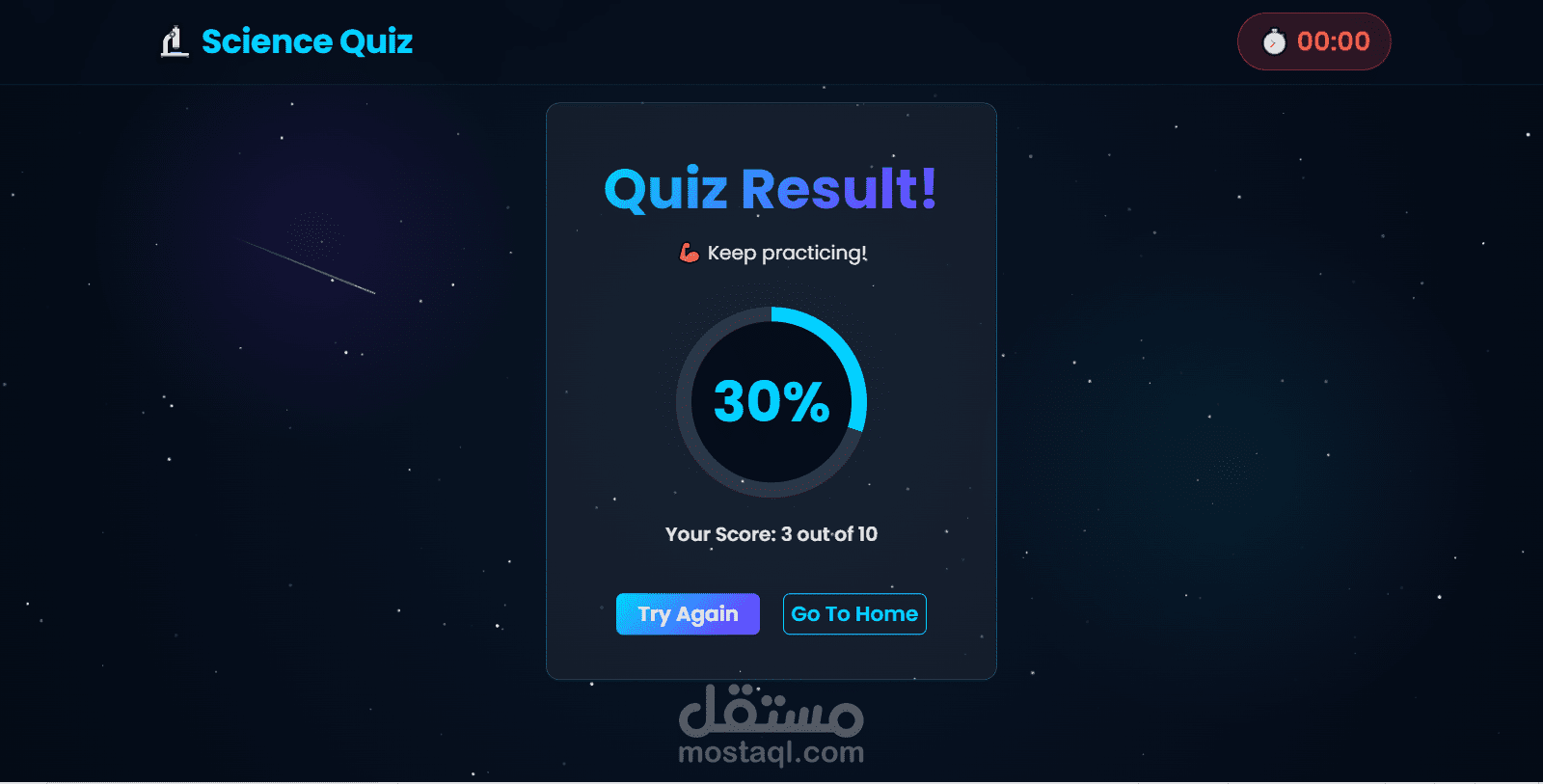 يحتوي على 10 أسئلة علمية متنوعة تغطي الفيزياء والكيمياء وعلم الأحياء، مع مؤقت زمني يعرض الوقت المتبقي في الـ header ويظهر شريط تقدم داخل الاختبار. عند انتهاء الإجابة يظهر تقرير النتيجة مع نسبة مئوية.