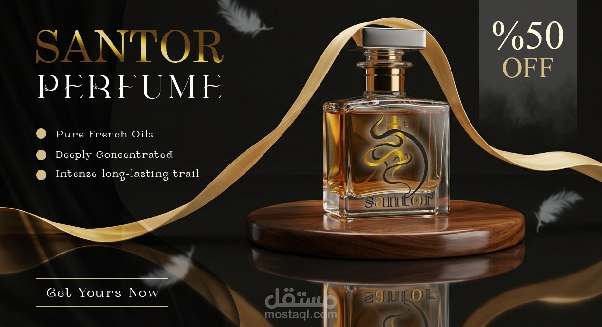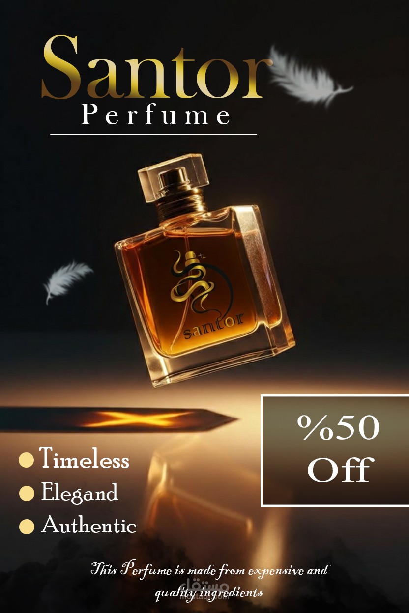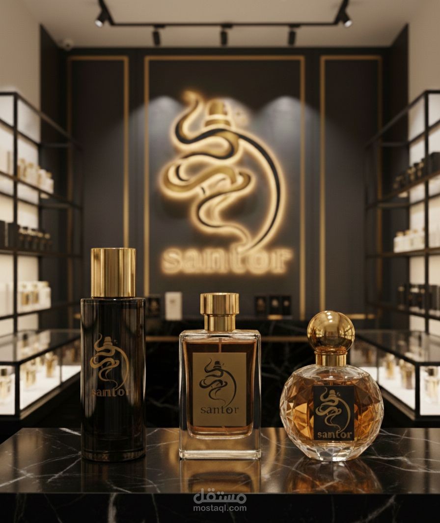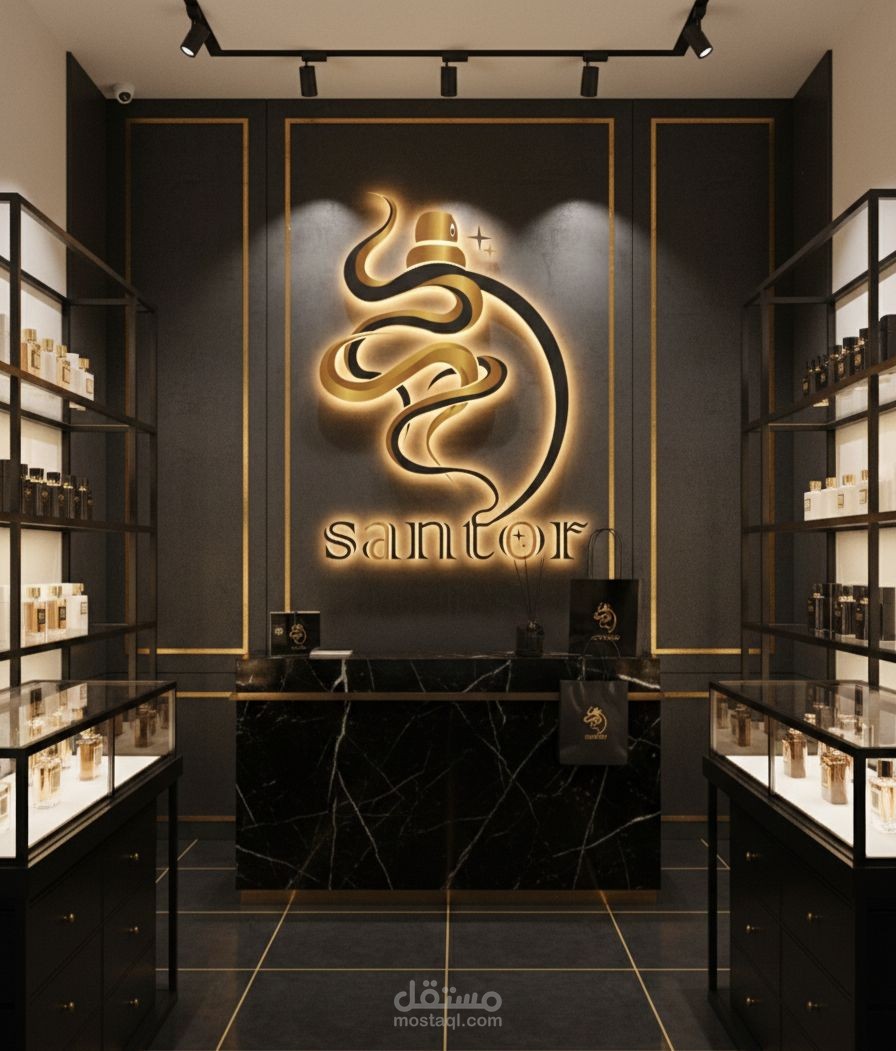 دا تصميم شعار لمحل عطور اسمه Santor .. بيشرح هذا التصميم هوية علامة عطور فاخرة مستوحاة من الفخامة الشرقية والانسيابية الراقية. تم بناء الشعار على خطوط منحنية متداخلة ترمز إلى انتشار العطر في الهواء، مع تكوين بصري يوحي بزجاجة عطر أنيقة تعبر عن الرقي والجاذبية.