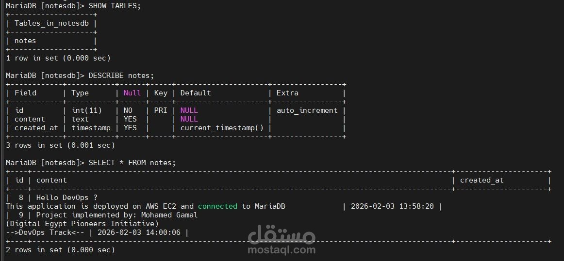 قمت بتطوير ونشر تطبيق ويب لتدوين الملاحظات باستخدام لغة Python وإطار العمل Flask مع قاعدة بيانات MariaDB على خادم Linux عبر منصة AWS EC2. يتيح التطبيق للمستخدمين إضافة وحفظ وعرض الملاحظات من خلال واجهة ويب بسيطة وسهلة الاستخدام.