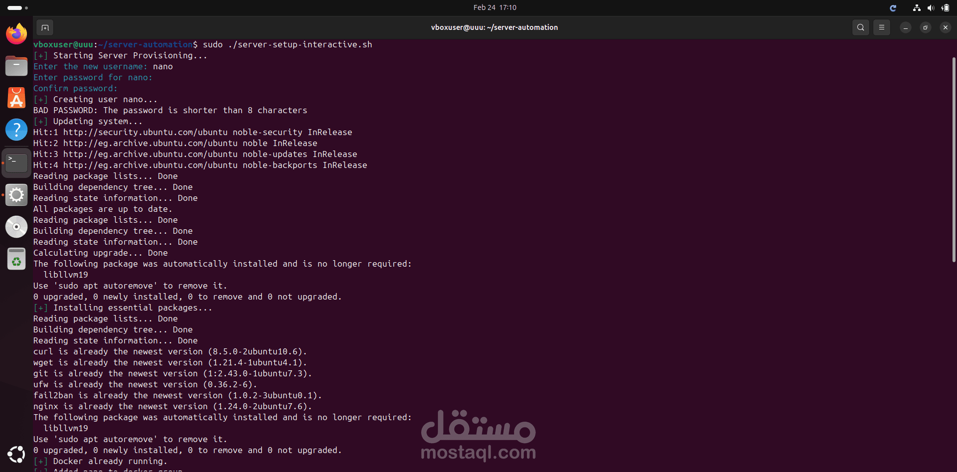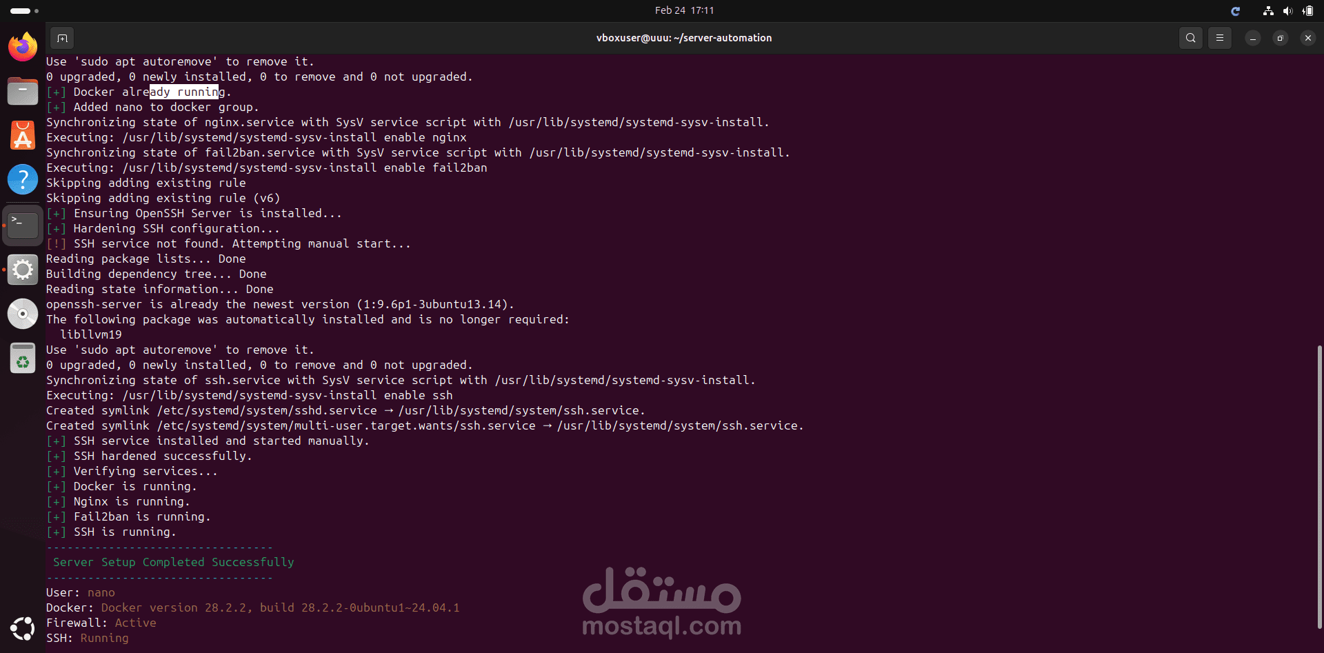 Configures Docker, Nginx, Fail2Ban, UFW firewall, and OpenSSH with security hardening and idempotent execution. Designed to simulate real-world DevOps server setup workflows.