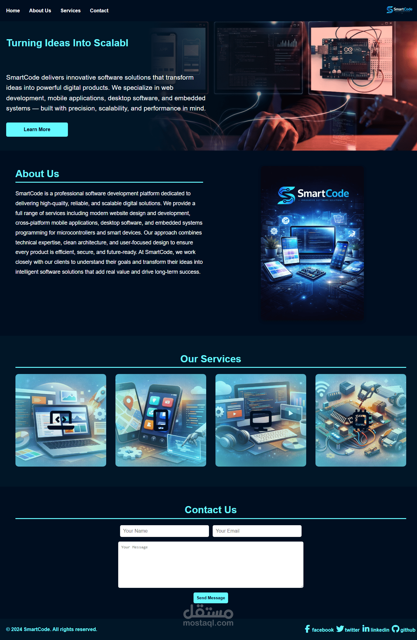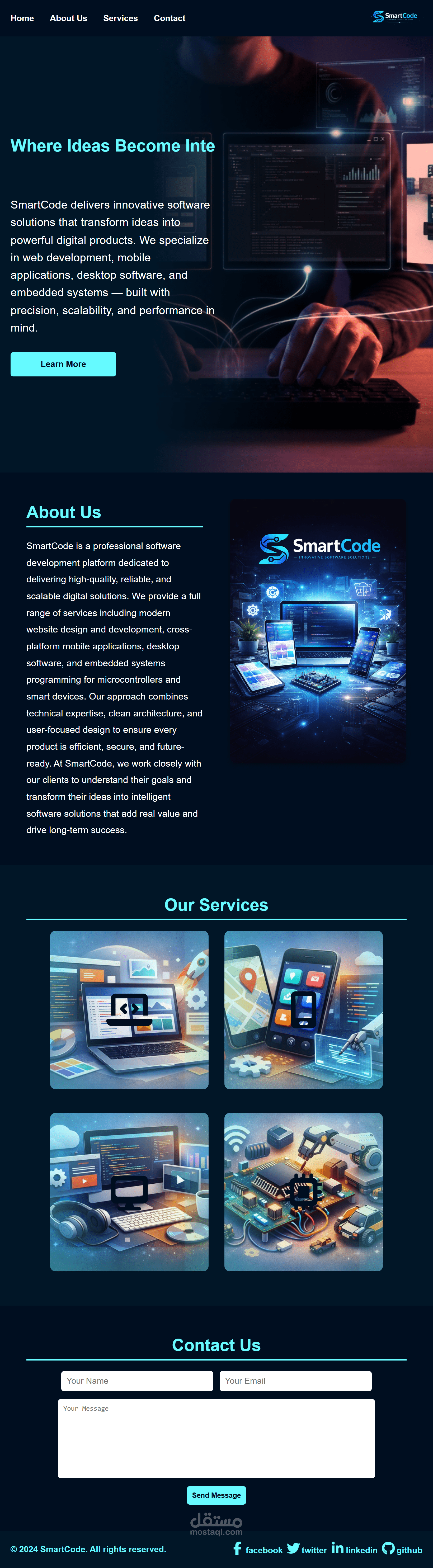 تطوير واجهة مستخدم (Front-End) احترافية وعصرية لمنصة SmartCode المتخصصة في الحلول البرمجية الذكية. يهدف المشروع إلى استعراض خدمات تقنية متنوعة تشمل تطوير الويب، تطبيقات الهاتف، والبرمجيات المدمجة (Embedded Systems) من خلال تجربة بصرية تفاعلية تعتمد على الأداء العالي والتصميم المستقبلي (Dark Theme).