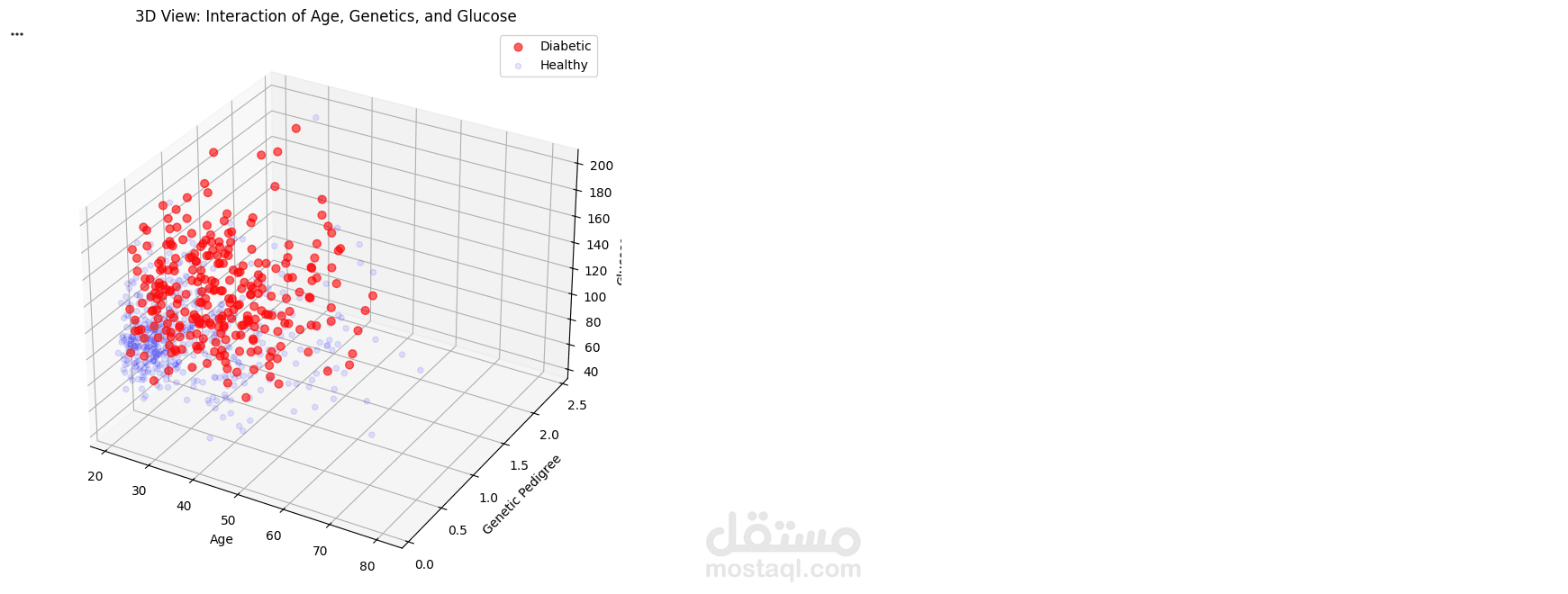 الجانب التقني: تضمن المشروع تحليل الارتباط (Correlation Heatmap)، وتحديد عتبات المخاطر لمؤشر كتلة الجسم (BMI)، وعمل عنقودية للمخاطر (3D Risk Clustering).