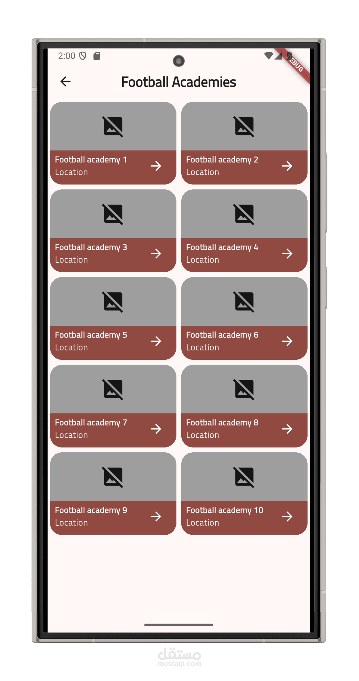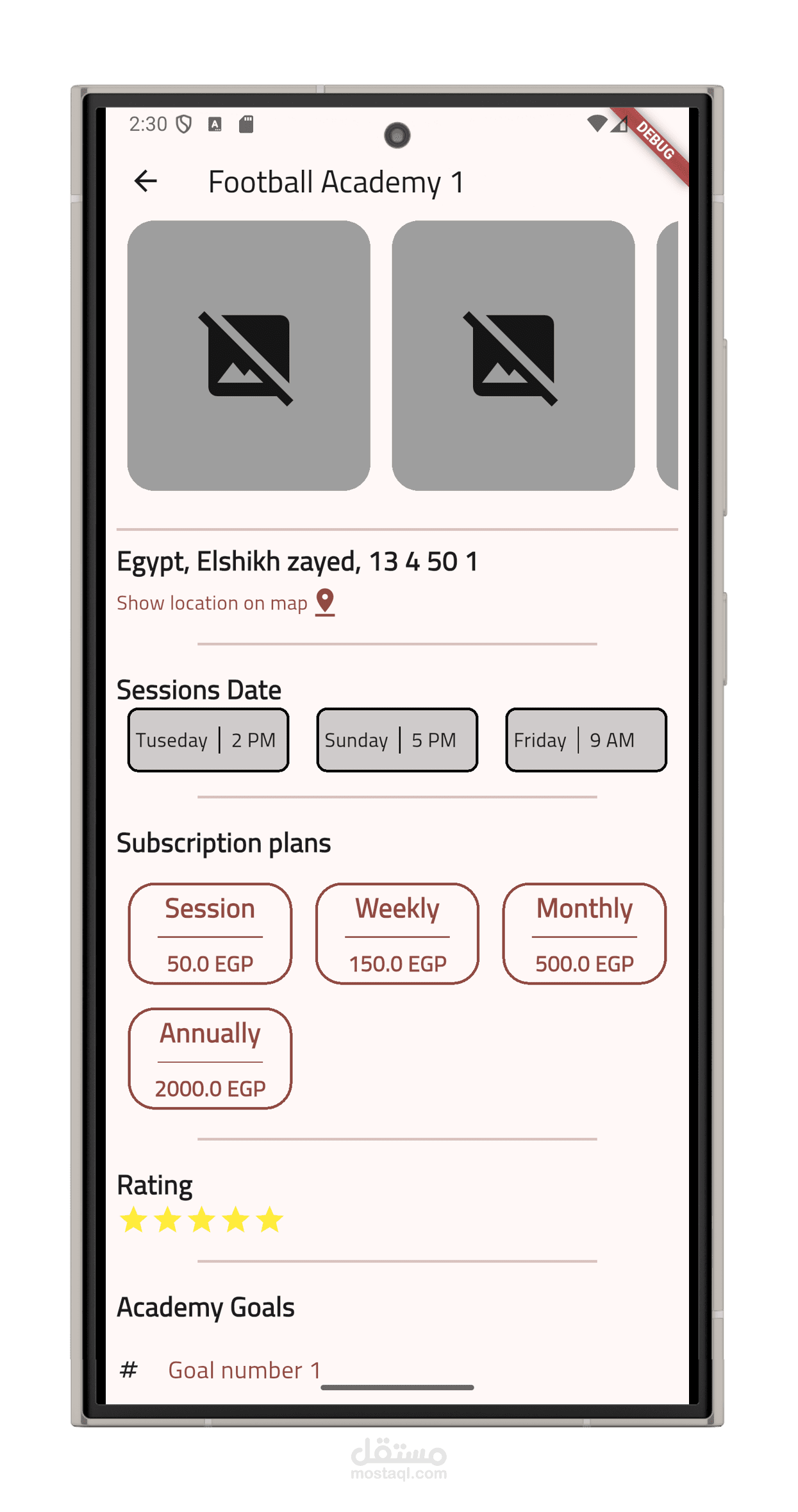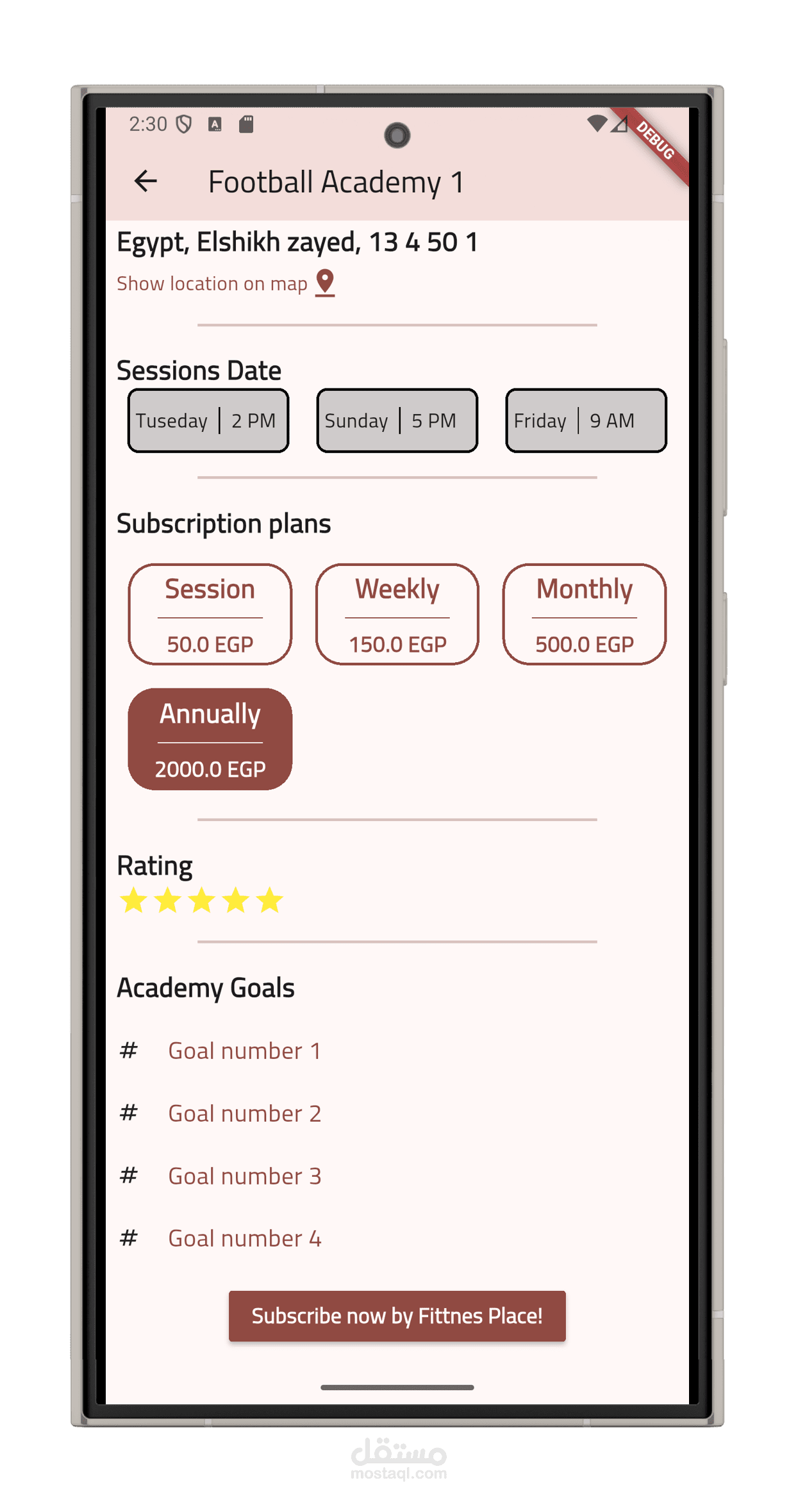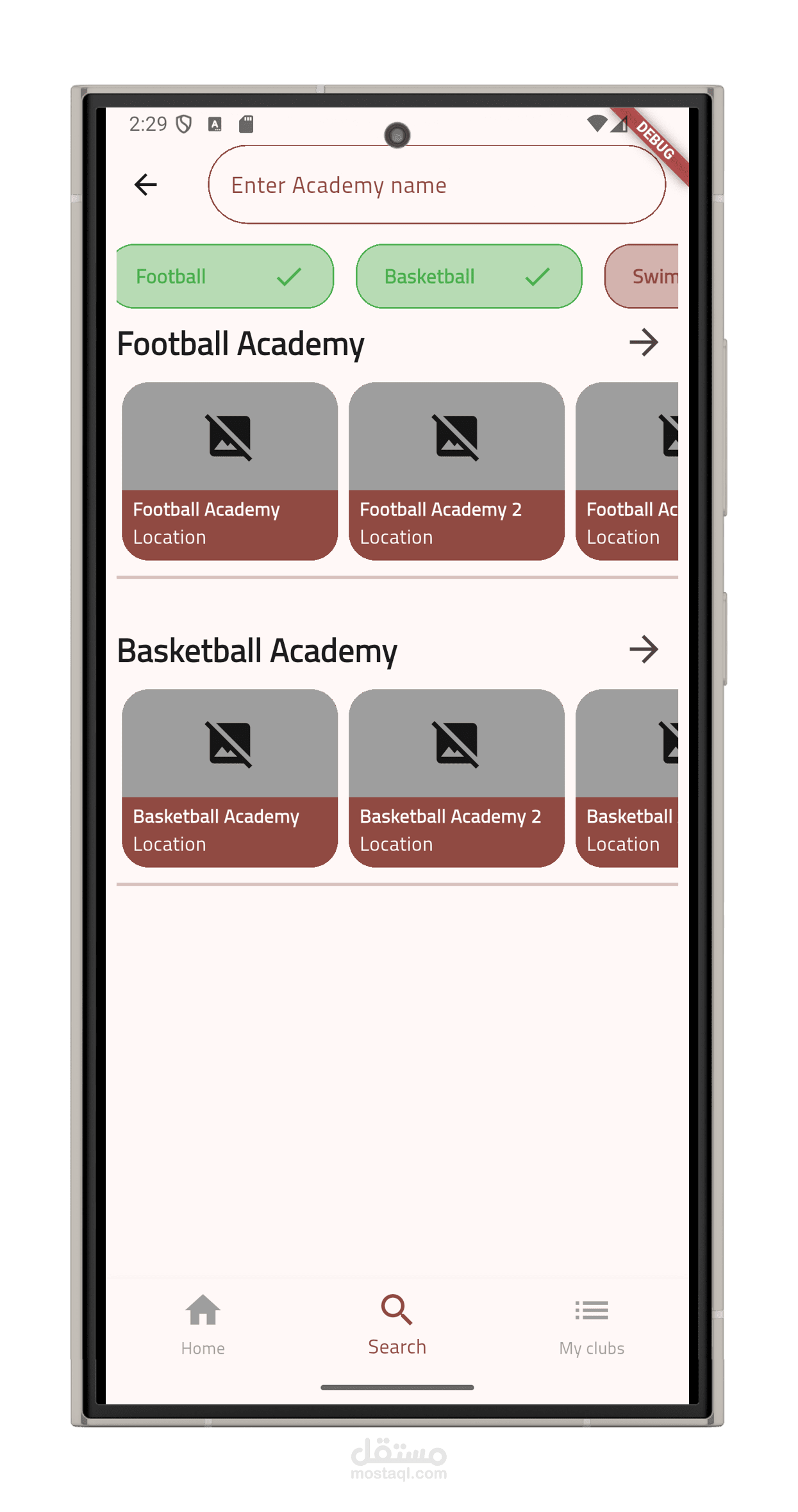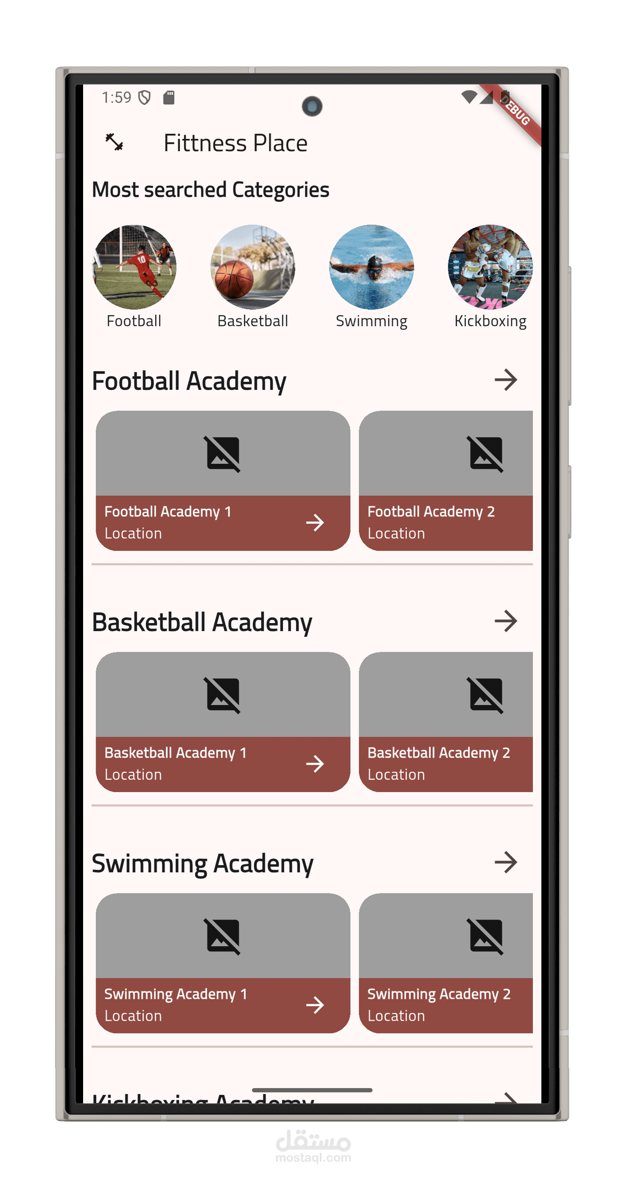 عرض الأكاديميات حسب الموقع: يمكن للمستخدم البحث عن أكاديميات قريبة منه باستخدام الخرائط أو البحث اليدوي حسب المدينة أو المنطقة.