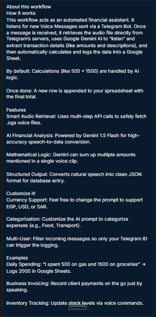 This workflow creates a seamless bridge between Telegram's Bot API and Google Sheets, powered by Google Gemini 1.5 Flash.