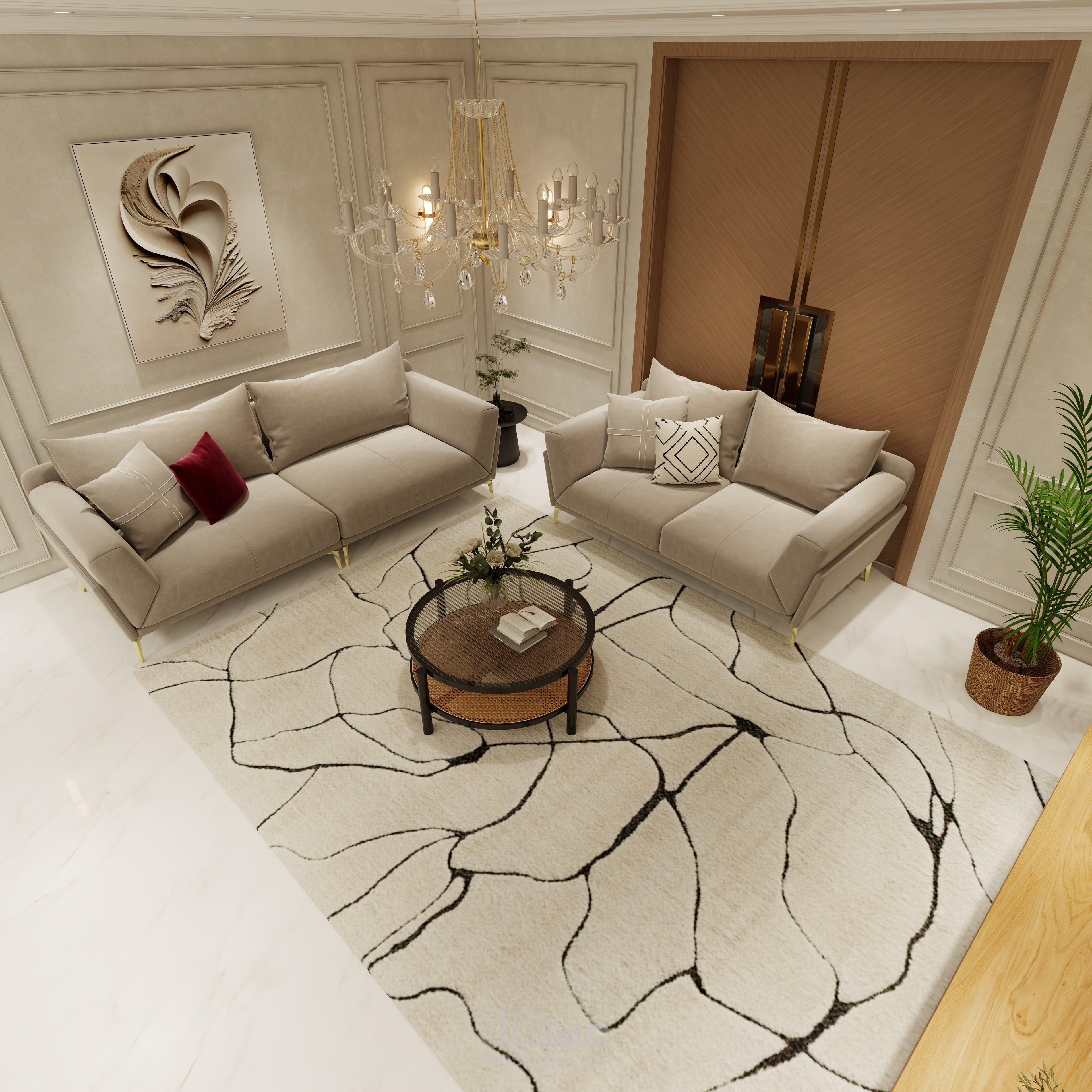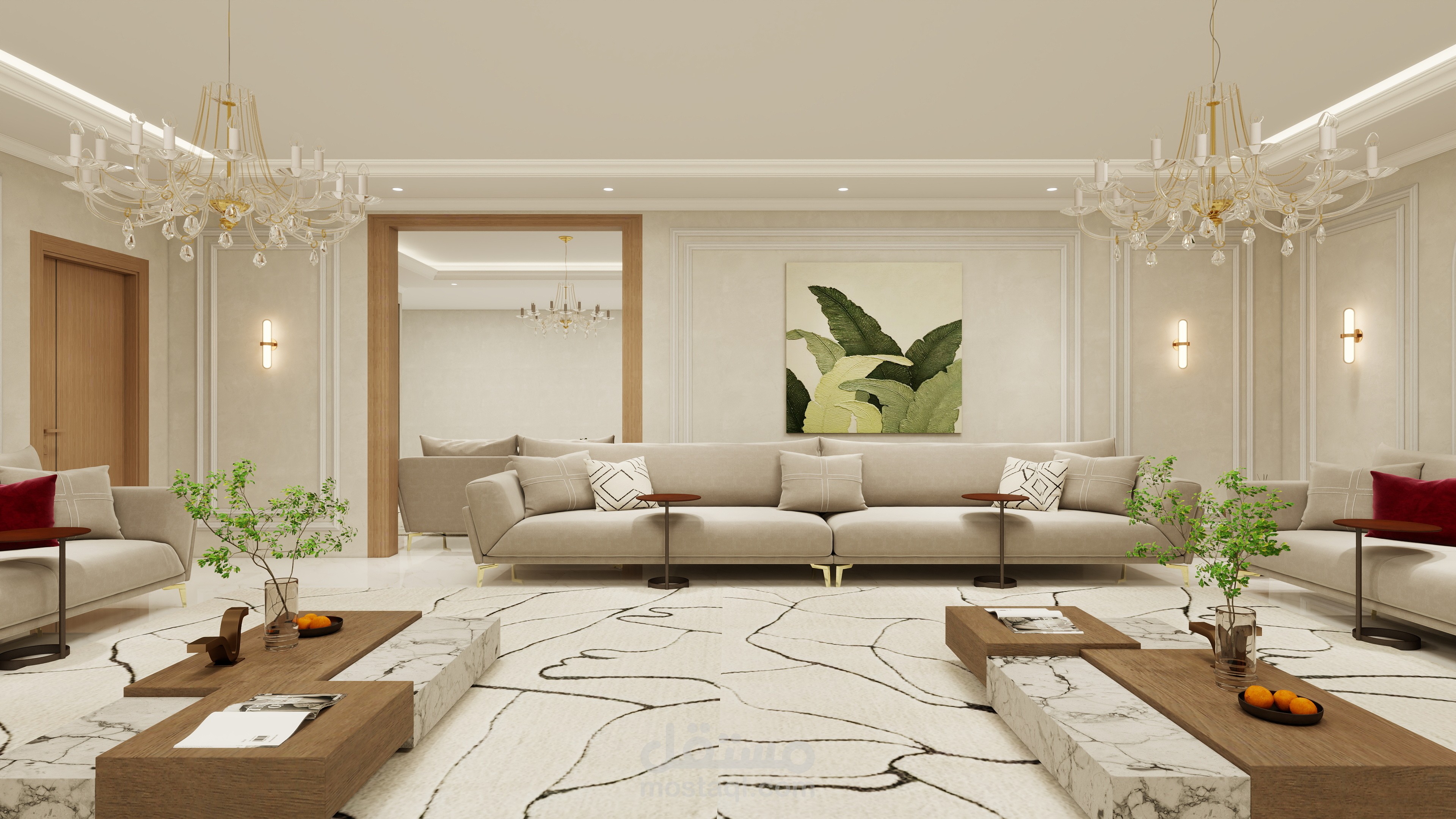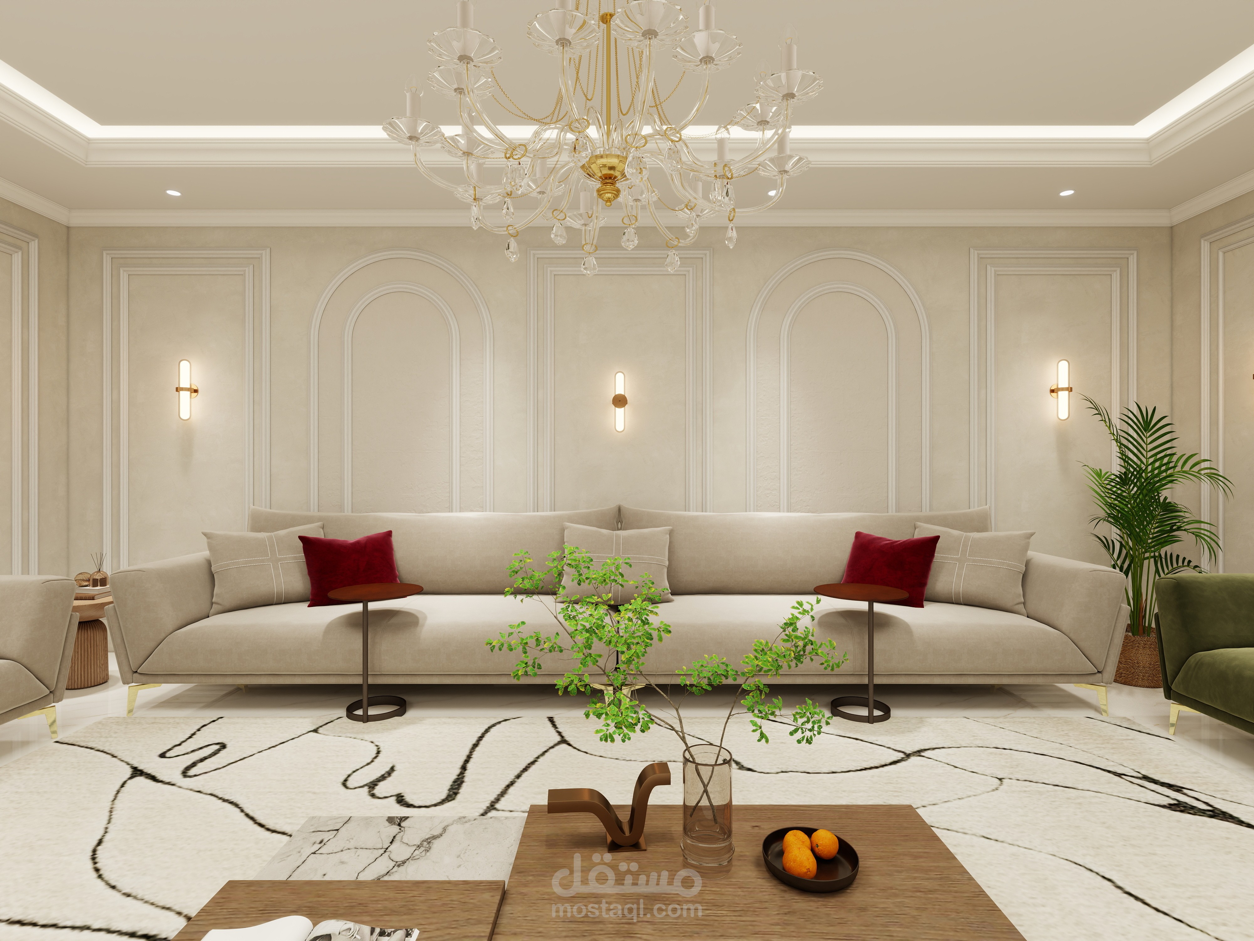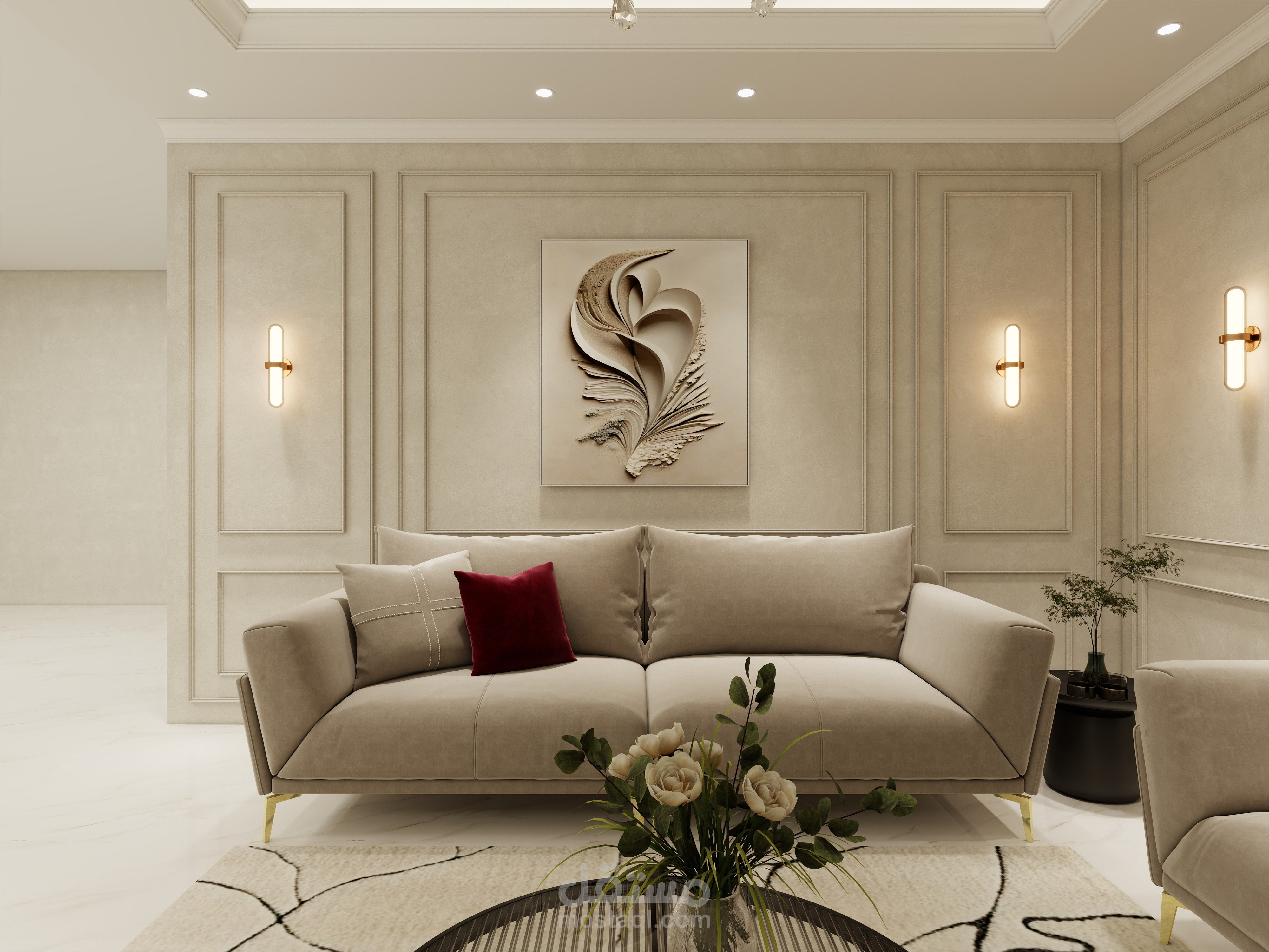 تصميم مجلس رجال يجمع بين الفخامة والأناقة مع لمسة عصرية تعكس الذوق الرفيع والكرم العربي الأصيل. تم اختيار ألوان هادئة وفخمة مثل البيج والرمادي مع تطعيمات ذهبية بسيطة تضيف إحساسًا بالرقي دون مبالغة.