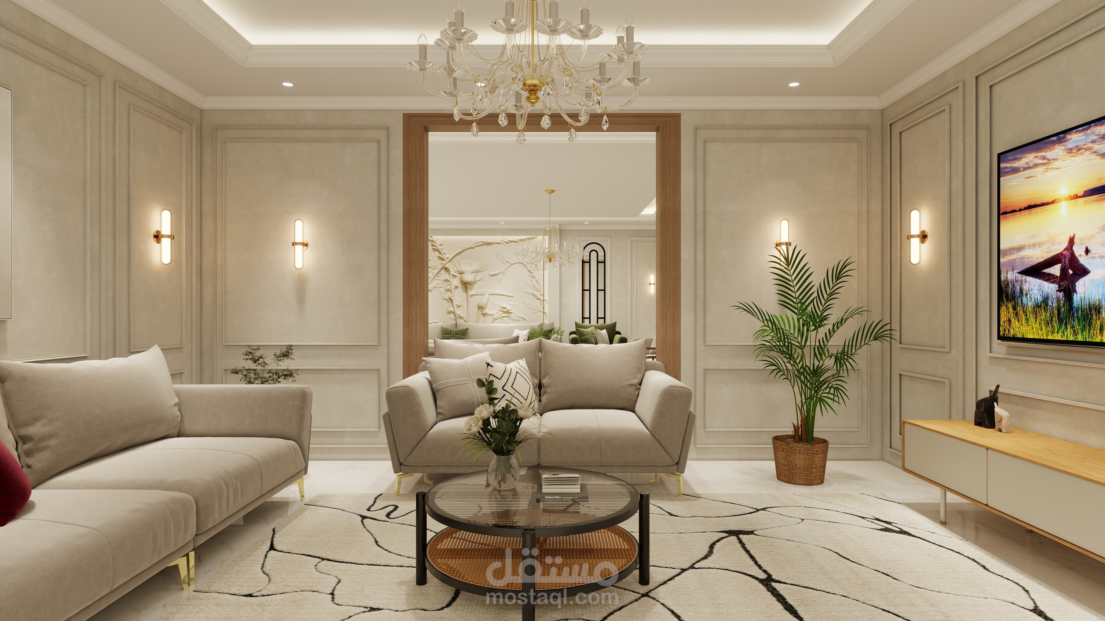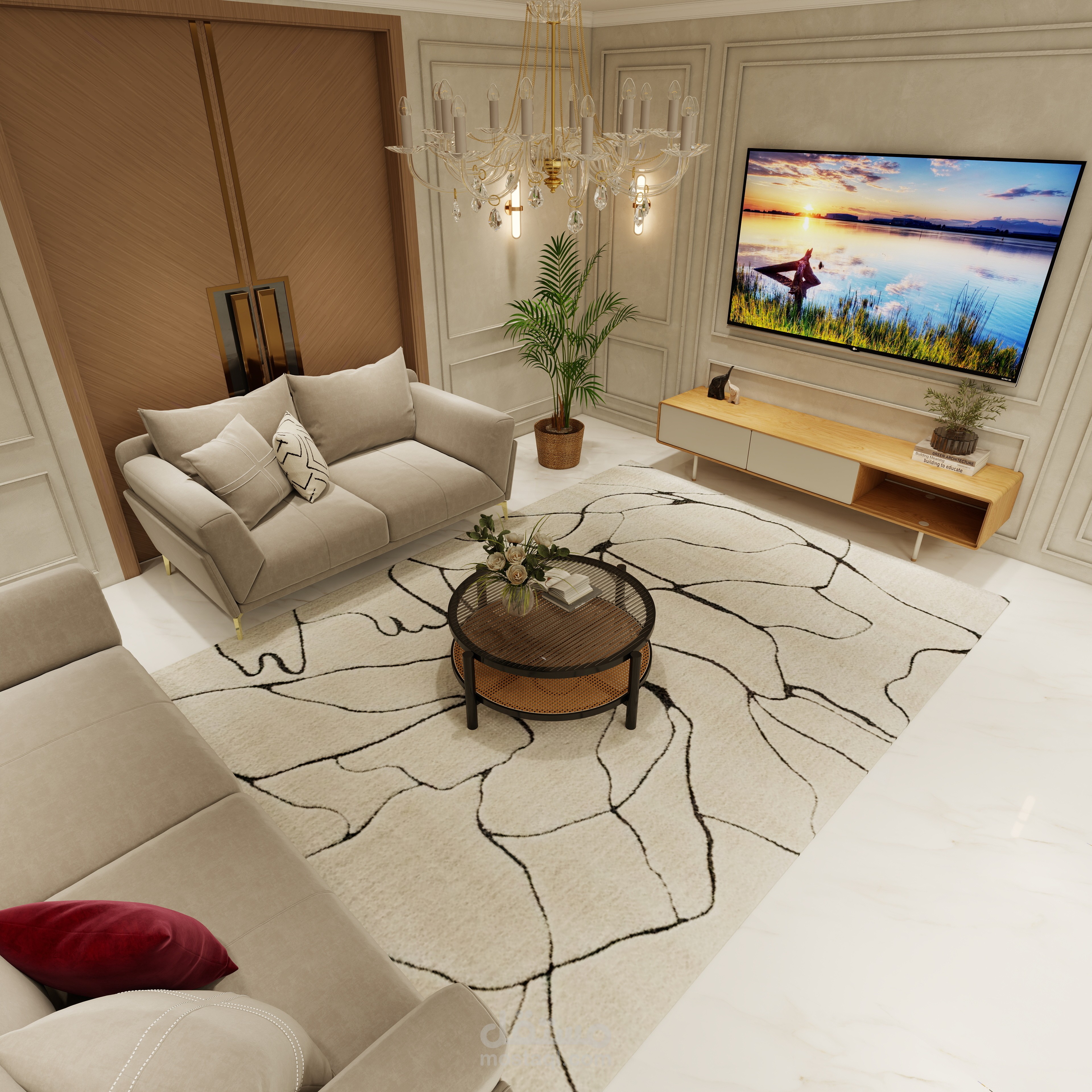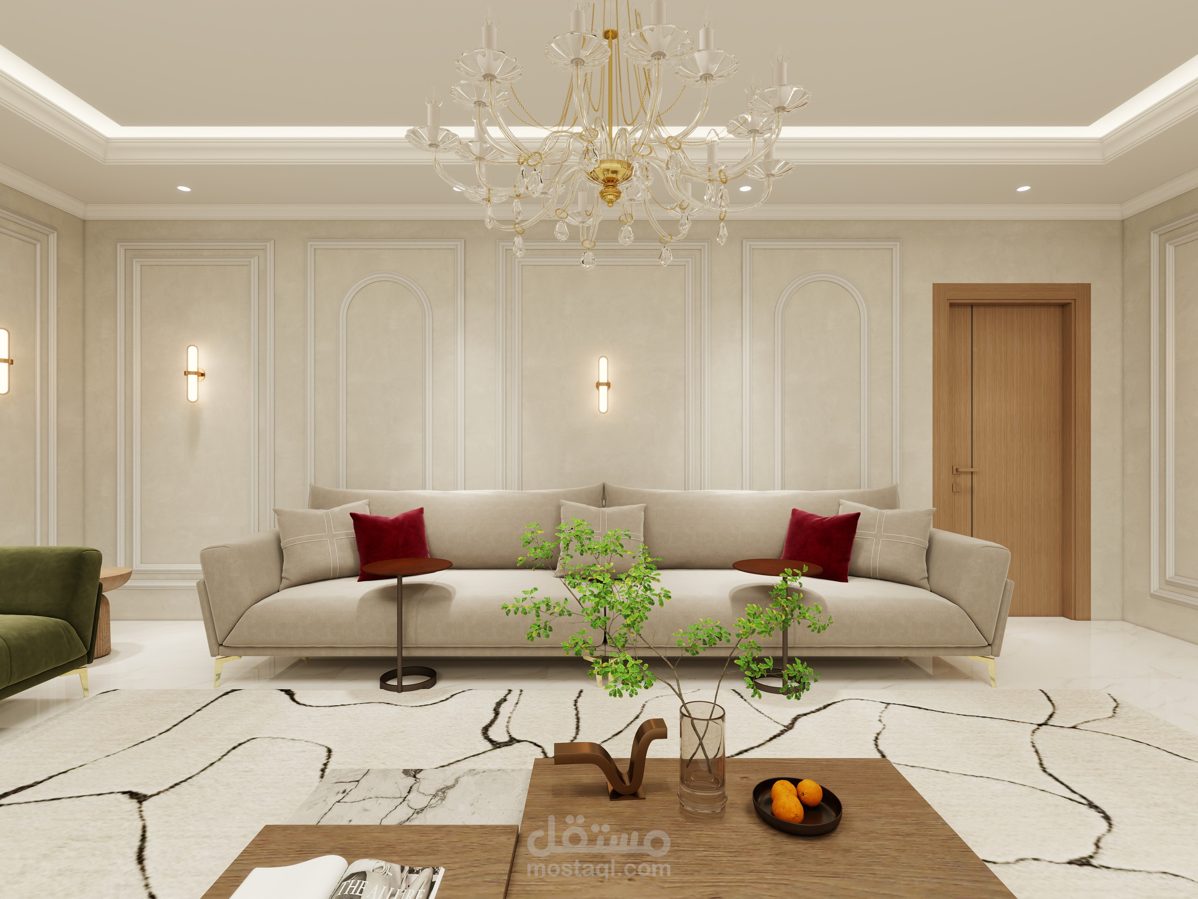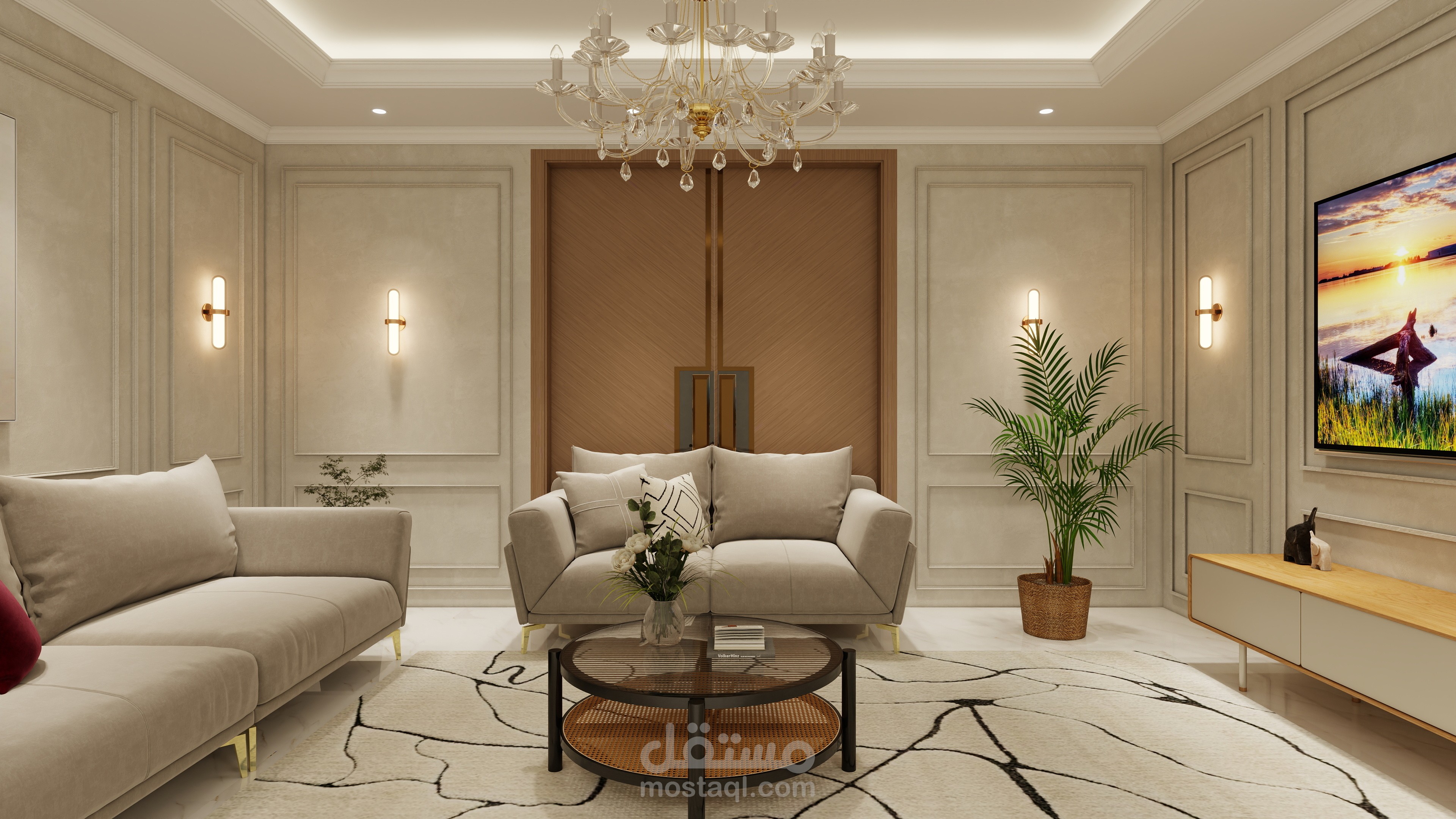 تصميم مجلس رجال يجمع بين الفخامة والأناقة مع لمسة عصرية تعكس الذوق الرفيع والكرم العربي الأصيل. تم اختيار ألوان هادئة وفخمة مثل البيج والرمادي مع تطعيمات ذهبية بسيطة تضيف إحساسًا بالرقي دون مبالغة.
