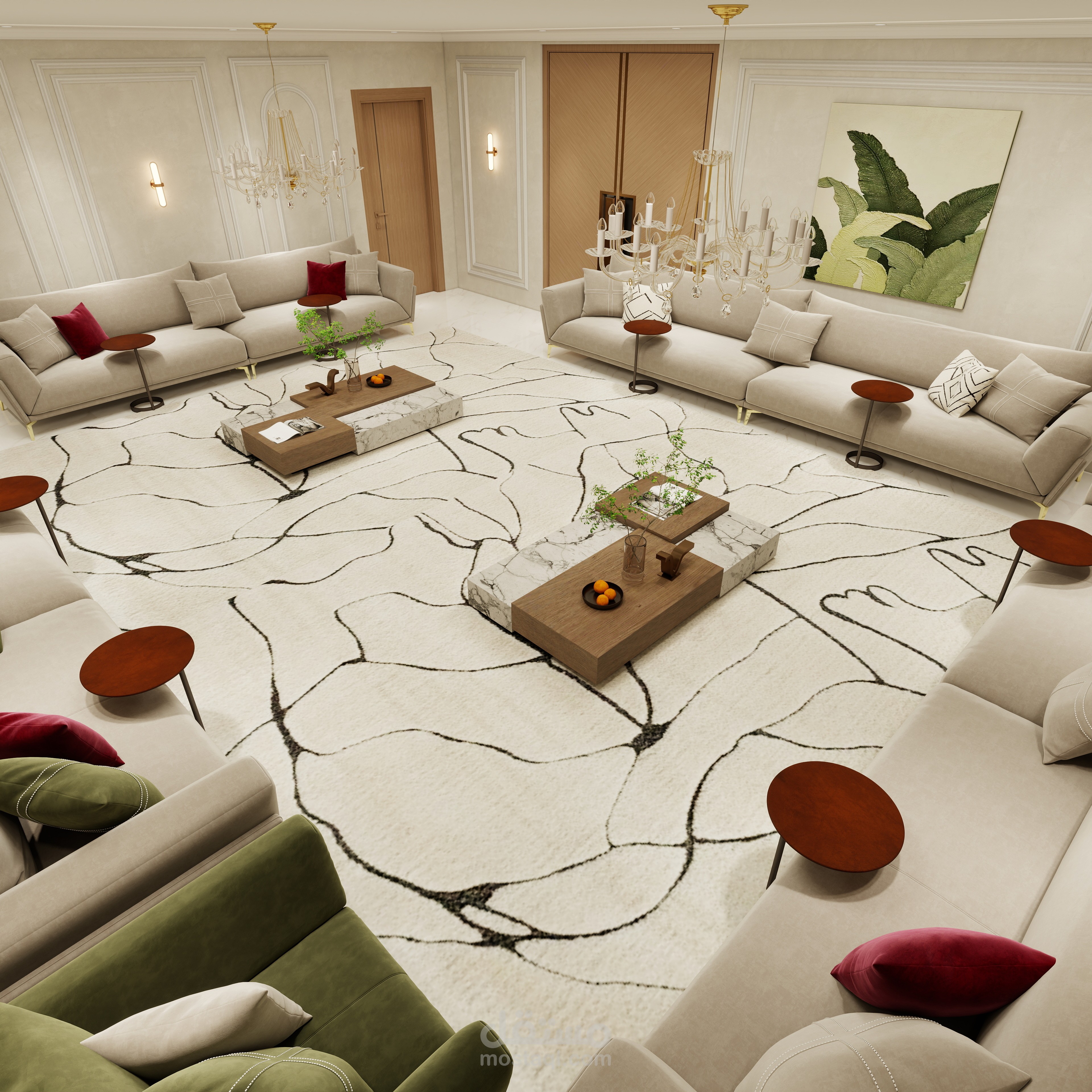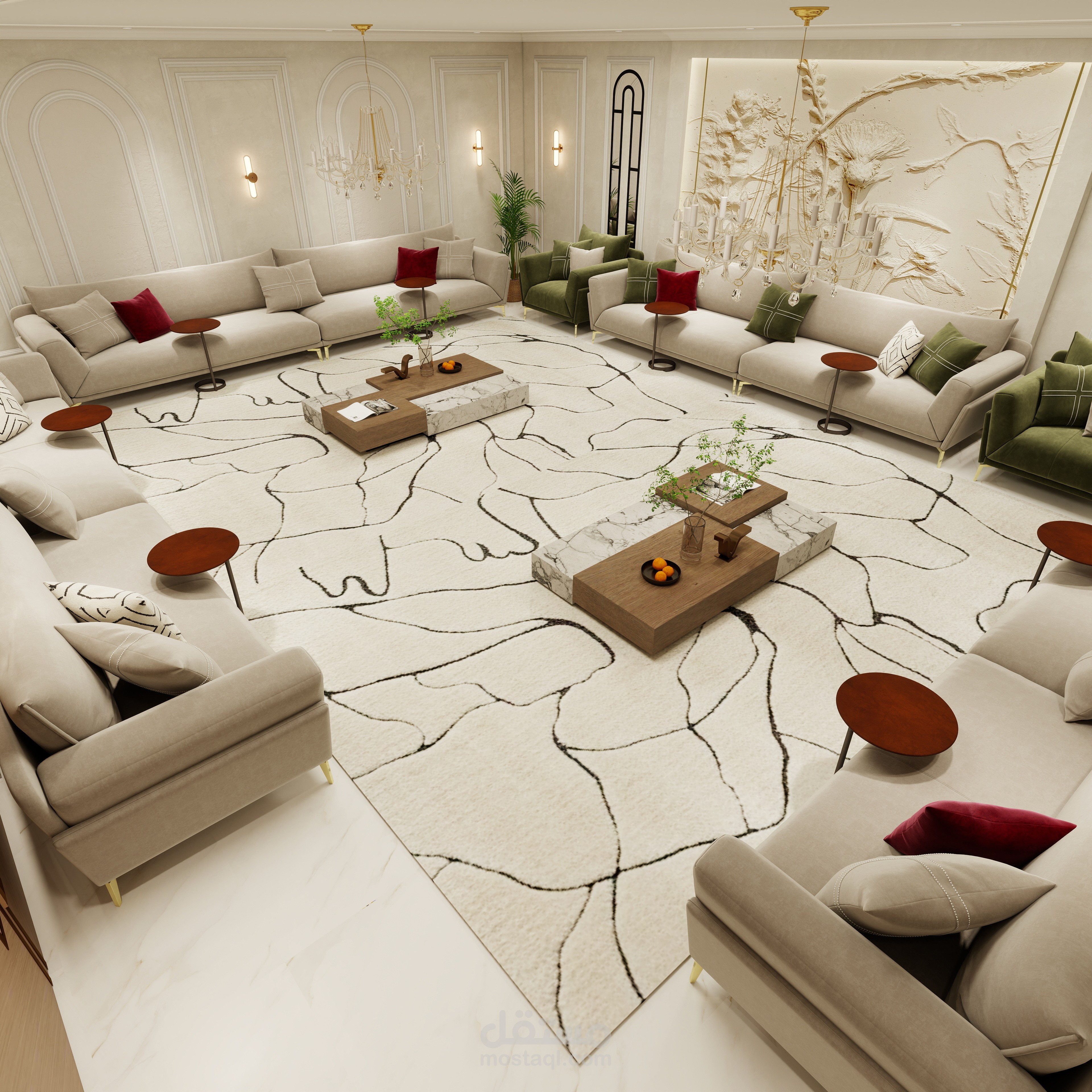 الأرضيات من الرخام الفاخر أو البورسلين كبير المقاس لتعطي اتساع بصري، مع سجادة مركزية بتصميم كلاسيكي يربط عناصر المجلس ببعضها. الجلسات مصممة بأقمشة راقية مثل المخمل أو الكتان الثقيل، مع وسائد بتفاصيل دقيقة تضيف عمقًا بصريًا للمكان.