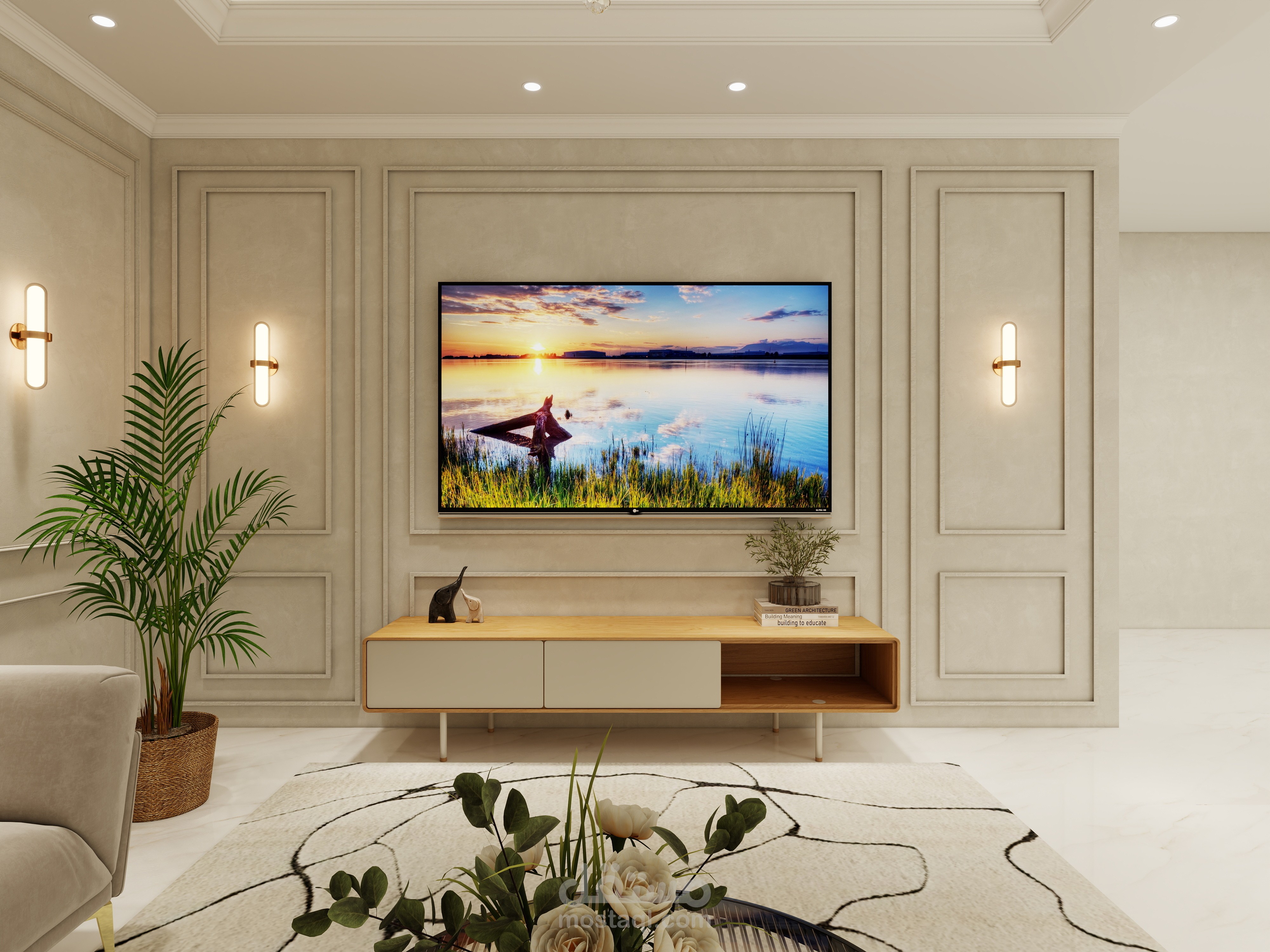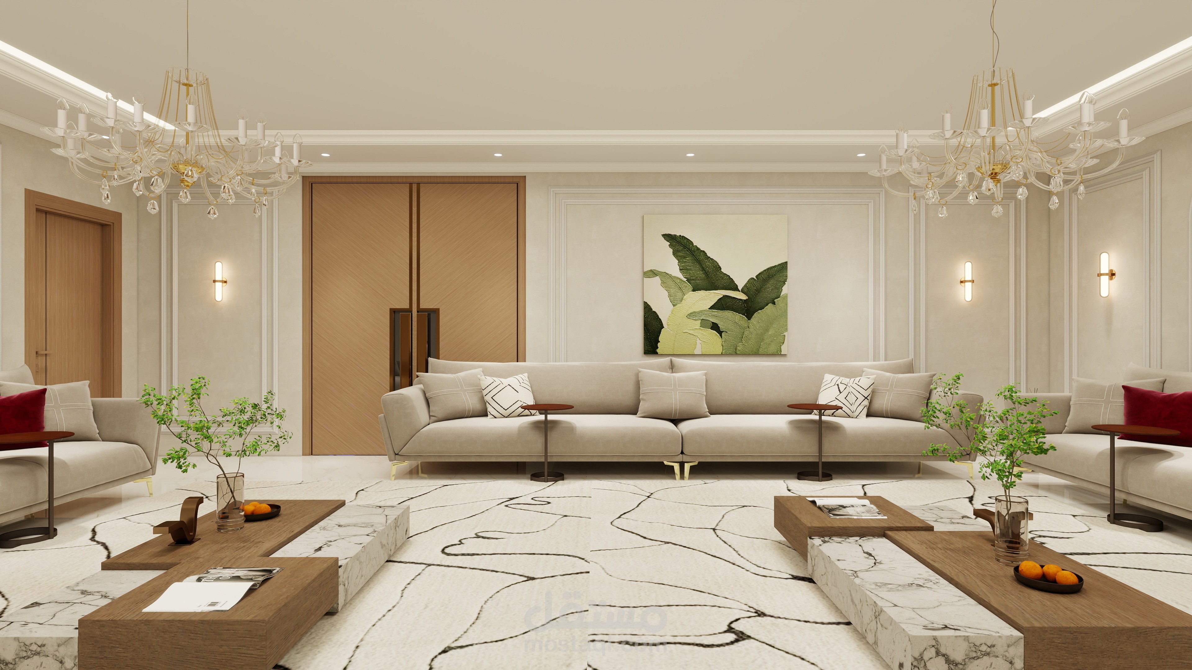 تم توزيع الإضاءة بعناية بين سبوتات مخفية في السقف مع نجفة مركزية أنيقة تعطي طابعًا رسميًا راقيًا، بالإضافة إلى إضاءة جانبية دافئة تعزز أجواء الراحة. الجدران تحتوي على بدائل خشب أو ألواح ديكورية مع مرايا أو لوحات فنية مختارة بعناية لإكمال المشهد العام.