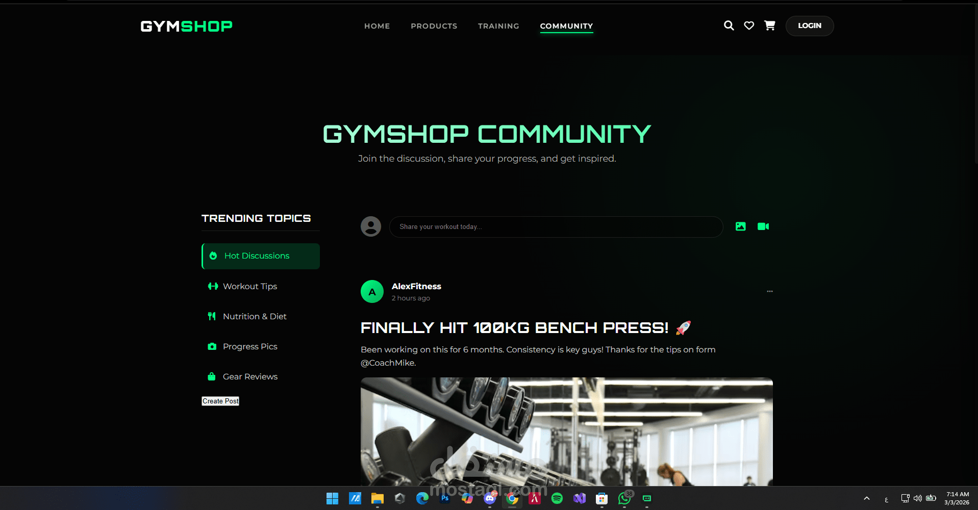 Gym-Shop هو مشروع ويب ستور (Online Store) متخصص في بيع منتجات الجيم واللياقة البدنية، مبني باستخدام Angular. الهدف منه توفير منصة حديثة وسريعة لعرض وبيع المكملات الغذائية، أدوات التمرين، وملابس الجيم.