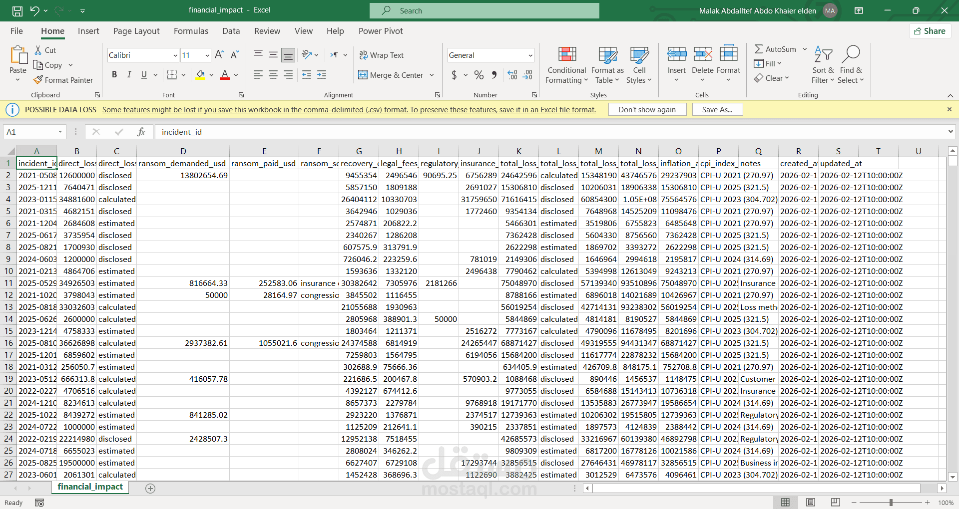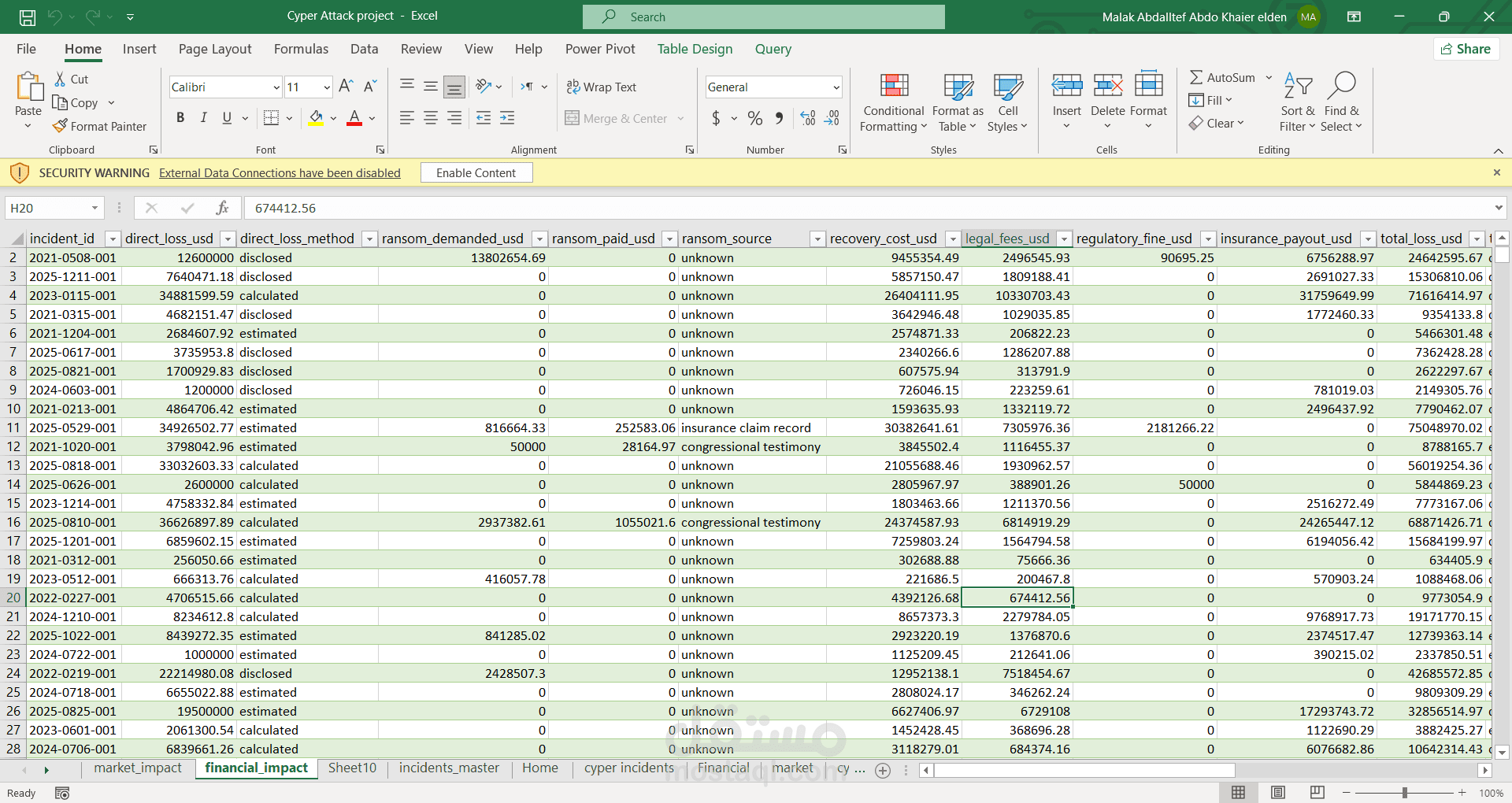بتنظيف ومعالجة بيانات الهجمات السيبرانية (Cyber Attacks) لضمان جودتها ودقتها قبل البدء في التحليل. شمل ذلك التعامل مع القيم المفقودة وملء البيانات الفارغة بالطرق المناسبة، إزالة التكرارات لضمان عدم تكرار السجلات، معالجة الفراغات والأخطاء الإملائية داخل النصوص، توحيد صيغ البيانات مثل التواريخ وأسماء الدول، وتحويل المتغيرات إلى التنسيقات الصحيحة لتسهيل التحليل. كما قمت بمراجعة الاتساق بين الأعمدة المختلفة والتأكد من جاهزية البيانات لبناء نموذج تحليلي دقيق واستخراج مؤشرات أداء واضحة تعكس واقع الهجمات السيبرانية وأنماطها