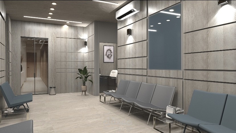 Comfortable seating complements the refined material palette, creating a calm and professional environment for patients.