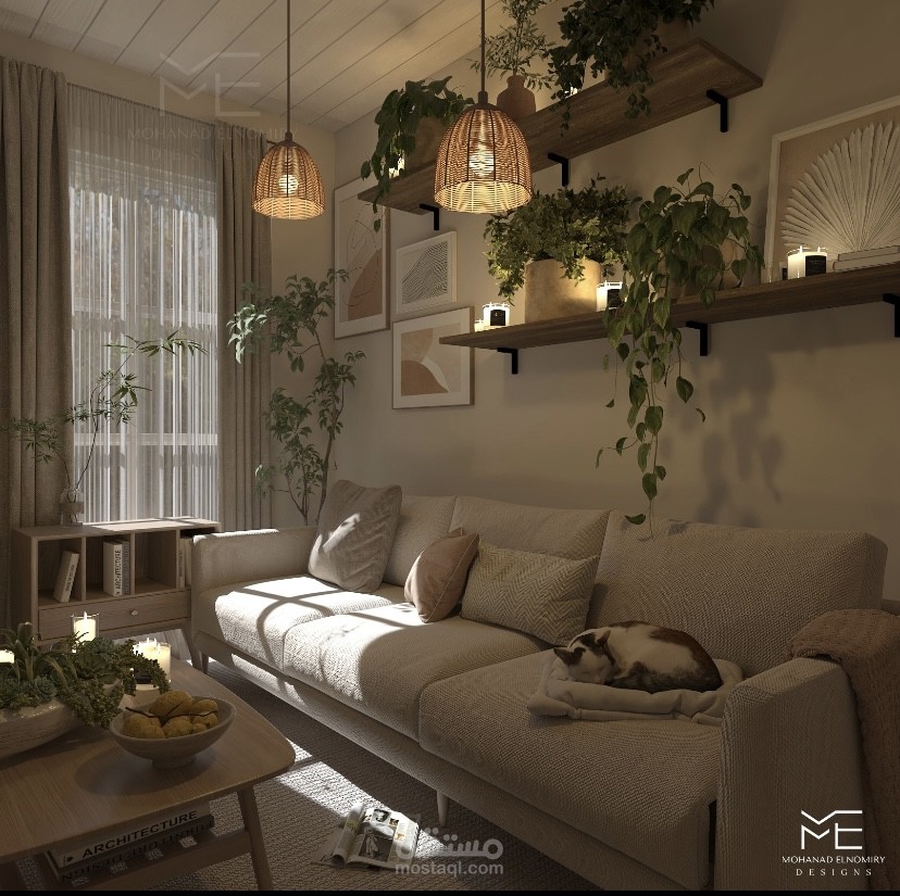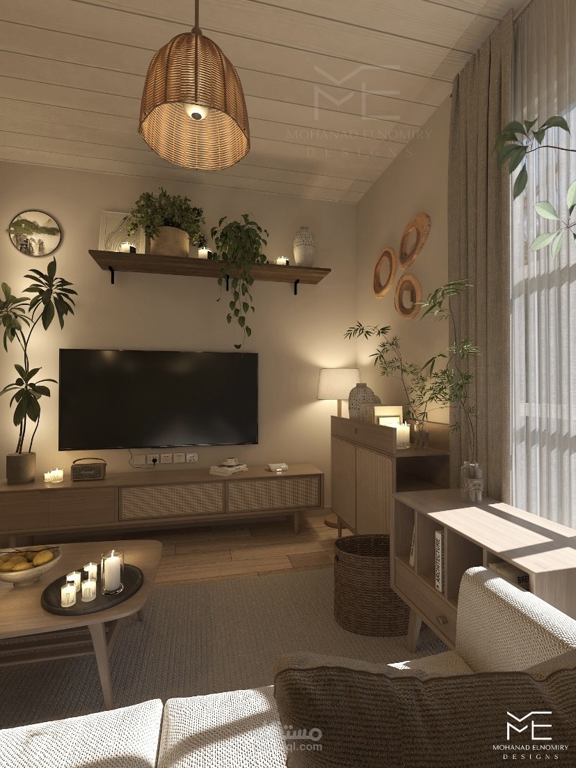 A cozy scandinavian interior designed with minimalism, warm wood textures , and indoor greenery to create a peaceful atmosphere.