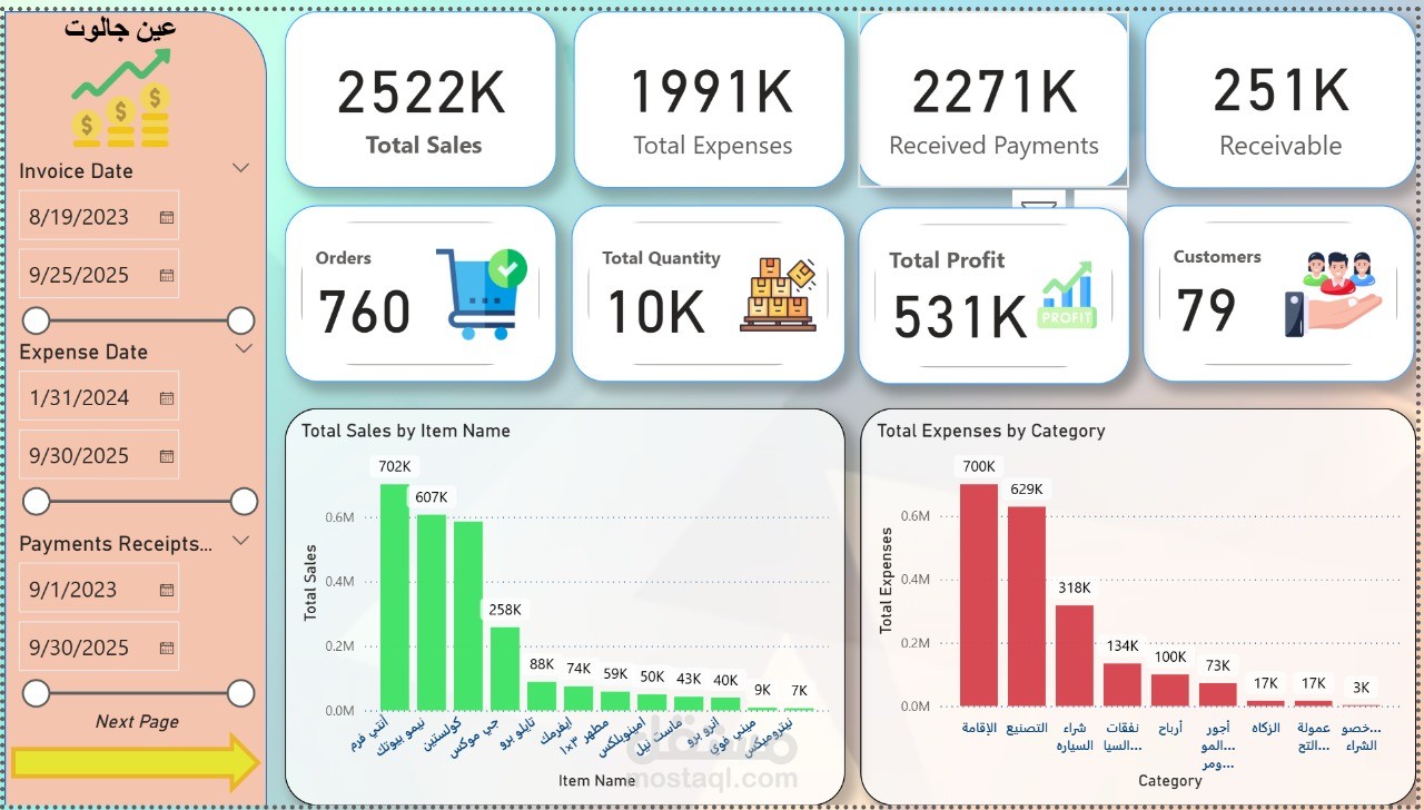 KPIs رئيسية (إجمالي المبيعات – إجمالي الربح – عدد الفواتير – عدد العملاء).