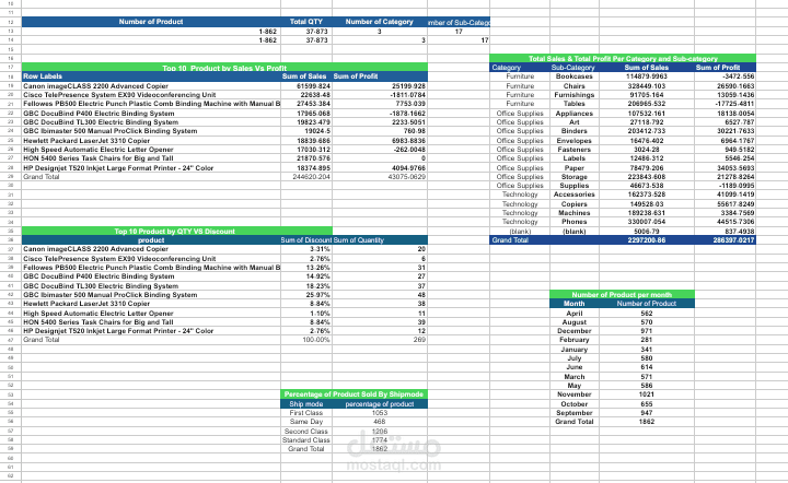 "الداشبورد التفاعلية دي معمولة مخصوص عشان نحلل أداء المنتجات بمختلف أنواعها وتصنيفاتها. ركزنا فيها على الأرقام الحيوية (الـ KPIs)، وعرضنا أكتر منتجات بتحقق مبيعات، وازاي الخصومات بتأثر على حركة البيع، وتوزيعه الشحنات ماشية ازاي، ده غير تتبع حركة المبيعات شهر بشهر.