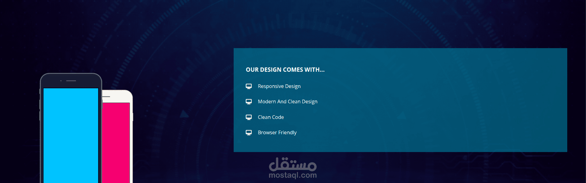 تم بناء الموقع باستخدام HTML و CSS مع الاهتمام بتنسيق العناصر بشكل منظم وتقديم تصميم عصري يناسب مختلف أنواع المشاريع.