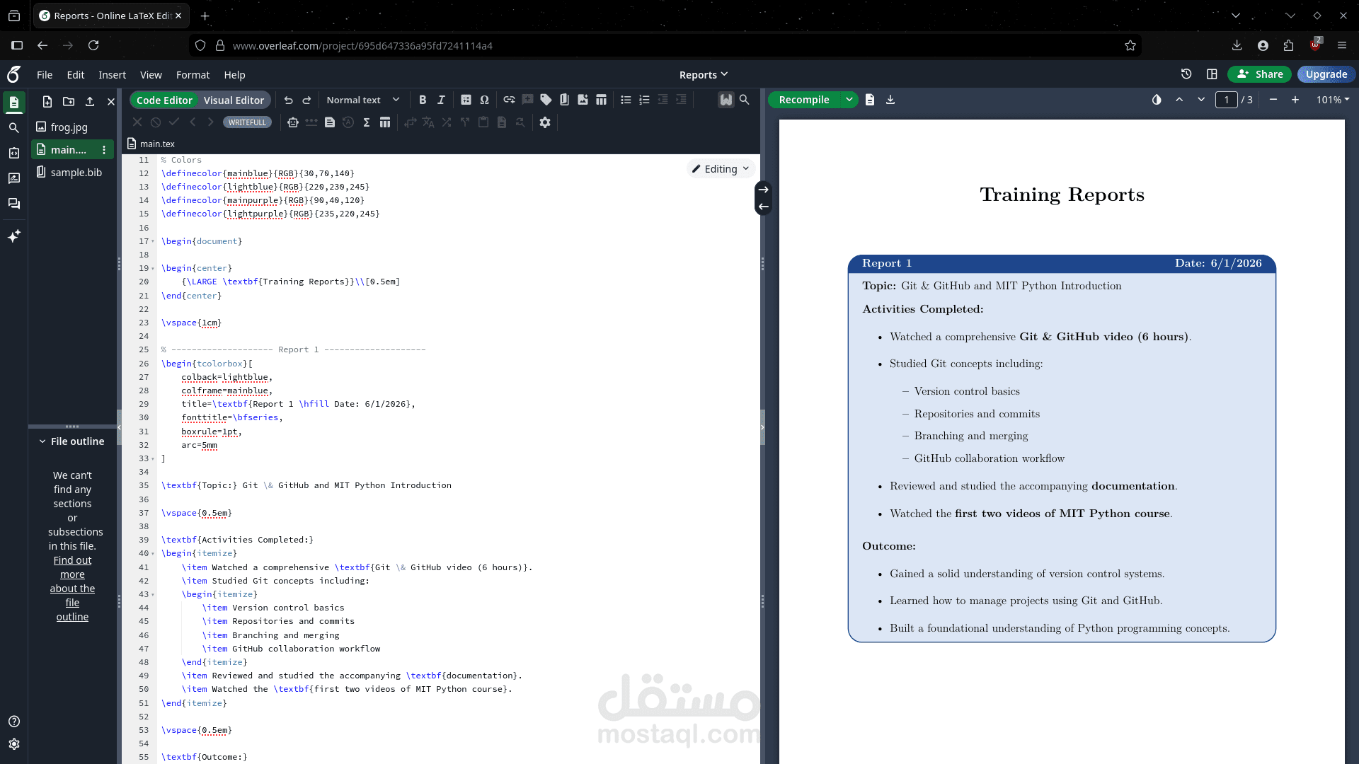 كما يمكنني إعداد فهرس محتويات تلقائي وتنظيم العناوين والفصول بطريقة واضحة، مع تسليم العمل في صورة ملف PDF جاهز للطباعة بالإضافة إلى ملف LaTeX المصدر (.tex) قابل للتعديل.