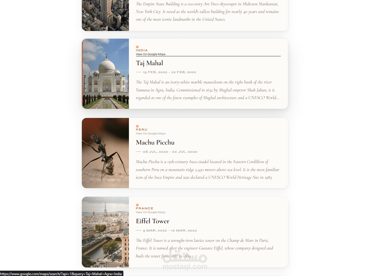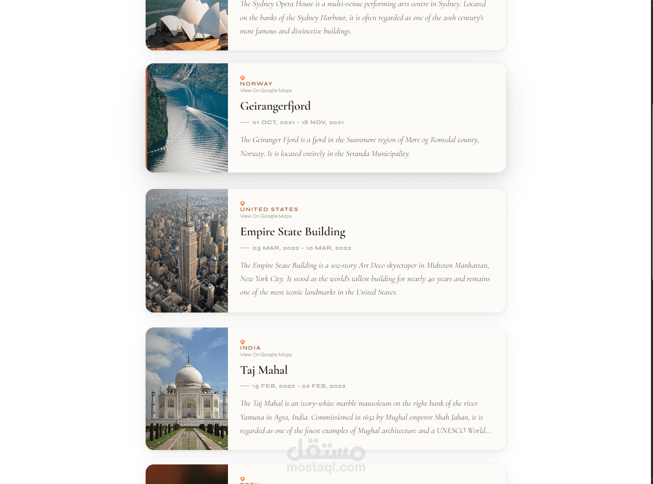 كل بطاقة تحتوي على صورة الوجهة، اسم الدولة، عنوان المكان، تاريخ الرحلة، وصف مختصر، مع رابط مباشر لعرض الموقع على Google Maps.