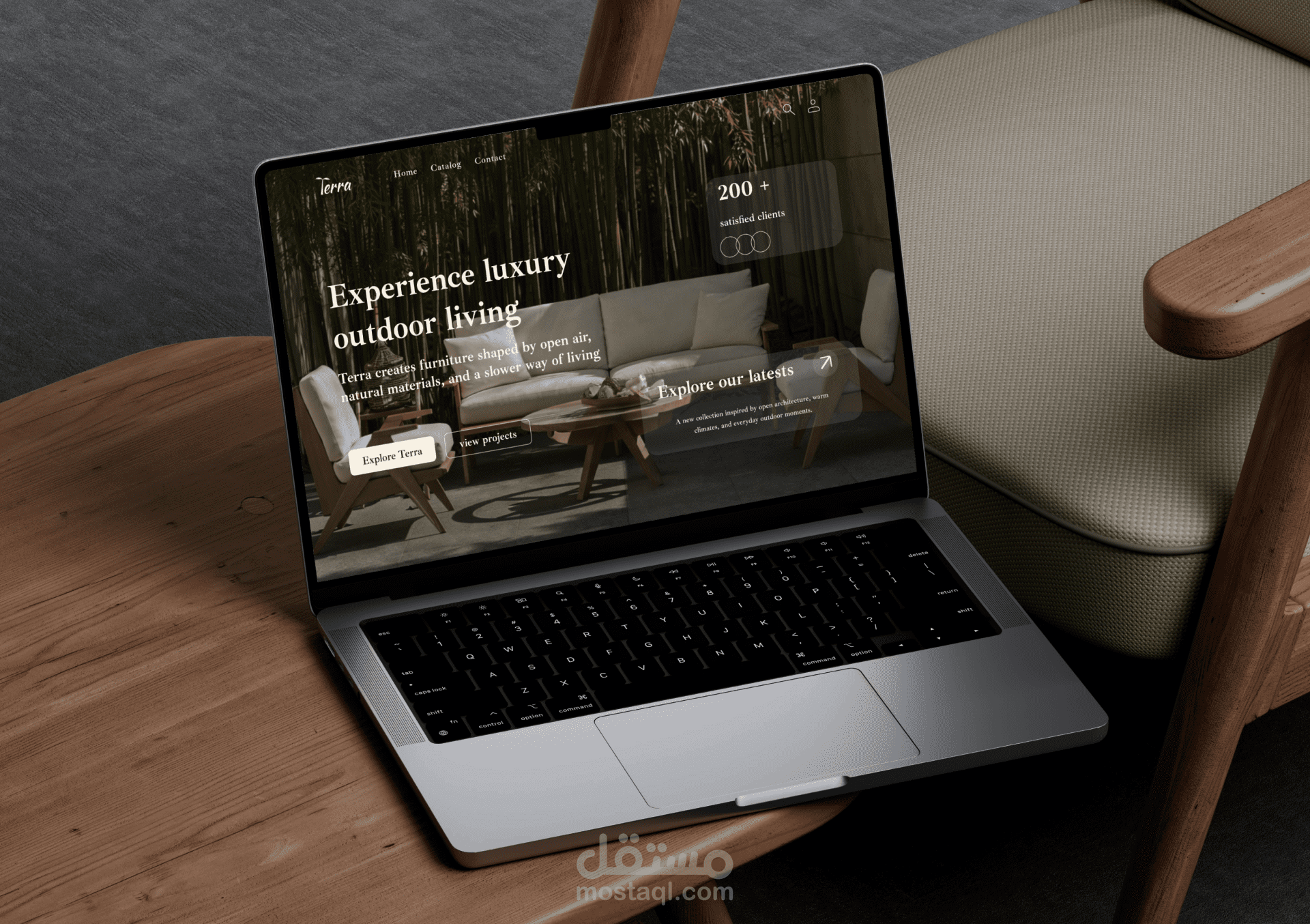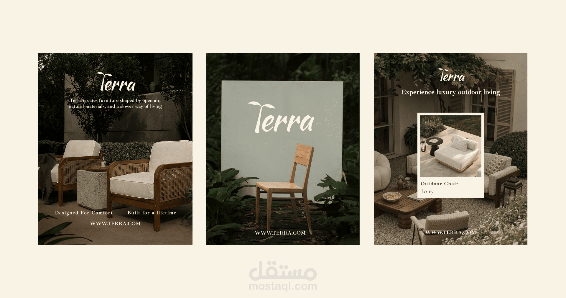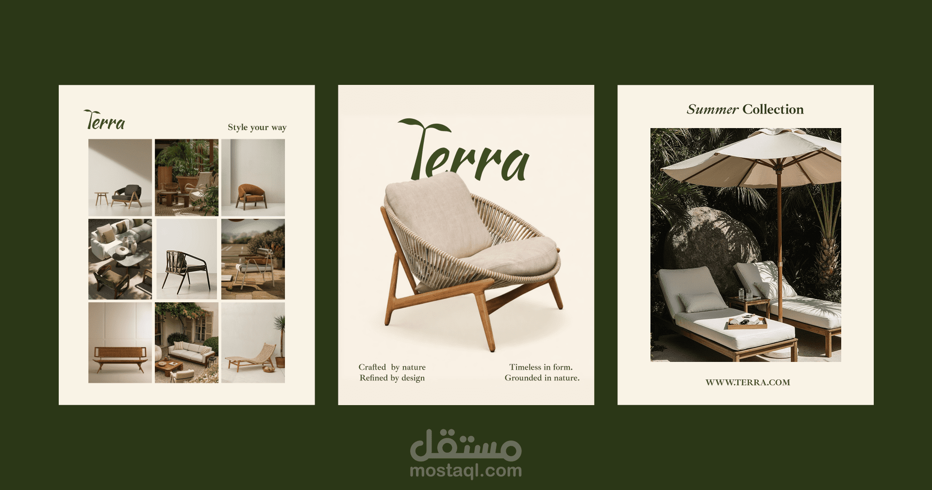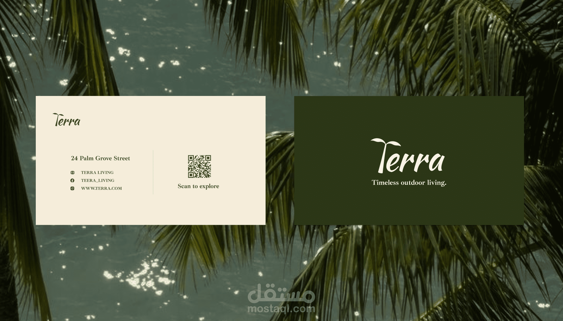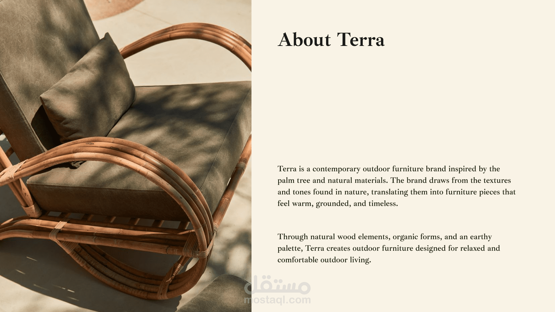 Terra is a brand identity project for an outdoor furniture brand inspired by the palm tree and natural materials. The concept focuses on translating the structure and textures of the palm tree into a visual language expressed through natural wood elements and an earthy color palette.
